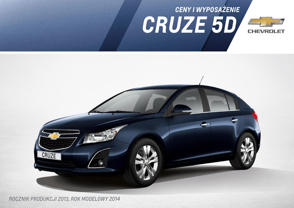 CENY I WYPOSAŻENIE CRUZE 5D ROCZNIK PRODUKCJI 2013, ROK MODELOWY 2014 CENY CENNIKOWE LS CENA PRZYSTOSOWANIE DO INSTALACJI LPG 117 KM 1.6 MT5 LS+ MOC MAKSYMALNA 49 490 zł - 1.6 MT5 117 KM 53 490 zł - 1.8 MT5 141 KM 55 990 zł w standardzie LT 1.4T MT6 140 KM 63 490 zł 1.6 MT5 117 KM 57 490 zł - 1.8 MT5 141 KM 59 990 zł w standardzie 2.0D MT6 163 KM 67 490 zł - LT+ - 1.4T MT6 140 KM 67 390 zł 1.6 MT5 117 KM 61 390 zł - 1.8 MT5 141 KM 63 890 zł w standardzie 1.7D MT6 130 KM 71 390 zł - 2.0D MT6 163 KM 71 390 zł - LTZ - 1.4T MT6 140 KM 71 390 zł 1.4T AT6 140 KM 76 890 zł - 1.8 MT5 141 KM 67 890 zł w standardzie 2.0D MT6 163 KM 75 390 zł - 2.0D AT6 163 KM 80 890 zł - ELEMENTY WYPOSAŻENIA LS SILNIKI BEZPIECZEŃSTWO LS+ 1.6 MT5 LT 1.6 MT5 \ 1.8 MT5 - 1.4T MT6 \ 1.6 MT5 \ 1.8 MT5 \ 2.0D MT6 LT+ 1.4T MT6 \ 1.6 MT5 \ 1.8 MT5 \ 1.7D MT6 \ 2.0D MT6 LTZ 1.4T MT6 \ 1.4T AT6 \ 1.8 MT5 \ 2.0D MT6 \ 2.0D AT6 System odłączania pedałów podczas kolizji ● ● ● ● ● System kontroli trakcji (TCS) ● ● ● ● ● System stabilizacji toru jazdy (ESC) ● ● ● ● ● 6 poduszek powietrznych ● ● ● ● ● ABS ● ● ● ● ● 3 punktowe pasy bezpieczeństwa z tyłu ● ● ● ● ● 3 tylne zagłówki ● ● ● ● ● System ISOFIX do mocowania fotelika dziecięcego ● ● ● ● ● Zabezpieczenie tylnych drzwi przed otwarciem przez dzieci ● ● ● ● ● Wyłącznik poduszki powietrznej pasażera ● ● ● ● ● Przednie reflektory przeciwmgielne ─ ─ ● ● ● ● seryjnie ─ niedostępny (AT) Automatyczna skrzynia biegów (MT) Manualna skrzynia biegów data publikacji 16.12.2013 2 ELEMENTY WYPOSAŻENIA LS SILNIKI LS+ 1.6 MT5 LT 1.6 MT5 \ 1.8 MT5 1.4T MT6 \ 1.6 MT5 \ 1.8 MT5 \ 2.0D MT6 LT+ 1.4T MT6 \ 1.6 MT5 \ 1.8 MT5 \ 1.7D MT6 \ 2.0D MT6 LTZ 1.4T MT6 \ 1.4T AT6 \ 1.8 MT5 \ 2.0D MT6 \ 2.0D AT6 Czujniki parkowania z tyłu ─ ─ ● ● ● Układ wspomagania nagłego hamowania (HBA) ● ● ● ● ● Przednie pasy bezpieczeństwa z regulacją wysokości ● ● ● ● ● Kontrolka ostrzegająca o niezapiętych pasach bezpieczeństwa z przodu ● ● ● ● ● Czujnik martwego punktu w lusterkach ─ ─ ─ ─ 600 zł System kontroli ciśnienia w kołach ● ● ● ● ● ERGONOMIA WNĘTRZA 6-kierunkowa manualna regulacja fotela kierowcy ● ● ● ● ● 6-kierunkowa manualna regulacja fotela pasażera z przodu ● ● ● ● ● Oparcie tylnej kanapy składane w proporcji 60/40 ● ● ● ● ● FUNKCJONALNOŚĆ Elektryczne szyby z przodu z funkcją szybkiego otwierania ● ● ─ ─ ─ Elektrycznie otwierane szyby z przodu i z tyłu ─ ─ ● ● ● Funkcja szybkiego otwierania/zamykania szyby kierowcy i pasażera ─ ─ ● ● ● Zdalnie sterowany zamek centralny ● ● ● ● ● Pionowa regulacja kolumny kierownicy ● ● ─ ─ ─ Regulacja kolumny kierownicy w dwóch płaszczyznach ─ ─ ● ● ● Składany kluczyk ● ● ● ● ● Tempomat ─ ─ ● ● ● Wycieraczka tylnej szyby ● ● ● ● ● System START/STOP ─ ─ ●\─\─\─ ●\─\─\●\─ ●\─\─\─\─ Czujnik deszczu ─ ─ ─ ─ ● WYPOSAŻENIE WNĘTRZA Komputer pokładowy ● ● ● ● ● Komputer - informacja o trybie Eco ─ ─ ●\─\─\─ ●\─\─\●\─ ●\─\─\─\─ Skórzana kierownica ─ ─ ● ● ● Elektrochromatyczne lusterko wewnętrzne ─ ─ ─ ─ ● Osłony przeciwsłoneczne z podświetlanym lusterkiem po stronie kierowcy i pasażera ─ ─ ● ● ● Miejsce na butelkę w drzwiach przednich ● ● ● ● ● Gniazdo 12V w bagażniku ● ● ● ● ● Gałka zmiany biegów pokryta skórą ─ ─ ● ● ● Siatka w bagażniku ─ ─ ─ ─ ● Podłokietnik środkowy ze schowkiem ─ ─ ● ● ● Podłokietnik tylny z uchwytem na kubki ● ● ● ● ● Lampka pokładowa ● ● ● ● ● Uchwyt na napoje tylni ● ● ● ● ● Osłony przeciwsłoneczne z lusterkiem po stronie kierowcy i pasażera ● ● ─ ─ ─ Lampka w bagażniku ● ● ● ● ● Uchwyty na napoje z przodu ● ● ● ● ● ● seryjnie ─ niedostępny (AT) Automatyczna skrzynia biegów (MT) Manualna skrzynia biegów data publikacji 16.12.2013 3 ELEMENTY WYPOSAŻENIA LS SILNIKI KLIMATYZACJA / OGRZEWANIE LS+ 1.6 MT5 LT 1.6 MT5 \ 1.8 MT5 1.4T MT6 \ 1.6 MT5 \ 1.8 MT5 \ 2.0D MT6 LT+ 1.4T MT6 \ 1.6 MT5 \ 1.8 MT5 \ 1.7D MT6 \ 2.0D MT6 LTZ 1.4T MT6 \ 1.4T AT6 \ 1.8 MT5 \ 2.0D MT6 \ 2.0D AT6 Klimatyzacja manualna ─ ● ● ─ ─ Klimatyzacja automatyczna ─ ─ ─ ● ● Tylny nawiew na nogi ● ● ● ● ● WYPOSAŻENIE ZEWNĘTRZNE Manualnie regulowane lusterka zewnętrzne Elektrycznie regulowane, podgrzewane lusterka zewnętrzne z zintegrowanymi kierunkowskazami LED Elektrycznie regulowane, podgrzewane lusterka zewnętrzne z zintegrowanymi kierunkowskazami LED Elektrycznie regulowane, podgrzewane lusterka zewnętrzne z zintegrowanymi kierunkowskazami LED Klamki zewnętrzne czarne ● ─ ─ ─ Elektrycznie regulowane, podgrzewane lusterka zewnętrzne z zintegrowanymi kierunkowskazami LED (składane elektrycznie) ─ Klamki w kolorze nadwozia ─ ● ● ● ● Klamka bagażnika w kolorze nadwozia ● ● ● ● ● Lusterka zewnętrzne w kolorze nadwozia ─ ● ● ● ● Czujnik światła ─ ─ ─ ─ ● Chromowane wykończenie w linii okien ─ ─ ─ ─ ● Elektryczny szyberdach ─ ─ ─ \ 3 000 zł \ 3 000 zł \ 3 000 zł ─ \ 3 000 zł \ ─ \ 3 000 zł \ 3 000 zł 3 000 zł Lusterka Przedni grill z chromowanymi elementami wykończenia Lakier metalizowany ZABEZPIECZENIA PRZECIWKRADZIEŻOWE ─ ─ ● ● ● 1 900 zł 1 900 zł 1 900 zł 1 900 zł 1 900 zł \ 1 900 zł \ ─ \ 1 900 zł \ 1 900 zł Alarm antywłamaniowy ● ● ● ● ● Immobilizer ● ● ● ● ● KOŁA 16" stalowe z kołpakami ● ● ● ─ ─ 16" felgi ze stopów lekkich ─ ─ 1 200 zł ● ─ 17" felgi ze stopów lekkich ─ ─ ─ ─ ● 17" czarne felgi ze sto