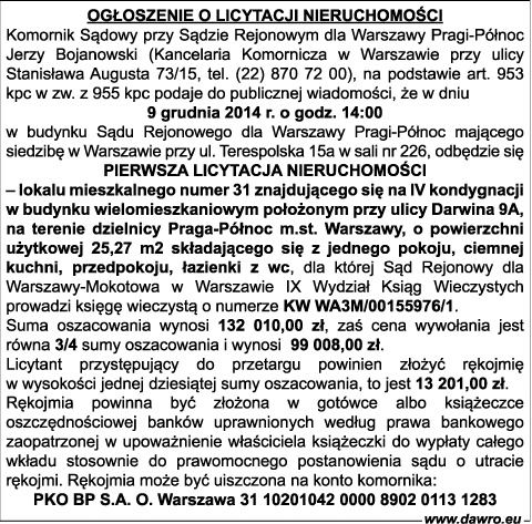 OGŁOSZENIE O LICYTACJI NIERUCHOMOŚCI Komornik Sądowy przy Sądzie Rejonowym dla Warszawy Pragi-Północ Jerzy Bojanowski (Kancelaria Komornicza w Warszawie przy ulicy Stanisława Augusta 73/15, tel. (22) 870 72 00), na podstawie art. 953 kpc w zw. z 955 kpc podaje do publicznej wiadomości, że w dniu 9 grudnia 2014 r. o godz. 14:00 w budynku Sądu Rejonowego dla Warszawy Pragi-Północ mającego siedzibę w Warszawie przy ul. Terespolska 15a w sali nr 226, odbędzie się PIERWSZA LICYTACJA NIERUCHOMOŚCI – lokalu mieszkalnego numer 31 znajdującego się na IV kondygnacji w budynku wielomieszkaniowym położonym przy ulicy Darwina 9A, na terenie dzielnicy Praga-Północ m.st. Warszawy, o powierzchni użytkowej 25,27 m2 składającego się z jednego pokoju, ciemnej kuchni, przedpokoju, łazienki z wc, dla której Sąd Rejonowy dla WarszawyMokotowa w Warszawie IX Wydział Ksiąg Wieczystych prowadzi księgę wieczystą o numerze KW WA3M/00155976/1. Suma oszacowania wynosi 132 010,00 zł, zaś cena wywołania jest równa 3/4 sumy oszacowania i wynosi 99 008,00 zł. Licytant przystępujący do przetargu powinien złożyć rękojmię w wysokości jednej dziesiątej sumy oszacowania, to jest 13 201,00 zł. Rękojmia powinna być złożona w gotówce albo książeczce oszczędnościowej banków uprawnionych według prawa bankowego zaopatrzonej w upoważnienie właściciela książeczki do wypłaty całego wkładu stosownie do prawomocnego postanowienia sądu o utracie rękojmi. Rękojmia może być uiszczona na konto komornika: PKO BP S.A. O. Warszawa 31 10201042 0000 8902 0113 1283