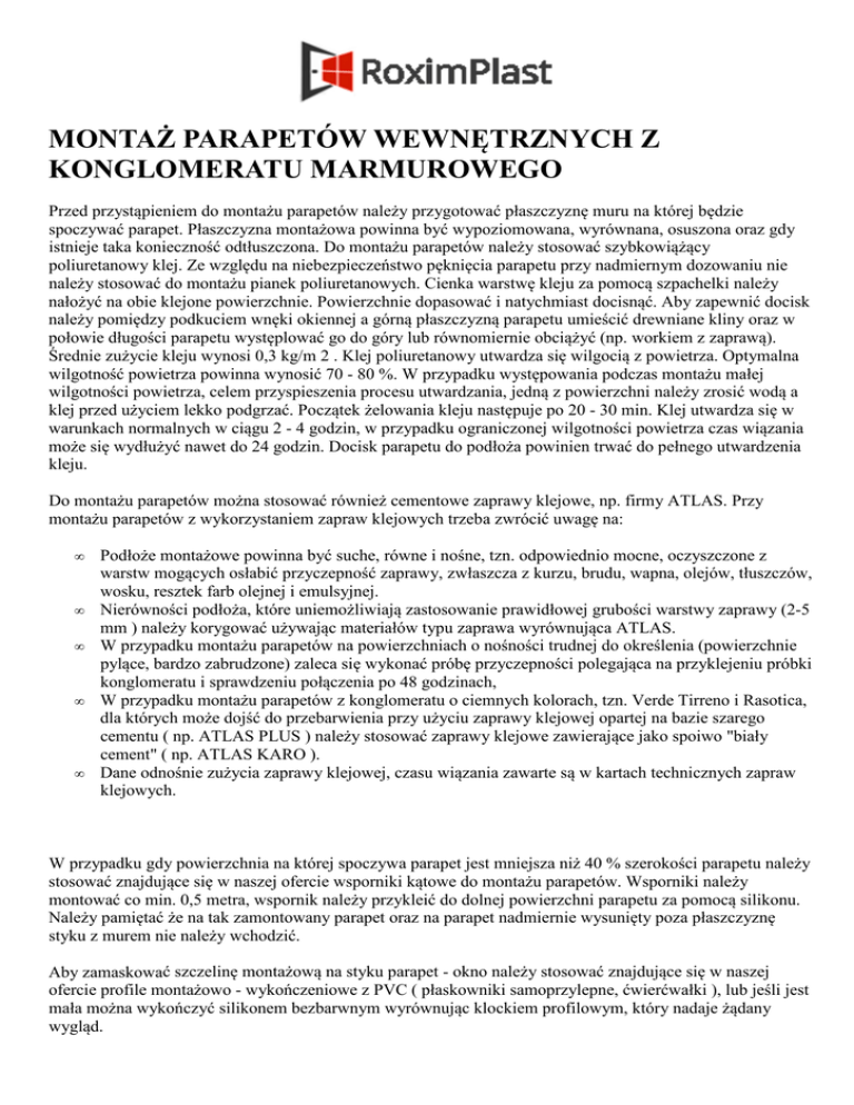 MONTAŻ PARAPETÓW WEWNĘTRZNYCH Z KONGLOMERATU MARMUROWEGO Przed przystąpieniem do montażu parapetów należy przygotować płaszczyznę muru na której będzie spoczywać parapet. Płaszczyzna montażowa powinna być wypoziomowana, wyrównana, osuszona oraz gdy istnieje taka konieczność odtłuszczona. Do montażu parapetów należy stosować szybkowiążący poliuretanowy klej. Ze względu na niebezpieczeństwo pęknięcia parapetu przy nadmiernym dozowaniu nie należy stosować do montażu pianek poliuretanowych. Cienka warstwę kleju za pomocą szpachelki należy nałożyć na obie klejone powierzchnie. Powierzchnie dopasować i natychmiast docisnąć. Aby zapewnić docisk należy pomiędzy podkuciem wnęki okiennej a górną płaszczyzną parapetu umieścić drewniane kliny oraz w połowie długości parapetu występlować go do góry lub równomiernie obciążyć (np. workiem z zaprawą). Średnie zużycie kleju wynosi 0,3 kg/m 2 . Klej poliuretanowy utwardza się wilgocią z powietrza. Optymalna wilgotność powietrza powinna wynosić 70 - 80 %. W przypadku występowania podczas montażu małej wilgotności powietrza, celem przyspieszenia procesu utwardzania, jedną z powierzchni należy zrosić wodą a klej przed użyciem lekko podgrzać. Początek żelowania kleju następuje po 20 - 30 min. Klej utwardza się w warunkach normalnych w ciągu 2 - 4 godzin, w przypadku ograniczonej wilgotności powietrza czas wiązania może się wydłużyć nawet do 24 godzin. Docisk parapetu do podłoża powinien trwać do pełnego utwardzenia kleju. Do montażu parapetów można stosować również cementowe zaprawy klejowe, np. firmy ATLAS. Przy montażu parapetów z wykorzystaniem zapraw klejowych trzeba zwrócić uwagę na: • • • • • Podłoże montażowe powinna być suche, równe i nośne, tzn. odpowiednio mocne, oczyszczone z warstw mogących osłabić przyczepność zaprawy, zwłaszcza z kurzu, brudu, wapna, olejów, tłuszczów, wosku, resztek farb olejnej i emulsyjnej. Nierówności podłoża, które uniemożliwiają zastosowanie prawidłowej grubości warstwy zaprawy (2-5 mm ) należy korygować używając materiałów typu zaprawa wyrównująca ATLAS. W przypadku montażu parapetów na powierzchniach o nośności trudnej do określenia (powierzchnie pylące, bardzo zabrudzone) zaleca się wykonać próbę przyczepności polegająca na przyklejeniu próbki konglomeratu i sprawdzeniu połączenia po 48 godzinach, W przypadku montażu parapetów z konglomeratu o ciemnych kolorach, tzn. Verde Tirreno i Rasotica, dla których może dojść do przebarwienia przy użyciu zaprawy klejowej opartej na bazie szarego cementu ( np. ATLAS PLUS ) należy stosować zaprawy klejowe zawierające jako spoiwo "biały cement" ( np. ATLAS KARO ). Dane odnośnie zużycia zaprawy klejowej, czasu wiązania zawarte są w kartach technicznych zapraw klejowych. W przypadku gdy powierzchnia na której spoczywa parapet jest mniejsza niż 40 % szerokości parapetu należy stosować znajdujące się w naszej ofercie wsporniki kątowe do montażu parapetów. Wsporniki należy montować co min. 0,5 metra, wspornik należy przykleić do dolnej powierzchni parapetu za pomocą silikonu. Należy pamiętać że na tak zamontowany parapet oraz na parapet nadmiernie wysunięty poza płaszczyznę styku z murem nie należy wchodzić. Aby zamaskować szczelinę montażową na styku parapet - okno należy stosować znajdujące się w naszej ofercie profile montażowo - wykończeniowe z PVC ( płaskowniki samoprzylepne, ćwierćwałki ), lub jeśli jest mała można wykończyć silikonem bezbarwnym wyrównując klockiem profilowym, który nadaje żądany wygląd.