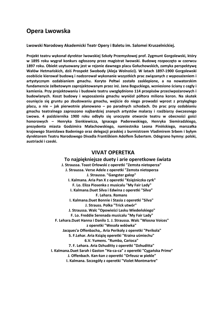 Opera Lwowska Lwowski Narodowy Akademicki Teatr Opery i Baletu im. Salomei Kruszelnickiej. Projekt teatru wykonał dyrektor lwowskiej Szkoły Przemysłowej prof. Zygmunt Gorgolewski, który w 1895 roku wygrał konkurs ogłoszony przez magistrat lwowski. Budowę rozpoczęto w czerwcu 1897 roku. Obiekt usytuowany jest w rejonie dawnego placu Gołuchowskich, zamyka perspektywę Wałów Hetmańskich, dziś Prospekt Swobody (Aleja Wolności). W latach 1897-1900 Gorgolewski osobiście kierował budową i nadzorował wykonanie wszystkich prac związanych z wyposażeniem i artystycznym ozdabianiem gmachu. Koryto Pełtwi zostało zasklepione, a na nowatorskim fundamencie żelbetowym zaprojektowanym przez inż. Jana Boguckiego, wzniesiono ściany z cegły i kamienia. Przy projektowaniu i budowie teatru uwzględniono 114 przepisów przeciwpożarowych i budowlanych. Koszt budowy i wyposażenia gmachu wyniósł półtora miliona koron. Na skutek osunięcia się gruntu po zbudowaniu gmachu, wejście do niego prowadzi wprost z przyległego placu, a nie – jak pierwotnie planowano – po paradnych schodach. Do prac przy ozdabianiu gmachu teatralnego zaproszono najbardziej znanych artystów malarzy i rzeźbiarzy ówczesnego Lwowa. 4 października 1900 roku odbyło się uroczyste otwarcie teatru w obecności gości honorowych – Henryka Sienkiewicza, Ignacego Paderewskiego, Henryka Siemiradzkiego, prezydenta miasta Godzimira Małachowskiego, namiestnika Leona Pinińskiego, marszałka krajowego Stanisława Badeniego oraz delegacji praskiej z burmistrzem Vladimirem Srbem i byłym dyrektorem Teatru Narodowego Divadla Františkiem Adolfem Šubertem. Odegrano hymny: polski, austriacki i czeski. VIVAT OPERETKA To najpiękniejsze duety i arie operetkowe świata J. Straussa. Toast Orłowski z operetki "Zemsta nietoperza" J. Straussa. Verse Adele z operetki "Zemsta nietoperza J. Straussa. "Gangster galop" I. Kalmana. Aria Pan X z operetki "Księżniczka cyrk" F. Lo. Eliza Piosenka z musicalu "My Fair Lady" I. Kalmana.Duet Silva i Edwina z operetki "Silva” F. Lehara. Romans I. Kalmana.Duet Bonnie i Stasia z operetki "Silva" J. Strauss. Polka "Trick utwór" J. Straussa. Walc "Opowieści Lasku Wiedeńskiego" F. Lo. Freddie Serenada musicalu "My Fair Lady" F. Lehara.Duet Hanna i Danilo 1. J. Straussa. Walc "Wiosna Voices" z operetki "Wesoła wdówka" Jacques'a Offenbacha,. Aria Perikoly z operetki "Perikola" 5. F.Lehar. Aria Książę operetki "Kraina uśmiechu" 6.V. Yumens. "Rumba, Carioca" 7. F. Lehara. Aria Dzhuditty z operetki "Dzhuditta" I. Kalmana.Duet Sarah i Gaston "Ha-ca-ca" z operetki "Cygańska Prime" J. Offenbach. Kan-kan z operetki "Orfeusz w piekle" I. Kalmana. Szczegóły z operetki "Violet Montmartre"