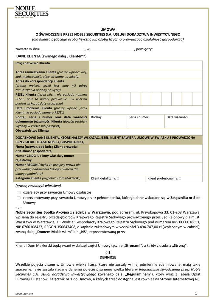 UMOWA O ŚWIADCZENIE PRZEZ NOBLE SECURITIES S.A. USŁUGI DORADZTWA INWESTYCYJNEGO (dla Klienta będącego osobą fizyczną lub osobą fizyczną prowadzącą działalność gospodarczą) zawarta w dniu ______________________, w ______________________, pomiędzy: DANE KLIENTA (zwanego dalej „Klientem”): Imię i nazwisko Klienta Adres zamieszkania Klienta (proszę wpisać: kraj, kod, miejscowość, ulica, nr domu, nr lokalu) Adres do korespondencji Klienta (proszę wpisać, jeżeli jest inny niż adres zamieszkania podany powyżej) PESEL Klienta (jeżeli Klient nie posiada numeru PESEL, pole to należy przekreślić i w wierszu poniżej wskazać datę urodzenia) Data urodzenia Klienta (proszę wpisać, jeżeli Klient nie posiada numeru PESEL) Rodzaj, seria i numer oraz data ważności dokumentu tożsamości Klienta (dowód osobisty wydany w Polsce lub paszport) Obywatelstwo Klienta Rodzaj: Seria i numer: Data ważności: DODATKOWE DANE KLIENTA, KTÓRE NALEŻY WSKAZAĆ, JEŻELI KLIENT ZAWIERA UMOWĘ W ZWIĄZKU Z PROWADZONĄ PRZEZ SIEBIE DZIAŁALNOŚCIĄ GOSPODARCZĄ Firma (nazwa), pod którą Klient prowadzi działalność gospodarczą Numer CEIDG lub inny właściwy numer rejestrowy Numer REGON (chyba że przepisy prawa nie przewidują nadawania takiego numeru dla danego podmiotu) Kategoria Klienta (wypełnia Dom Maklerski) Klient detaliczny: Klient profesjonalny: (proszę zaznaczyć właściwe) działający przy zawarciu Umowy osobiście reprezentowany przy zawarciu Umowy przez pełnomocnika, którego dane wskazane są w Załączniku nr 5 do Umowy -aNoble Securities Spółka Akcyjna z siedzibą w Warszawie, pod adresem: ul. Przyokopowa 33, 01-208 Warszawa, wpisaną do rejestru przedsiębiorców Krajowego Rejestru Sądowego prowadzonego przez Sąd Rejonowy dla m. st. Warszawy w Warszawie, XII Wydział Gospodarczy Krajowego Rejestru Sądowego pod numerem KRS 0000018651, NIP 6760108427, REGON 350647408, o kapitale zakładowym w wysokości 3.494.747,00 zł (wpłaconym w całości), zwaną dalej „Domem Maklerskim” lub „NS”, reprezentowaną przez: __________________________________________ Klient i Dom Maklerski będą zwani w dalszej części Umowy łącznie „Stronami”, a każdy z osobna „Stroną”. §1 DEFINICJE Wszelkie pojęcia pisane w Umowie wielką literą, które nie zostały w niej odmiennie zdefiniowane, mają takie znaczenie, jakie zostało nadane danemu pojęciu pisanemu wielką literą w Regulaminie świadczenia przez Noble Securities S.A. usługi doradztwa inwestycyjnego (zwanego dalej „Regulaminem”), który wraz z Tabelą Opłat i Prowizji DI stanowi Załącznik nr 1 do Umowy, a których treść dostępna jest również na Stronie Internetowej NS. DI.UOF.2015.77.1 1 W przypadku rozbieżności pomiędzy definicją danego pojęcia nadaną w Umowie a definicją tego samego pojęcia przyjętą w Regulaminie, decydujące znaczenie ma definicja danego pojęcia zamieszczona w Umowie. §2 PRZEDMIOT UMOWY 1. Na podstawie Umowy oraz na warunkach w niej określonych, Klient zleca Domowi Maklerskiemu, a Dom Maklerski przyjmuje zlecenie i zobowiązuje się względem Klienta do świadczenia na jego rzecz usługi doradztwa inwestycyjnego (dalej „Usługa Doradztwa Inwestycyjnego”) polegającej na sporządzaniu - przy uwzględnieniu indywidualnej sytuacji Klienta – i przekazywaniu Klientowi, rekomendacji (dalej „Rekomendacja”) dotyczącej: 1) kupna, sprzedaży, subskrypcji, wymiany, wykonania lub wykupu określonych IF albo powstrzymania się od zawarcia transakcji dotyczącej tych instrumentów, 2) wykonania lub powstrzymania się od wykonania uprawnień wynikających z określonych IF do zakupu, sprzedaży lub subskrypcji, wymiany, wykonania lub wykupu IF. 2. Rekomendacje są sporządzane w formie pisemnej lub ustnej, lub w postaci elektronicznej. 3. Tryb i szczegółowe warunki świadczenia Usługi Doradztwa Inwestycyjnego przez Dom Maklerski określone są w Regulaminie, który stanowi integralną część Umowy. 4. Usługa Doradztwa Inwestycyjnego będzie świadczona przez Dom Maklerski na rzecz Klienta zgodnie ze strategią inwestycyjną ustaloną przez Strony w oparciu o Test odpowiedniości Klienta przeprowadzony przez Dom Maklerski z Klientem przed zawarciem Umowy, który stanowi Załącznik nr 2 do Umowy. Strategia inwestycyjna, o której mowa w zdaniu poprzednim, nie może cechować się wyższym poziomem ryzyka inwestycyjnego, aniżeli wynika to z Testu odpowiedniości Klienta. Opis strategii inwestycyjnej ustalonej przez Strony stanowi Załącznik nr 3 do Umowy. 5. W celu usprawnienia obsługi Klienta w zakresie Usługi Doradztwa Inwestycyjnego, Dom Maklerski niniejszym wyznacza Pracownika NS określonego w Załączniku nr 4 do Umowy jako Opiekuna Klienta DI. Opiekun Klienta DI jest osobą właściwą do kontaktu w bieżących sprawach związanych z Umową oraz Usługą Doradztwa Inwestycyjnego. Dane Opiekuna Klienta DI, w tym dane do kontaktu z Opiekunem Klienta DI, określone są w Załączniku nr 4 do Umowy. W sprawach dotyczących Umowy lub Usługi Doradztwa Inwestycyjnego, Klient (lub odpowiednio pełnomocnik Klienta) zobowiązany jest kontaktować się w pierwszej kolejności z Opiekunem Klienta DI. §3 SPORZĄDZANIE I PRZEKAZYWANIE REKOMENDACJI 1. Sporządzanie i przekazywanie Rekomendacji przez Dom Maklerski następuje na zasadach określonych w Regulaminie. 2. Przekazywanie Klientowi Rekomendacji telefonicznie będzie odbywać się na numer telefonu wskazany przez Klienta w Umowie o świadczenie usług maklerskich i brokerskich zawartej przez Strony. Klient oświadcza, że numer ten jest właściwy do kontaktu telefonicznego pomiędzy Stronami we wszelkich sprawach dotyczących przedmiotu Umowy, w tym jej realizacji. Powyższe nie wyklucza możliwości przekazania przez Dom Maklerski Rekomendacji Klientowi lub udzielenia mu innych informacji na inny numer telefonu, z którego Klient skontaktuje się z Domem Maklerskim, po uprzedniej identyfika