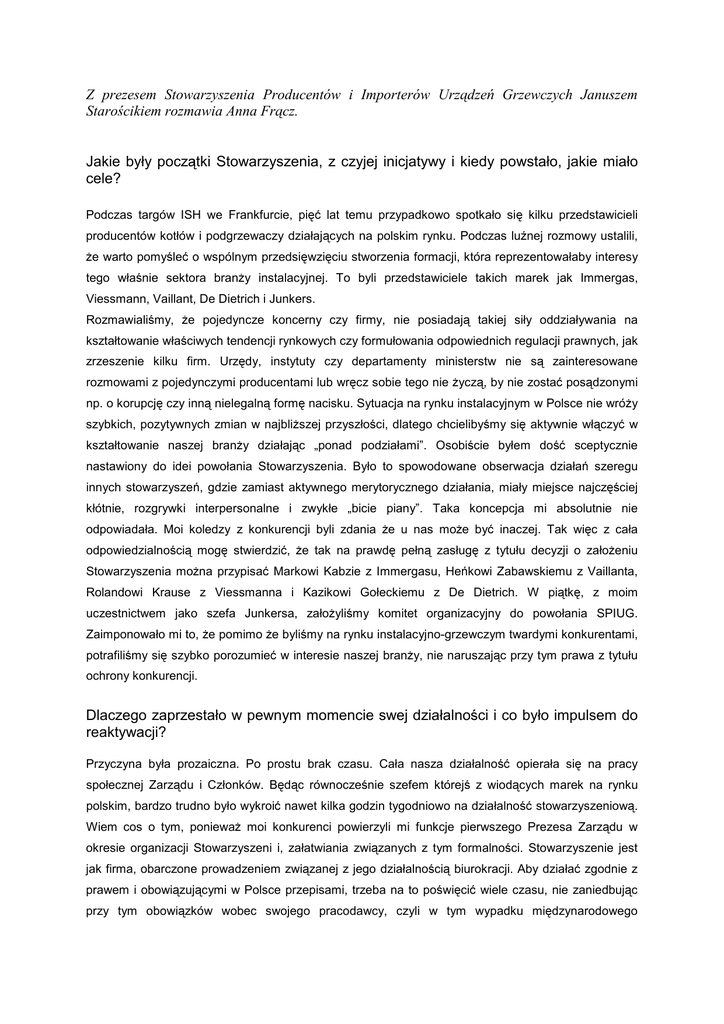 Z prezesem Stowarzyszenia Producentów i Importerów Urządzeń Grzewczych Januszem Starościkiem rozmawia Anna Frącz. Jakie były początki Stowarzyszenia, z czyjej inicjatywy i kiedy powstało, jakie miało cele? Podczas targów ISH we Frankfurcie, pięć lat temu przypadkowo spotkało się kilku przedstawicieli producentów kotłów i podgrzewaczy działających na polskim rynku. Podczas luźnej rozmowy ustalili, że warto pomyśleć o wspólnym przedsięwzięciu stworzenia formacji, która reprezentowałaby interesy tego właśnie sektora branży instalacyjnej. To byli przedstawiciele takich marek jak Immergas, Viessmann, Vaillant, De Dietrich i Junkers. Rozmawialiśmy, że pojedyncze koncerny czy firmy, nie posiadają takiej siły oddziaływania na kształtowanie właściwych tendencji rynkowych czy formułowania odpowiednich regulacji prawnych, jak zrzeszenie kilku firm. Urzędy, instytuty czy departamenty ministerstw nie są zainteresowane rozmowami z pojedynczymi producentami lub wręcz sobie tego nie życzą, by nie zostać posądzonymi np. o korupcję czy inną nielegalną formę nacisku. Sytuacja na rynku instalacyjnym w Polsce nie wróży szybkich, pozytywnych zmian w najbliższej przyszłości, dlatego chcielibyśmy się aktywnie włączyć w kształtowanie naszej branży działając „ponad podziałami”. Osobiście byłem dość sceptycznie nastawiony do idei powołania Stowarzyszenia. Było to spowodowane obserwacja działań szeregu innych stowarzyszeń, gdzie zamiast aktywnego merytorycznego działania, miały miejsce najczęściej kłótnie, rozgrywki interpersonalne i zwykłe „bicie piany”. Taka koncepcja mi absolutnie nie odpowiadała. Moi koledzy z konkurencji byli zdania że u nas może być inaczej. Tak więc z cała odpowiedzialnością mogę stwierdzić, że tak na prawdę pełną zasługę z tytułu decyzji o założeniu Stowarzyszenia można przypisać Markowi Kabzie z Immergasu, Heńkowi Zabawskiemu z Vaillanta, Rolandowi Krause z Viessmanna i Kazikowi Gołeckiemu z De Dietrich. W piątkę, z moim uczestnictwem jako szefa Junkersa, założyliśmy komitet organizacyjny do powołania SPIUG. Zaimponowało mi to, że pomimo że byliśmy na rynku instalacyjno-grzewczym twardymi konkurentami, potrafiliśmy się szybko porozumieć w interesie naszej branży, nie naruszając przy tym prawa z tytułu ochrony konkurencji. Dlaczego zaprzestało w pewnym momencie swej działalności i co było impulsem do reaktywacji? Przyczyna była prozaiczna. Po prostu brak czasu. Cała nasza działalność opierała się na pracy społecznej Zarządu i Członków. Będąc równocześnie szefem którejś z wiodących marek na rynku polskim, bardzo trudno było wykroić nawet kilka godzin tygodniowo na działalność stowarzyszeniową. Wiem cos o tym, ponieważ moi konkurenci powierzyli mi funkcje pierwszego Prezesa Zarządu w okresie organizacji Stowarzyszeni i, załatwiania związanych z tym formalności. Stowarzyszenie jest jak firma, obarczone prowadzeniem związanej z jego działalnością biurokracji. Aby działać zgodnie z prawem i obowiązującymi w Polsce przepisami, trzeba na to poświęcić wiele czasu, nie zaniedbując przy tym obowiązków wobec swojego pracodawcy, czyli w tym wypadku międzynarodowego koncernu. Po podjęciu przeze mnie w końcu 2006 roku decyzji o odejściu z branży, co w efekcie nastąpiło w 2007 roku, moi koledzy stanęli przed tym samym problemem czasowym co ja, co zakończyło się praktycznym zawieszeniem działalności organizacji. Przez ten czas, każdy z członków którzy jakby nie było reprezentowali bardzo dobre silne marki, próbowali na własna rękę być aktywnym przy kształtowaniu rynku. Moim zdaniem, obserwując to wszystko, co się dzieje wokół spraw związanych z legislacją w Polsce, pojedyncza firma, choćby nie wiem jak silna, ma coraz mniejsze szanse na przedstawienie choćby jak najbardziej słusznego stanowiska w jakiejś sprawie bez posądzenia o partykularne interesy. Poza tym uczestnictwo w Stowarzyszeniu jest normalną legalną platformą do rozmów pomiędzy konkurentami w codziennym biznesie na temat przyszłości rynku bez niebezpieczeństwa posądzenia o zmowy kartelowe itp. Jest bardzo ważny argument „za” w świetle wydarzeń na rynku w różnych branżach, czego byliśmy świadkiem w przeszłości. Ważne jest, żebyśmy byli przekonani, po co nam jest potrzebna ta organizacja. Będąc tego świadomym, w lipcu 2010 roku odbyło się spotkanie członków, na którym podjęto jednomyślnie decyzje o reaktywowaniu działalności SPIUG, już w oparciu o zdobyte do tego czasu doświadczenia. Kto wchodzi w skład Stowarzyszenia? Ilu liczy członków? Kto jest we władzach? Stowarzyszenie liczy obecnie 19 członków zwyczajnych, dalszych 4 członków oczekuje na decyzje o przyjęciu. Ponadto mamy aktualnie 8 członków wspierających. Są nimi takie marki jak: ARISTON, DEDIETRICH, FEROLLI, IMMERGAS, JUNKERS, VAILLANT, VIESSMANN i WOLF. Kilka następnych marek złożyło juz zapytanie o warunki przystąpienia do Stowarzyszenia. Zarząd SPIU składa się z 3 osób. Obok mojej skromnej osoby, członkami Zarządu są jeszcze Roland Krause z Viessmann i Witek Ludwiczak z Immergas. Pozwolę sobie wyrazić tutaj moja osobistą opinie na temat naszej współpracy w ramach Stowarzyszenia. Osobiście życzyłbym innym Stowarzyszeniom takiej współpracy w ramach Zarządu jak i udziału innych członków w pracach organizacji, jaka ma miejsce u nas. Jestem osobiście pod wrażeniem zaangażowania moich kolegów w reaktywacją SPIUG. Stanowimy naprawdę zgrany zespół. Stanowi to dla mnie osobiście dodatkową motywację obok tego, że moi dawni konkurenci obdarzyli mnie zaufaniem i powierzyli mi funkcje związana bezpośrednio z ich reprezentowaniem. Jakie dziś cele stawia przed sobą Stowarzyszenie? SPIUG postawiło sobie 8 głównych celów: - rozwój nowoczesnych technik grzewczych - implementowanie rozwiązań ze 