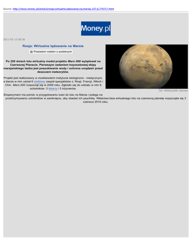 Source: http://news.money.pl/artykul/rosja;wirtualne;ladowanie;na;marsie,157,0,770717.html 2011-02-13 06:36 Rosja: Wirtualne lądowanie na Marsie @ Powiadom mailem o podobnych Po 250 dniach lotu wirtualny moduł projektu Mars-500 wylądował na Czerwonej Planecie. Pierwszym zadaniem trzyosobowej ekipy marsjańskiego łazika jest poszukiwanie wody i ochrona urządzeń przed deszczem meteorytów. Projekt jest realizowany w moskiewskim instytucie biologiczno - medycznym, a bierze w nim udział 6 osobowy zespół specjalistów z: Rosji, Francji, Włoch i Chin. Mars-500 rozpoczął się w 2009 roku. Zgłosiło się do udziału w nim 6 ochotników: 3 lekarzy i 3 inżynierów. fot: NASA/public domain Eksperyment ma pomóc w przygotowaniu ludzi do lotu na Marsa i polega na przetrzymywaniu ochotników w zamknięciu, aby zbadać ich psychikę. Właściwa faza wirtualnego lotu na czerwoną planetę rozpoczęła się 3 czerwca 2010 roku.