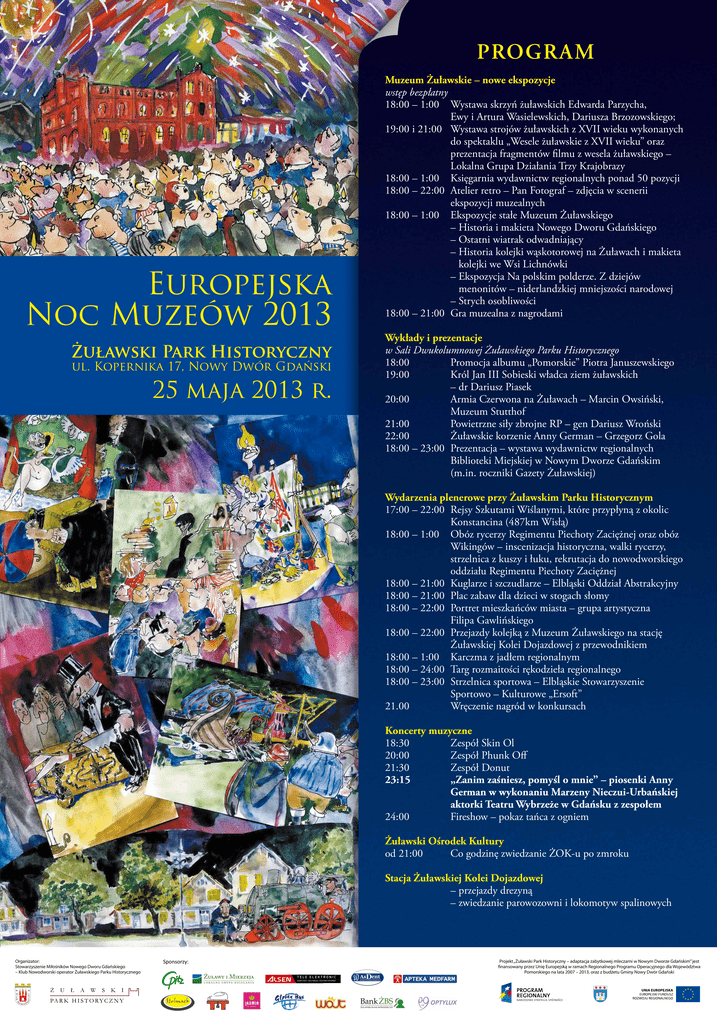 PROGRAM Europejska Noc Muzeów 2013 Żuławski Park Historyczny ul. Kopernika 17, Nowy Dwór Gdański 25 maja 2013 r. Muzeum Żuławskie – nowe ekspozycje wstęp bezpłatny 18:00 – 1:00 Wystawa skrzyń żuławskich Edwarda Parzycha, Ewy i Artura Wasielewskich, Dariusza Brzozowskiego; 19:00 i 21:00Wystawa strojów żuławskich z XVII wieku wykonanych do spektaklu „Wesele żuławskie z XVII wieku” oraz prezentacja fragmentów filmu z wesela żuławskiego – Lokalna Grupa Działania Trzy Krajobrazy 18:00 – 1:00 Księgarnia wydawnictw regionalnych ponad 50 pozycji 18:00 – 22:00Atelier retro – Pan Fotograf – zdjęcia w scenerii ekspozycji muzealnych 18:00 – 1:00 Ekspozycje stałe Muzeum Żuławskiego – Historia i makieta Nowego Dworu Gdańskiego – Ostatni wiatrak odwadniający – Historia kolejki wąskotorowej na Żuławach i makieta kolejki we Wsi Lichnówki – Ekspozycja Na polskim polderze. Z dziejów menonitów – niderlandzkiej mniejszości narodowej – Strych osobliwości 18:00 – 21:00 Gra muzealna z nagrodami Wykłady i prezentacje w Sali Dwukolumnowej Żuławskiego Parku Historycznego 18:00 Promocja albumu „Pomorskie” Piotra Januszewskiego 19:00Król Jan III Sobieski władca ziem żuławskich – dr Dariusz Piasek 20:00Armia Czerwona na Żuławach – Marcin Owsiński, Muzeum Stutthof 21:00 Powietrzne siły zbrojne RP – gen Dariusz Wroński 22:00 Żuławskie korzenie Anny German – Grzegorz Gola 18:00 – 23:00Prezentacja – wystawa wydawnictw regionalnych Biblioteki Miejskiej w Nowym Dworze Gdańskim (m.in. roczniki Gazety Żuławskiej) Wydarzenia plenerowe przy Żuławskim Parku Historycznym 17:00 – 22:00Rejsy Szkutami Wiślanymi, które przypłyną z okolic Konstancina (487km Wisłą) 18:00 – 1:00 Obóz rycerzy Regimentu Piechoty Zaciężnej oraz obóz Wikingów – inscenizacja historyczna, walki rycerzy, strzelnica z kuszy i łuku, rekrutacja do nowodworskiego oddziału Regimentu Piechoty Zaciężnej 18:00 – 21:00 Kuglarze i szczudlarze – Elbląski Oddział Abstrakcyjny 18:00 – 21:00 Plac zabaw dla dzieci w stogach słomy 18:00 – 22:00 Portret mieszkańców miasta – grupa artystyczna Filipa Gawlińskiego 18:00 – 22:00Przejazdy kolejką z Muzeum Żuławskiego na stację Żuławskiej Kolei Dojazdowej z przewodnikiem 18:00 – 1:00 Karczma z jadłem regionalnym 18:00 – 24:00 Targ rozmaitości rękodzieła regionalnego 18:00 – 23:00Strzelnica sportowa – Elbląskie Stowarzyszenie Sportowo – Kulturowe „Ersoft” 21.00 Wręczenie nagród w konkursach Koncerty muzyczne 18:30 Zespół Skin Ol 20:00 Zespół Phunk Off 21:30 Zespół Donut 23:15„Zanim zaśniesz, pomyśl o mnie” – piosenki Anny German w wykonaniu Marzeny Nieczui-Urbańskiej aktorki Teatru Wybrzeże w Gdańsku z zespołem 24:00 Fireshow – pokaz tańca z ogniem Żuławski Ośrodek Kultury od 21:00 Co godzinę zwiedzanie ŻOK-u po zmroku Stacja Żuławskiej Kolei Dojazdowej – przejazdy drezyną – zwiedzanie parowozowni i lokomotyw spalinowych Organizator: Stowarzyszenie Miłośników Nowego Dworu Gdańskiego – Klub Nowodworski operator Żuławskiego Parku Historycznego Sponsorzy: TELE ELEKTRONIC KOMPUTERY • MULTIMEDIA •TELEFONY•INTERNET Projekt „Żuławski Park Historyczny – adaptacja zabytkowej mleczarni w Nowym Dworze Gdańskim” jest finansowany przez Unię Europejską w ramach Regionalnego Programu Operacyjnego dla Województwa Pomorskiego na lata 2007 – 2013. oraz z budżetu Gminy Nowy Dwór Gdański