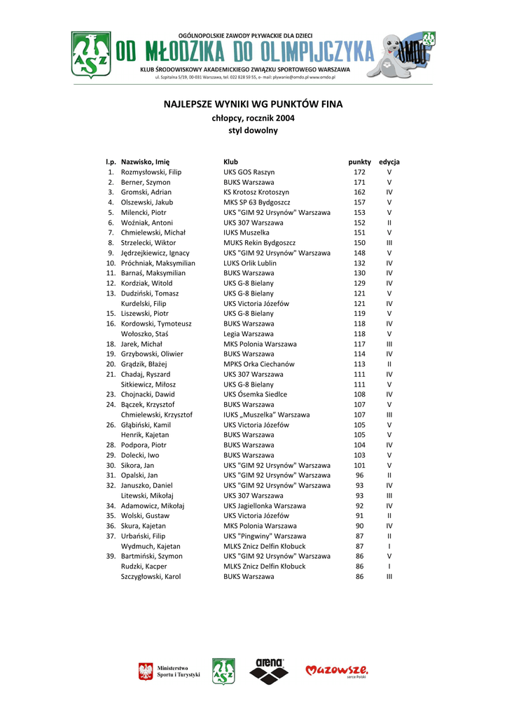 NAJLEPSZE WYNIKI WG PUNKTÓW FINA chłopcy, rocznik 2004 styl dowolny l.p. 1. 2. 3. 4. 5. 6. 7. 8. 9. 10. 11. 12. 13. 15. 16. 18. 19. 20. 21. 23. 24. 26. 28. 29. 30. 31. 32. 34. 35. 36. 37. 39. Nazwisko, Imię Rozmysłowski, Filip Berner, Szymon Gromski, Adrian Olszewski, Jakub Milencki, Piotr Woźniak, Antoni Chmielewski, Michał Strzelecki, Wiktor Jędrzejkiewicz, Ignacy Próchniak, Maksymilian Barnaś, Maksymilian Kordziak, Witold Dudziński, Tomasz Kurdelski, Filip Liszewski, Piotr Kordowski, Tymoteusz Wołoszko, Staś Jarek, Michał Grzybowski, Oliwier Grądzik, Błażej Chadaj, Ryszard Sitkiewicz, Miłosz Chojnacki, Dawid Bączek, Krzysztof Chmielewski, Krzysztof Głąbiński, Kamil Henrik, Kajetan Podpora, Piotr Dolecki, Iwo Sikora, Jan Opalski, Jan Januszko, Daniel Litewski, Mikołaj Adamowicz, Mikołaj Wolski, Gustaw Skura, Kajetan Urbański, Filip Wydmuch, Kajetan Bartmiński, Szymon Rudzki, Kacper Szczygłowski, Karol Klub UKS GOS Raszyn BUKS Warszawa KS Krotosz Krotoszyn MKS SP 63 Bydgoszcz UKS "GIM 92 Ursynów" Warszawa UKS 307 Warszawa IUKS Muszelka MUKS Rekin Bydgoszcz UKS "GIM 92 Ursynów" Warszawa LUKS Orlik Lublin BUKS Warszawa UKS G-8 Bielany UKS G-8 Bielany UKS Victoria Józefów UKS G-8 Bielany BUKS Warszawa Legia Warszawa MKS Polonia Warszawa BUKS Warszawa MPKS Orka Ciechanów UKS 307 Warszawa UKS G-8 Bielany UKS Ósemka Siedlce BUKS Warszawa IUKS „Muszelka” Warszawa UKS Victoria Józefów BUKS Warszawa BUKS Warszawa BUKS Warszawa UKS "GIM 92 Ursynów" Warszawa UKS "GIM 92 Ursynów" Warszawa UKS "GIM 92 Ursynów" Warszawa UKS 307 Warszawa UKS Jagiellonka Warszawa UKS Victoria Józefów MKS Polonia Warszawa UKS "Pingwiny" Warszawa MLKS Znicz Delfin Kłobuck UKS "GIM 92 Ursynów" Warszawa MLKS Znicz Delfin Kłobuck BUKS Warszawa punkty 172 171 162 157 153 152 151 150 148 132 130 129 121 121 119 118 118 117 114 113 111 111 108 107 107 105 105 104 103 101 96 93 93 92 91 90 87 87 86 86 86 edycja V V IV V V II V III V IV IV IV V IV V IV V III IV II IV V IV V III V V IV V V II IV III IV II IV II I V I III NAJLEPSZE WYNIKI WG PUNKTÓW FINA chłopcy, rocznik 2004 styl dowolny l.p. 42. 43. 44. 47. 48. 49. 52. 53. 54. 56. 57. 58. 60. 63. 64. 65. 66. 68. 70. 71. 73. 74. 75. 76. 78. 79. Nazwisko, Imię Bieguński, Borys Nogas, Oliwier Cieśla, Mateusz Iwanicki, Stanisław Krakowiak, Tymoteusz Janckiewicz, Mateusz Kozłowski, Szymon Kaczmarczyk, Olaf Leśniewski, Piotr Mróz, Antoni Adach, Grzegorz Brodacki, Stanisław Anisiewicz, Dominik Trinh, Jarosław Niewiadomski, Oliwier Kołbuś, Jakub Kędzierski, Adam Molenda, Mateusz Howeryng, Franciszek Lipski, Łukasz Majkowski, Aleksander Koba, Ignacy Kliś, Kacper Sieczek, Oliwier Burkiewicz, Jan Korzeniowski, Karol Borkowski, Adam Szymański, Mateusz Ostałowski, Dariusz Bątkiewicz, Adam Kazimierski, Wiktor Szwan, Michał Widy-Wirski, Antek Dardziński, Szymon Kozub, Aleksander Skrodzki, Adam Ziółkowski, Aleksander Gliński, Filip Mackiewicz, Piotr Klub UKS "Pingwiny" Warszawa BUKS Warszawa UKS "GIM 92 Ursynów" Warszawa MUKP Warszawianka Wodny Park UKS Jagiellonka Warszawa UKS "G-8 Bielany" Warszawa BUKS Warszawa UKS Victoria Józefów UKS "GIM 92 Ursynów" Warszawa UKS 307 Warszawa UKS "GIM 92 Ursynów" Warszawa MKS Ochota Warszawa UKS "GIM 92 Ursynów" Warszawa UKS 307 Warszawa UKP Jedynka Elbląg UKS "Pingwiny" Warszawa BUKS Warszawa UKS "GIM 92 Ursynów" Warszawa UKS 307 Warszawa UKS "GIM 92 Ursynów" Warszawa UKS 307 Warszawa UKS "GIM 92 Ursynów" Warszawa UKS "GIM 92 Ursynów" Warszawa UKS Jagiellonka Warszawa UKS Victoria Józefów Legia Warszawa UKS Ósemka Siedlce UKS "Polonez" Wyszków UKP Jedynka Elbląg BUKS Warszawa UKS "Pingwiny" Warszawa UKS "GIM 92 Ursynów" Warszawa Legia Warszawa BUKS Warszawa UKS Jagiellonka Warszawa UKS Victoria Józefów UKS 307 Warszawa UKS "GIM 92 Ursynów" Warszawa MKS Polonia Warszawa punkty 85 84 83 83 83 82 81 76 76 76 75 73 72 72 71 70 69 69 68 68 68 67 65 64 63 63 62 62 61 60 60 59 57 55 54 54 50 49 49 edycja III IV V V IV III V IV IV IV IV II IV III I I V II III IV II IV IV IV V III II III I V I II III I IV V I IV III NAJLEPSZE WYNIKI WG PUNKTÓW FINA chłopcy, rocznik 2004 styl dowolny l.p. Nazwisko, Imię 81. Lucedarski, Bartosz Niedzielski, Michał 83. Markowski, Przemysław Woźniak, Piotr 85. Kałaska, Patryk Kiryluk, Patryk Pudziński, Tomasz 88. Toczyski, Wiktor 89. Facon, Kamil Paszkiewicz, Olaf Piszczatowski, Franek 92. Zieliński, Olgierd 93. Potrzeszcz, Jan Turek, Maciej Znaleźniak, Adam 96. Konstanty, Michał Stanek, Maciej 98. Klimek, Kacper 99. Garbalski, Hubert 100. Kowalski, Wojciech 101. Nowogrodzki, Jakub 102. Bołoz, Wojciech 103. Waszczuk, Antoni 104. Maślanka, Rafał 105. Matysiak, Maciej Klub Perła Radom UKS "GIM 92 Ursynów" Warszawa UKS Victoria Józefów UKS "Pingwiny" Warszawa UKS Jagiellonka Warszawa MKS Polonia Warszawa UKS "G-8 Bielany" Warszawa UKS "Pingwiny" Warszawa BUKS Warszawa UKS "GIM 92 Ursynów" Warszawa UKS "GIM 92 Ursynów" Warszawa UKS "GIM 92 Ursynów" Warszawa UKS "GIM 92 Ursynów" Warszawa UKS "Polonez" Wyszków UKS Jagiellonka Warszawa UKS Ósemka Siedlce IUKS „Muszelka” Warszawa UKS "GIM 92 Ursynów" Warszawa IUKS „Muszelka” Warszawa IUKS „Muszelka” Warszawa UKS "GIM 92 Ursynów" Warszawa UKS "dwójka" Sochaczew UKS 307 Warszawa IUKS „Muszelka” Warszawa IUKS „Muszelka” Warszawa punkty 48 48 46 46 45 45 45 44 43 43 43 42 38 38 38 36 36 31 28 27 25 22 20 19 17 edycja II V I I IV IV II I IV IV IV III IV III IV II I IV I I IV I I I I NAJLEPSZE WYNIKI WG PUNKTÓW FINA chłopcy, rocznik 2004 styl klasyczny l.p. 1. 2. 3. 4. 5. 6. 7. 9. 10. 11. 12. 13. 14. 16. 17. 18. 19. 20. 22. 23. 24. 25. 26. 27. 28. 29. 31. 32. 33. Nazwisko, Imię Gdaniec, Hubert Olszewski, Jakub Szczęśniak, Kajetan Opalski, Jan Barnaś, Maksymilian Hassan, Adam Chojnacki, Dawid Jarek, Michał Nogas, Oliwier Wołoszko, Staś Kurdelski, Filip Kędzierski, Adam Chadaj, Ryszard Dardziński, Szymon Próchniak, Maksymilian Wydmuch, Kajetan Gromski, A