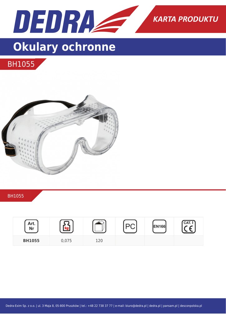 Okulary ochronne BH1055 BH1055 BH1055 0,075 120 Dedra-Exim Sp. z o.o. | ul. 3 Maja 8, 05-800 Pruszków | tel.: +48 22 738 37 77 | e-mail: [email protected] | dedra.pl | pansam.pl | desconpolska.pl