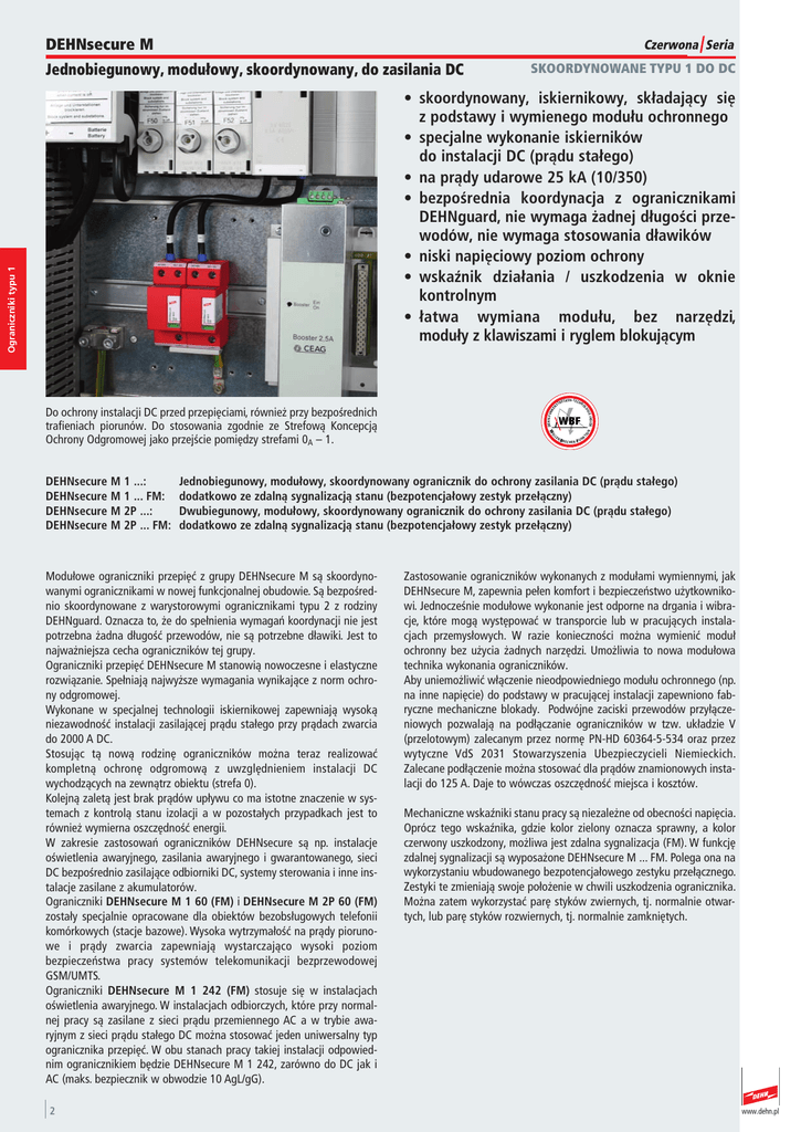 DEHNsecure M Jednobiegunowy, modułowy, skoordynowany, do zasilania DC SKOORDYNOWANE TYPU 1 DO DC O LO G IE KE E C K EN - T E C HN ON IN S I D E NB TI LE RECHER-F U NK Jednobiegunowy, modułowy, skoordynowany ogranicznik do ochrony zasilania DC (prądu stałego) dodatkowo ze zdalną sygnalizacją stanu (bezpotencjałowy zestyk przełączny) Dwubiegunowy, modułowy, skoordynowany ogranicznik do ochrony zasilania DC (prądu stałego) dodatkowo ze zdalną sygnalizacją stanu (bezpotencjałowy zestyk przełączny) Modułowe ograniczniki przepięć z grupy DEHNsecure M są skoordynowanymi ogranicznikami w nowej funkcjonalnej obudowie. Są bezpośrednio skoordynowane z warystorowymi ogranicznikami typu 2 z rodziny DEHNguard. Oznacza to, że do spełnienia wymagań koordynacji nie jest potrzebna żadna długość przewodów, nie są potrzebne dławiki. Jest to najważniejsza cecha ograniczników tej grupy. Ograniczniki przepięć DEHNsecure M stanowią nowoczesne i elastyczne rozwiązanie. Spełniają najwyższe wymagania wynikające z norm ochrony odgromowej. Wykonane w specjalnej technologii iskiernikowej zapewniają wysoką niezawodność instalacji zasilającej prądu stałego przy prądach zwarcia do 2000 A DC. Stosując tą nową rodzinę ograniczników można teraz realizować kompletną ochronę odgromową z uwzględnieniem instalacji DC wychodzących na zewnątrz obiektu (strefa 0). Kolejną zaletą jest brak prądów upływu co ma istotne znaczenie w systemach z kontrolą stanu izolacji a w pozostałych przypadkach jest to również wymierna oszczędność energii. W zakresie zastosowań ograniczników DEHNsecure są np. instalacje oświetlenia awaryjnego, zasilania awaryjnego i gwarantowanego, sieci DC bezpośrednio zasilające odbiorniki DC, systemy sterowania i inne instalacje zasilane z akumulatorów. Ograniczniki DEHNsecure M 1 60 (FM) i DEHNsecure M 2P 60 (FM) zostały specjalnie opracowane dla obiektów bezobsługowych telefonii komórkowych (stacje bazowe). Wysoka wytrzymałość na prądy piorunowe i prądy zwarcia zapewniają wystarczająco wysoki poziom bezpieczeństwa pracy systemów telekomunikacji bezprzewodowej GSM/UMTS. Ograniczniki DEHNsecure M 1 242 (FM) stosuje się w instalacjach oświetlenia awaryjnego. W instalacjach odbiorczych, które przy normalnej pracy są zasilane z sieci prądu przemiennego AC a w trybie awaryjnym z sieci prądu stałego DC można stosować jeden uniwersalny typ ogranicznika przepięć. W obu stanach pracy takiej instalacji odpowiednim ogranicznikiem będzie DEHNsecure M 1 242, zarówno do DC jak i AC (maks. bezpiecznik w obwodzie 10 AgL/gG). 2 TR WBF L DEHNsecure M 1 ...: DEHNsecure M 1 ... FM: DEHNsecure M 2P ...: DEHNsecure M 2P ... FM: NS WE Do ochrony instalacji DC przed przepięciami, również przy bezpośrednich trafieniach piorunów. Do stosowania zgodnie ze Strefową Koncepcją Ochrony Odgromowej jako przejście pomiędzy strefami 0A – 1. D E HN - F U N Ograniczniki typu 1 • skoordynowany, iskiernikowy, składający się z podstawy i wymienego modułu ochronnego • specjalne wykonanie iskierników do instalacji DC (prądu stałego) • na prądy udarowe 25 kA (10/350) • bezpośrednia koordynacja z ogranicznikami DEHNguard, nie wymaga żadnej długości przewodów, nie wymaga stosowania dławików • niski napięciowy poziom ochrony • wskaźnik działania / uszkodzenia w oknie kontrolnym • łatwa wymiana modułu, bez narzędzi, moduły z klawiszami i ryglem blokującym Zastosowanie ograniczników wykonanych z modułami wymiennymi, jak DEHNsecure M, zapewnia pełen komfort i bezpieczeństwo użytkownikowi. Jednocześnie modułowe wykonanie jest odporne na drgania i wibracje, które mogą występować w transporcie lub w pracujących instalacjach przemysłowych. W razie konieczności można wymienić moduł ochronny bez użycia żadnych narzędzi. Umożliwia to nowa modułowa technika wykonania ograniczników. Aby uniemożliwić włączenie nieodpowiedniego modułu ochronnego (np. na inne napięcie) do podstawy w pracującej instalacji zapewniono fabryczne mechaniczne blokady. Podwójne zaciski przewodów przyłączeniowych pozwalają na podłączanie ograniczników w tzw. układzie V (przelotowym) zalecanym przez normę PN-HD 60364-5-534 oraz przez wytyczne VdS 2031 Stowarzyszenia Ubezpieczycieli Niemieckich. Zalecane podłączenie można stosować dla prądów znamionowych instalacji do 125 A. Daje to wówczas oszczędność miejsca i kosztów. Mechaniczne wskaźniki stanu pracy są niezależne od obecności napięcia. Oprócz tego wskaźnika, gdzie kolor zielony oznacza sprawny, a kolor czerwony uszkodzony, możliwa jest zdalna sygnalizacja (FM). W funkcję zdalnej sygnalizacji są wyposażone DEHNsecure M ... FM. Polega ona na wykorzystaniu wbudowanego bezpotencjałowego zestyku przełącznego. Zestyki te zmieniają swoje położenie w chwili uszkodzenia ogranicznika. Można zatem wykorzystać parę styków zwiernych, tj. normalnie otwartych, lub parę styków rozwiernych, tj. normalnie zamkniętych. www.dehn.pl DEHNsecure M SKOORDYNOWANE TYPU 1 DO DC DEHNsecure M 1 ... DC+/DC– DC+/DC– DC+'/DC–' Rysunek wymiarowy DSE M 1 ... Schemat połączeń DSE M 1 ... Jednobiegunowy, modułowy, skoordynowany ogranicznik do instalacji prądu stałego DC • skoordynowany, iskiernikowy, składający się z podstawy i wymienego modułu ochronnego • specjalne wykonanie iskierników do instalacji DC • bezpośrednia koordynacja z ogranicznikami DEHNguard, nie wymaga żadnej długości przewodów, nie wymaga stosowania dławików 971 121 DSE M 1 60 971 120 DSE M 1 220 971 122 DSE M 1 242 DSE M 1 60 971 121 Koordinierter Blitzstromableiter Typ 1 DEHNsecure M für DC-Stromkreise DSE M 1 220 971 120 Koordinierter Blitzstromableiter Typ 1 DEHNsecure M für DC-Stromkreise DSE M 1 242 971 122 Koordinierter Blitzstromableiter Typ 1 DEHNsecure M für DC-Stromkreise Typ DSE M 1 60 DSE M 1 220 DSE M 1 242 Numer katalogowy 971 121 971 1