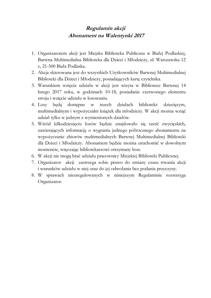 Regulamin akcji Abonament na Walentynki 2017 1. Organizatorem akcji jest Miejska Biblioteka Publiczna w Białej Podlaskiej, Barwna Multimedialna Biblioteka dla Dzieci i Młodzieży, ul. Warszawska 12 c, 21-500 Biała Podlaska. 2. Akcja skierowana jest do wszystkich Użytkowników Barwnej Multimedialnej Biblioteki dla Dzieci i Młodzieży, posiadających kartę czytelnika. 3. Warunkiem wzięcia udziału w akcji jest wizyta w Bibliotece Barwnej 14 lutego 2017 roku, w godzinach 10-18, posiadanie czerwonego elementu stroju i wzięcie udziału w losowaniu. 4. Losy będą dostępne w trzech działach biblioteki: dziecięcym, multimedialnym i wypożyczalni książek dla młodzieży. W akcji można wziąć udział tylko w jednym z wymienionych działów. 5. Wśród kilkudziesięciu losów będzie znajdowało się sześć zwycięskich, zawierających informację o wygraniu jednego półrocznego abonamentu na wypożyczanie zbiorów multimedialnych Barwnej Multimedialnej Biblioteki dla Dzieci i Młodzieży. Abonament będzie można uruchomić w dowolnym momencie, wręczając bibliotekarzowi otrzymany bon. 6. W akcji nie mogą brać udziału pracownicy Miejskiej Biblioteki Publicznej. 7. Organizator akcji zastrzega sobie prawo do zmiany czasu trwania akcji i warunków udziału w niej oraz do jej odwołania bez podania przyczyny. 8. W sprawach nieuregulowanych w niniejszym Regulaminie rozstrzyga Organizator.