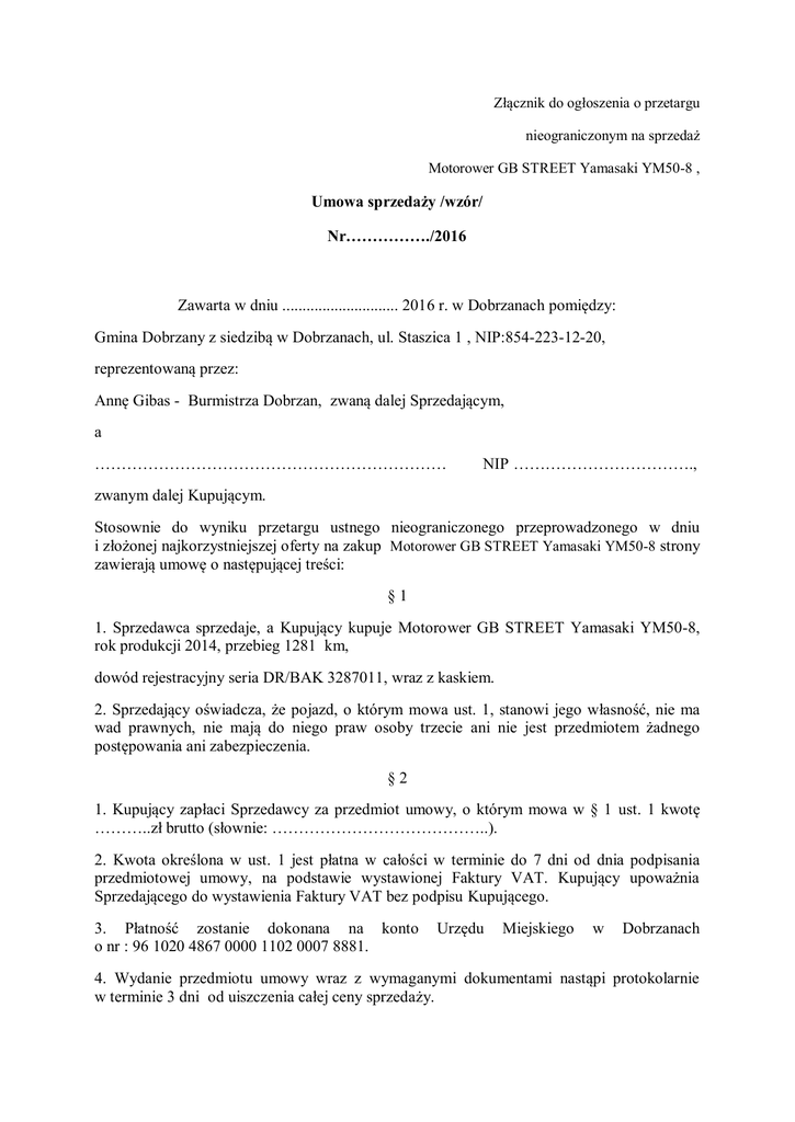 Złącznik do ogłoszenia o przetargu nieograniczonym na sprzedaż Motorower GB STREET Yamasaki YM50-8 , Umowa sprzedaży /wzór/ Nr……………./2016 Zawarta w dniu ............................. 2016 r. w Dobrzanach pomiędzy: Gmina Dobrzany z siedzibą w Dobrzanach, ul. Staszica 1 , NIP:854-223-12-20, reprezentowaną przez: Annę Gibas - Burmistrza Dobrzan, zwaną dalej Sprzedającym, a ………………………………………………………… NIP ……………………………., zwanym dalej Kupującym. Stosownie do wyniku przetargu ustnego nieograniczonego przeprowadzonego w dniu i złożonej najkorzystniejszej oferty na zakup Motorower GB STREET Yamasaki YM50-8 strony zawierają umowę o następującej treści: §1 1. Sprzedawca sprzedaje, a Kupujący kupuje Motorower GB STREET Yamasaki YM50-8, rok produkcji 2014, przebieg 1281 km, dowód rejestracyjny seria DR/BAK 3287011, wraz z kaskiem. 2. Sprzedający oświadcza, że pojazd, o którym mowa ust. 1, stanowi jego własność, nie ma wad prawnych, nie mają do niego praw osoby trzecie ani nie jest przedmiotem żadnego postępowania ani zabezpieczenia. §2 1. Kupujący zapłaci Sprzedawcy za przedmiot umowy, o którym mowa w § 1 ust. 1 kwotę ………..zł brutto (słownie: …………………………………..). 2. Kwota określona w ust. 1 jest płatna w całości w terminie do 7 dni od dnia podpisania przedmiotowej umowy, na podstawie wystawionej Faktury VAT. Kupujący upoważnia Sprzedającego do wystawienia Faktury VAT bez podpisu Kupującego. 3. Płatność zostanie dokonana na konto o nr : 96 1020 4867 0000 1102 0007 8881. Urzędu Miejskiego w Dobrzanach 4. Wydanie przedmiotu umowy wraz z wymaganymi dokumentami nastąpi protokolarnie w terminie 3 dni od uiszczenia całej ceny sprzedaży. 5. Wydanie, o którym mowa w ust. 4, nastąpi w Dobrzanach ul. Staszica 1. 6. Wszelkie koszty związane z odbiorem przedmiotu umowy ponosi Kupujący. §3 Kupujący oświadcza, że motorower określony w § 1 ust. 1 widział i nie wnosi jakichkolwiek zastrzeżeń zarówno co do stanu technicznego pojazdu, jego właściwości, jego wszystkich parametrów, a także jego wyglądu. §4 Wszelkie czynności związane z rejestracją pojazdu i zawarciem ubezpieczenia obowiązkowego OC zostaną podjęte przez Kupującego w przeciągu 30 dni od dnia zawarcia umowy. §5 Wszelkie koszty związane z zawarciem niniejszej umowy obciążają Kupującego, w tym wszelkie ewentualne należności publicznoprawne. §6 W sprawach nie uregulowanych niniejszą umową mają zastosowanie w szczególności przepisy kodeksu cywilnego. §7 W razie sporu sądem właściwym dla jego rozstrzygnięcia jest sąd właściwy miejscowo dla siedziby Sprzedającego. §8 Umowę sporządzono w dwóch jednobrzmiących egzemplarzach, po jednym dla każdej ze stron. §9 Wszelkie zmiany niniejszej umowy wymagają zachowania formy pisemnej pod rygorem nieważności. SPRZEDAJĄCY ............................................ KUPUJĄCY ........................................