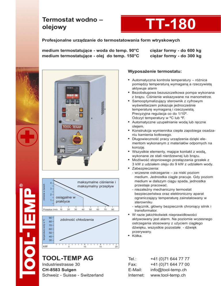 TT-180 Termostat wodno – olejowy Profesjonalne urządzanie do termostatowania form wtryskowych medium termostatujące - woda do temp. 90°C medium termostatujące - olej do temp. 150°C ciężar formy - do 600 kg ciężar formy - do 300 kg Wyposażenie termostatu: • Automatyczna kontrola temperatury – różnica • • • • • • • ciśnienie w barach • maksymalne ciśnienie i maksymalny przepływ 4 3 2 1 osiągalne w praktyce temperatura wody w ºC Przepływ l/min. 10 kW 90 80 20 30 40 50 60 70 80 • zdolność chłodzenia 70 60 50 • 40 pomiędzy temperaturą wymaganą a rzeczywistą aktywuje alarm Bezobsługowa bezuszczelkowa pompa wykonana z brązu. Ciśnienie wskazywane na manometrze. Samooptymalizujący sterownik z cyfrowym wyświetlaczem pokazuje jednocześnie temperaturę wymaganą i rzeczywistą. Precyzyjna regulacja co do 1/10º. Odczyt temperatury w ºC lub ºF. Automatyczne uzupełnianie wodą lub ręczne olejem. Konstrukcja wymiennika ciepła zapobiega osadzaniu kamienia kotłowego. Długowieczność pracy urządzenia dzięki elementom wykonanym z materiałów odpornych na korozję. Wszystkie elementy, mające kontakt z wodą, wykonane ze stali nierdzewnej lub brązu. Możliwość stopniowego przełączania grzałek z 3 kW z udziałem oleju do 9 kW z udziałem wody. Zabezpieczenia: - wczesne ostrzeganie – za niski poziom medium. Jednostka ciągle pracuje. Gdy poziom medium w dalszym ciągu spada, jednostka przestaje pracować. - niezależny mechaniczny termostat bezpieczeństwa oraz elektroniczny aparat ograniczający temperaturę zainstalowany w sterowniku - włącznik, główny bezpiecznik chroniący silnik i transformator. W razie jakichkolwiek nieprawidłowości aktywowany jest alarm. Na poziomie wczesnego ostrzegania stosowany z użyciem ciągłego dźwięku, wszystkie pozostałe - dźwięk przerywany. Kółka. 30 5 10 TOOL-TEMP AG 15 Industriestrasse 30 CH-8583 Sulgen Schweiz - Suisse - Switzerland 20 Tel.: Fax: E-Mail: Internet: +41 (0)71 644 77 77 +41 (0)71 644 77 00 [email protected] www.tool-temp.ch Dane techniczne Zakres temperatury Kontrola temperatury Moc grzewcza Stopniowe przełączanie Zdolność chłodzenia Moc i punkt pracy pompy Tryb ciśnieniowy Pojemność jednostki Połączenia Medium termostatujące Woda chłodząca Wymiary Waga Kolor medium - woda do temp. 90°C medium - olej do temp. 150°C elektroniczny sterownik MP-888 z cyfrowym wyświetlaczem temperatury nastawionej i rzeczywistej. Elektroniczny monitoring temperatury, z cyfrowym wyświetlaczem i automatyczną kontrolą minimalnego przepływu 9 kW z udziałem wody, 3kW z udziałem oleju 3 / 6 / 9 kW 18 kW przy temp. 90°C silnik 0,75 kW max. 4,5 bar / max. 75 l/min. min. 5 l / max. 7 l 1 /2” żeńskie /8” męskie (dł. / szer. / wys.) 670 x 260 x 650 mm (z kółkami) około 55 kg w stanie pustym srebrno-szary RAL 7001 3 Dostępne są wszystkie możliwe wersje napięciowe od 3 x 200 V do 3 x 600 V i 50/60 Hz. Termoregulatory są dostosowane do specyfikacji UL/CSA. Na rynek amerykański termoregulatory są wyposażane w połączenia złącza NPT i sterownik dostosowany do odczytu w °F. Elektroniczny sterownik temperatury MP–888 Elektroniczny sterownik może działać z odczytem w °C lub °F. Złącza analogowe 0-5 V 0-10 V i 4-20 mA są standardowo instalowane w sterownikach bez dodatkowych opłat. Samooptymalizująca charakterystyka sterownika pozwala na wysoką dokładność regulacji temperatury i utrzymuje ustawione temperatury, nawet podczas wysokich temperatur roboczych. Nastawiona / wymagana temperatura Regulacja co do 1/10º Temperatura rzeczywista - wyświetlanie z dokładnością do 1/10º Kontrola przepływu – brak, funkcja dostępna w modelu TT-188, który posiada również funkcję osuszania formy i pracy w podciśnieniu.
