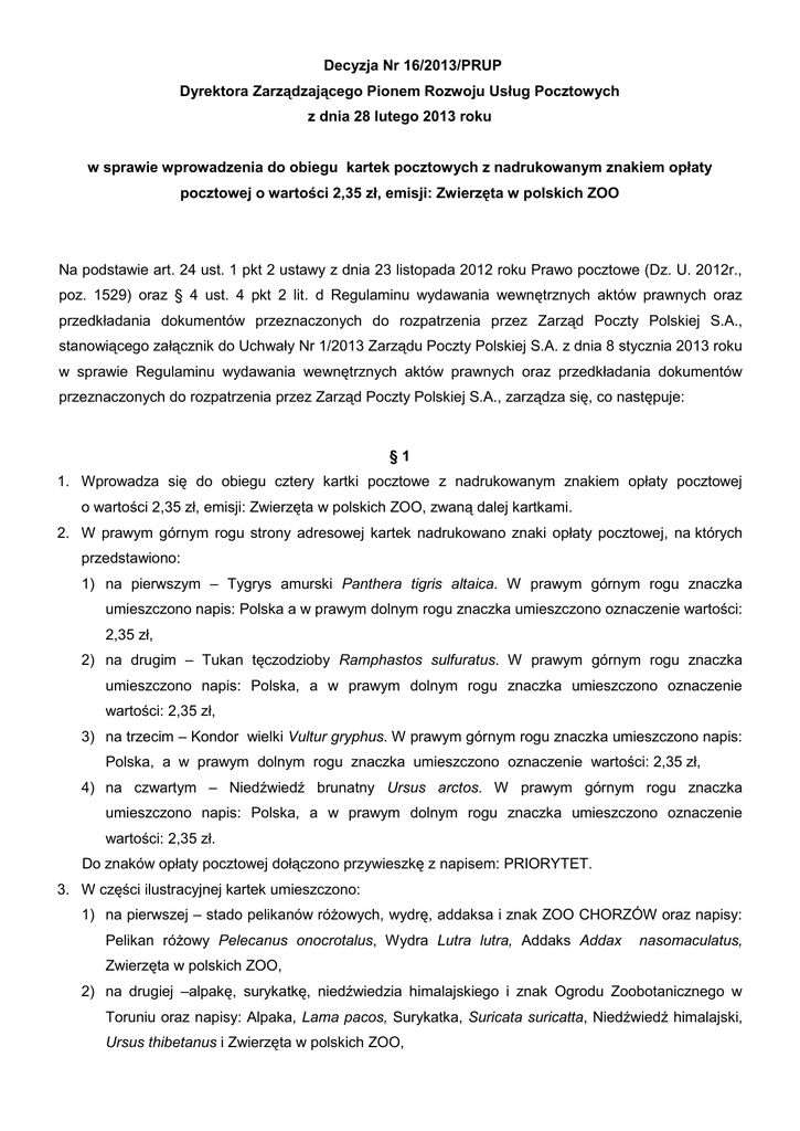 Decyzja Nr 16/2013/PRUP Dyrektora Zarządzającego Pionem Rozwoju Usług Pocztowych z dnia 28 lutego 2013 roku w sprawie wprowadzenia do obiegu kartek pocztowych z nadrukowanym znakiem opłaty pocztowej o wartości 2,35 zł, emisji: Zwierzęta w polskich ZOO Na podstawie art. 24 ust. 1 pkt 2 ustawy z dnia 23 listopada 2012 roku Prawo pocztowe (Dz. U. 2012r., poz. 1529) oraz § 4 ust. 4 pkt 2 lit. d Regulaminu wydawania wewnętrznych aktów prawnych oraz przedkładania dokumentów przeznaczonych do rozpatrzenia przez Zarząd Poczty Polskiej S.A., stanowiącego załącznik do Uchwały Nr 1/2013 Zarządu Poczty Polskiej S.A. z dnia 8 stycznia 2013 roku w sprawie Regulaminu wydawania wewnętrznych aktów prawnych oraz przedkładania dokumentów przeznaczonych do rozpatrzenia przez Zarząd Poczty Polskiej S.A., zarządza się, co następuje: §1 1. Wprowadza się do obiegu cztery kartki pocztowe z nadrukowanym znakiem opłaty pocztowej o wartości 2,35 zł, emisji: Zwierzęta w polskich ZOO, zwaną dalej kartkami. 2. W prawym górnym rogu strony adresowej kartek nadrukowano znaki opłaty pocztowej, na których przedstawiono: 1) na pierwszym – Tygrys amurski Panthera tigris altaica. W prawym górnym rogu znaczka umieszczono napis: Polska a w prawym dolnym rogu znaczka umieszczono oznaczenie wartości: 2,35 zł, 2) na drugim – Tukan tęczodzioby Ramphastos sulfuratus. W prawym górnym rogu znaczka umieszczono napis: Polska, a w prawym dolnym rogu znaczka umieszczono oznaczenie wartości: 2,35 zł, 3) na trzecim – Kondor wielki Vultur gryphus. W prawym górnym rogu znaczka umieszczono napis: Polska, a w prawym dolnym rogu znaczka umieszczono oznaczenie wartości: 2,35 zł, 4) na czwartym – Niedźwiedź brunatny Ursus arctos. W prawym górnym rogu znaczka umieszczono napis: Polska, a w prawym dolnym rogu znaczka umieszczono oznaczenie wartości: 2,35 zł. Do znaków opłaty pocztowej dołączono przywieszkę z napisem: PRIORYTET. 3. W części ilustracyjnej kartek umieszczono: 1) na pierwszej – stado pelikanów różowych, wydrę, addaksa i znak ZOO CHORZÓW oraz napisy: Pelikan różowy Pelecanus onocrotalus, Wydra Lutra lutra, Addaks Addax nasomaculatus, Zwierzęta w polskich ZOO, 2) na drugiej –alpakę, surykatkę, niedźwiedzia himalajskiego i znak Ogrodu Zoobotanicznego w Toruniu oraz napisy: Alpaka, Lama pacos, Surykatka, Suricata suricatta, Niedźwiedź himalajski, Ursus thibetanus i Zwierzęta w polskich ZOO, 3) na trzeciej - pingwiny tońce, słonia afrykańskiego, geparda i znak ZOO Gdańsk- Oliwa oraz napisy: Pingwin toniec, Spheniscus demersus, Słoń afrykański, Loxodonta africana, Gepard, Acinonyx jubatus i Zwierzęta w polskich ZOO, 4) na czwartej – legwana zielonego, owcę grzywiastą arui, makaka lapundera i znak graficzny Braniewo oraz napisy: Legwan zielony, Iguana iguana, Owca grzywiasta arui, Ammotragus lervia, Makak lapunder, Macaca nemestrina i Zwierzęta w polskich ZOO. 4. Kartki o wymiarach 148 x 105 mm, wydrukowano jednostronnie, techniką offsetową, na kartonie białym, w nakładzie 26.700 sztuk każdej, w następujących kolorach druku: czerwonym, niebieskim i czarnym. §2 Decyzja wchodzi w życie z dniem 28 lutego 2013 roku. Właściwy podpis na oryginale 2 żółtym,