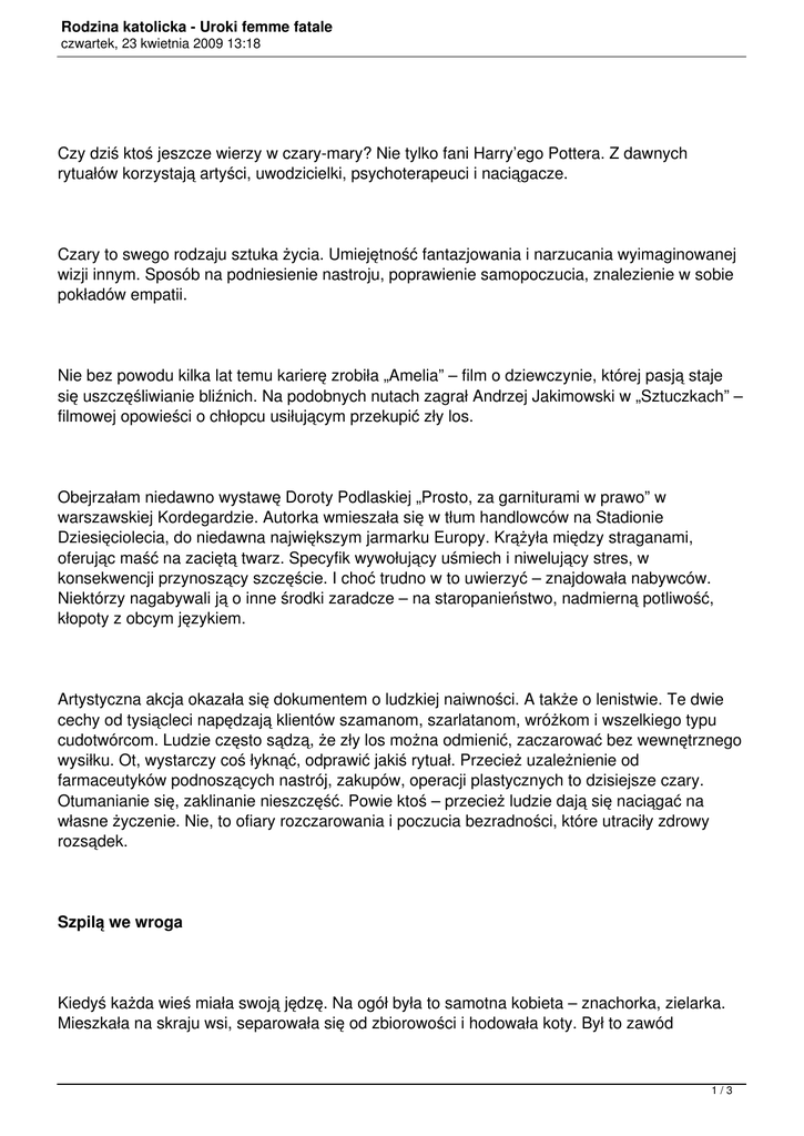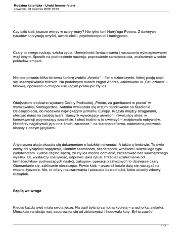 Rodzina katolicka - Uroki femme fatale czwartek, 23 kwietnia 2009 13:18 Czy dziś ktoś jeszcze wierzy w czary-mary? Nie tylko fani Harry’ego Pottera. Z dawnych rytuałów korzystają artyści, uwodzicielki, psychoterapeuci i naciągacze. Czary to swego rodzaju sztuka życia. Umiejętność fantazjowania i narzucania wyimaginowanej wizji innym. Sposób na podniesienie nastroju, poprawienie samopoczucia, znalezienie w sobie pokładów empatii. Nie bez powodu kilka lat temu karierę zrobiła „Amelia” – film o dziewczynie, której pasją staje się uszczęśliwianie bliźnich. Na podobnych nutach zagrał Andrzej Jakimowski w „Sztuczkach” – filmowej opowieści o chłopcu usiłującym przekupić zły los. Obejrzałam niedawno wystawę Doroty Podlaskiej „Prosto, za garniturami w prawo” w warszawskiej Kordegardzie. Autorka wmieszała się w tłum handlowców na Stadionie Dziesięciolecia, do niedawna największym jarmarku Europy. Krążyła między straganami, oferując maść na zaciętą twarz. Specyfik wywołujący uśmiech i niwelujący stres, w konsekwencji przynoszący szczęście. I choć trudno w to uwierzyć – znajdowała nabywców. Niektórzy nagabywali ją o inne środki zaradcze – na staropanieństwo, nadmierną potliwość, kłopoty z obcym językiem. Artystyczna akcja okazała się dokumentem o ludzkiej naiwności. A także o lenistwie. Te dwie cechy od tysiącleci napędzają klientów szamanom, szarlatanom, wróżkom i wszelkiego typu cudotwórcom. Ludzie często sądzą, że zły los można odmienić, zaczarować bez wewnętrznego wysiłku. Ot, wystarczy coś łyknąć, odprawić jakiś rytuał. Przecież uzależnienie od farmaceutyków podnoszących nastrój, zakupów, operacji plastycznych to dzisiejsze czary. Otumanianie się, zaklinanie nieszczęść. Powie ktoś – przecież ludzie dają się naciągać na własne życzenie. Nie, to ofiary rozczarowania i poczucia bezradności, które utraciły zdrowy rozsądek. Szpilą we wroga Kiedyś każda wieś miała swoją jędzę. Na ogół była to samotna kobieta – znachorka, zielarka. Mieszkała na skraju wsi, separowała się od zbiorowości i hodowała koty. Był to zawód 1/3 Rodzina katolicka - Uroki femme fatale czwartek, 23 kwietnia 2009 13:18 wysokiego ryzyka: nigdy nie było wiadomo, kiedy przydatność czarownicy zostanie podana w wątpliwość i oskarży się ją o konszachty z diabłem. Stosunek do wiedźm był ambiwalentny, podobnie jak do femme fatale. Z jednej strony estyma i podziw, z drugiej strach, a w konsekwencji – nienawiść. W razie plag i nieszczęść to wiedźmy stają się kozłami ofiarnymi. Nie trzeba przypominać, czym kiedyś kończyło się pomówienie o kontakty z siłami nieczystymi. To nie tak zamierzchła przeszłość – ostatni w Europie proces zakończony wyrokiem skazującym za czary miał miejsce w Anglii w 1951 roku. Pół wieku temu! A dziesięć lat temu pewną piętnastolatkę usunięto ze szkoły w stanie Oklahoma za „rzucanie uroków”. Rzeczywistość się zmienia, ale ludzka psychika – bynajmniej. Profesja czarownicy przetrwała. W globalnej wiosce wróżki, znachorzy, hipnotyzerzy, hochsztaplerzy i naciągacze mają pełne ręce roboty. W berlińskim butiku Dom (Katedra) wypatrzyłam laleczki z dziurkami w korpusie, do kupienia z kompletem szpil. Odpowiednik dawnych woskowych figurek, w które wiedźmy zastępczo wbijały igły, za ich pośrednictwem krzywdząc żywą osobę. Na podobny pomysł wpadła Anna Krenz, polska artystka mieszkająca w Berlinie: uszyła szmaciane kukiełki i wbiła w nie igły. Niby wszystko to żarty – ale złość i satysfakcja, z jaką niektórzy nakłuwają laleczki, daje do myślenia. Tyle negatywnych emocji musi wpływać destrukcyjnie na stosunki międzyludzkie. Jak trwoga, to do wróżki Wiele praktyk polecanych przez psychologów ma w sobie elementy czarów. Ćwiczenie pozytywnego myślenia to nic innego jak „zaklinanie” złego. Uwodzenie – to także trochę nieczysta metoda rzucania uroku na wybrańca. Zwłaszcza psychoanaliza ma w sobie coś z demonizmu. Przecież grzebanie w duszy, w psychice, w emocjach jest zajęciem niebezpiecznym. Zarówno dla operatora, jak i pacjenta. Psychologowie i psychoterapeuci znają techniki utrzymywania dystansu wobec podopiecznych. Przynajmniej teoretycznie. Przeciwnie szamani i czarownice. Ci „przyjmują w siebie” drugiego człowieka, utożsamiają się z nim. Na koniec – wyznanie. Jestem przekonana o istnieniu ludzi wyposażonych w różne szczególne umiejętności, do których nauka nie daje akcesu. Teraz nadchodzi ich czas. Zbiorowe klęski i 2/3 Rodzina katolicka - Uroki femme fatale czwartek, 23 kwietnia 2009 13:18 kryzysy zawsze skłaniają ludzi do poszukiwania pozarozumowych rozwiązań. Zabawię się więc we wróżkę: przewiduję dobrą passę dla magów. Monika Małkowska Źródło: Rzeczpospolita 3/3