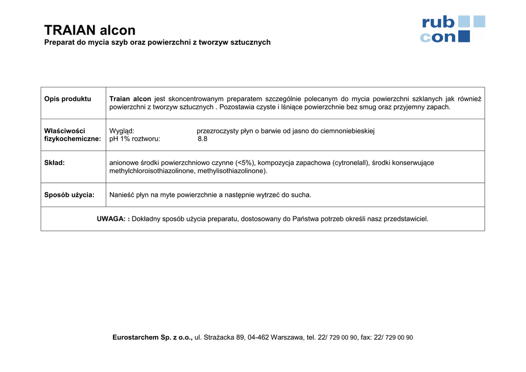 TRAIAN alcon Preparat do mycia szyb oraz powierzchni z tworzyw sztucznych Opis produktu Traian alcon jest skoncentrowanym preparatem szczególnie polecanym do mycia powierzchni szklanych jak również powierzchni z tworzyw sztucznych . Pozostawia czyste i lśniące powierzchnie bez smug oraz przyjemny zapach. Właściwości fizykochemiczne: Wygląd: pH 1% roztworu: Skład: anionowe środki powierzchniowo czynne (<5%), kompozycja zapachowa (cytronelall), środki konserwujące methylchloroisothiazolinone, methylisothiazolinone). Sposób użycia: Nanieść płyn na myte powierzchnie a następnie wytrzeć do sucha. przezroczysty płyn o barwie od jasno do ciemnoniebieskiej 8.8 UWAGA: : Dokładny sposób użycia preparatu, dostosowany do Państwa potrzeb określi nasz przedstawiciel. Eurostarchem Sp. z o.o., ul. Strażacka 89, 04-462 Warszawa, tel. 22/ 729 00 90, fax: 22/ 729 00 90