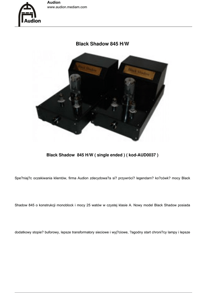 Audion www.audion.mediam.com Black Shadow 845 H/W Black Shadow 845 H/W ( single ended ) ( kod-AUD0037 ) Spe?niaj?c oczekiwania klientów, firma Audion zdecydowa?a si? przywróci? legendarn? ko?cówk? mocy Black Shadow 845 o konstrukcji monoblock i mocy 25 watów w czystej klasie A. Nowy model Black Shadow posiada dodatkowy stopie? buforowy, lepsze transformatory sieciowe i wyj?ciowe, ?agodny start chroni?cy lampy i lepsze Audion www.audion.mediam.com komponenty – oprócz tego ma te? du?y zasilacz z kondensatorem polipropylenowym oraz du?e kondensatory obej?ciowe i odsprz?gaj?ce – wszystko to gwarantuje szybkie i p?ynne przej?cia. Wzmacniacz ten posiada po??czenia zrobione na sztywno, jest wykonany r?cznie, przy wykorzystaniu solidnych, srebrnych przewodów 5x9 w wi?kszo?ci ?cie?ek audio (z wyj?tkiem transformatora wyj?ciowego, wej?cia RCA, gniazd g?o?nikowych i podstawek lamp). Je?li tylko to mo?liwe, korzystamy z komponentów pochodz?cych z Europy lub Stanów Zjednoczonych, unikaj?c gorszych, chi?skich podzespo?ów. Ten stereofoniczny wzmacniacz triodowy o konstrukcji monoblock ma zerowe sprz??enie zwrotne. Audion www.audion.mediam.com Dobór wzmacniacza Wzmacniacz Black Shadow 845 SE standardowo wyposa?ono w lampy Shunguang 845, ale na ?yczenie dost?pne s? tak?e wersje z wybranymi lampami typu 845. Wzmacniacz b?dzie wspó?pracowa? z wi?kszo?ci? g?o?ników o efektywno?ci 83-4 dB. Tworzy doskona?e po??czenie z naszymi kablami z serii Electron. Wzmacniacz posiada moc 25 watów przy 8 omach oraz wyj?cia 4 i 8 omów. Model ten ma mo?liwo?? rozbudowy – szczegó?y znajdziesz Audion www.audion.mediam.com na ko?cu. Aby zapewni? jak najlepsze przej?cia, w modelu tym wykorzystano prostowniki krzemowe. Ca?o?? zosta?a tak zaprojektowana, aby zapewni? spójn? fazowo struktur? harmoniczn? przy ca?ym spektrum cz?stotliwo?ci. Lampy wyj?ciowe typu 845 posiadaj? bardzo dobr? wydajno??, aby zapewni? niski poziom zak?óce? i optymaln? jako?? d?wi?ku. Maj? tak?e przed?u?on? ?ywotno??. Jako?? w ka?dym calu Audion www.audion.mediam.com Poniewa? oba monoblocki posiadaj? regulacj? g?o?no?ci na przednim panelu oraz wej?cia mono z ty?u, oznacza to, ?e nie trzeba pod??cza? przedwzmacniacza, ale jest on zalecany. Wszystkie te wzmacniacze posiadaj? automatyczny dobór pr?du podk?adu lamp. Wzmacniacze mog? wspó?pracowa? z niemal dowolnymi lampami typu 845 (urz?dzenie wyposa?ono w lampy Shunguang 845). Ko?cówka mocy Black Shadow Single Ended 845 klasy A posiada wyj?cia 4 i 8 omów oraz wej?cia mono. Wzmacniacz Black Shadow Single Ended 845 posiada po??czenia zrobione na sztywno (Air Wired©) i jest urz?dzeniem klasy A o konstrukcji monoblock. Wykonany jest z cz??ci pochodz?cych z Europy i Stanów Audion www.audion.mediam.com Zjednoczonych. Staramy si? unika? chi?skich podzespo?ów. Nasze transformatory wyj?ciowe s? nawijane przez nas, zgodnie z wyznaczonymi przez nas standardami, a wiele podzespo?ów jest wykonywanych przez nas lub specjalnie na nasze zamówienie. U?yte lampy to Shunguang 845 oraz NOS E182 CC i rosyjskie lampy NOS 6H23N. Wzmacniacz zosta? zaprojektowany pod k?tem du?ej mocy, przy czym jest bardzo muzykalny. . Moc wyjściowa Obciążenie Czułość Ref Zniekształcenia @ 1W Odstęp od szumów przy pełnej mocy < (CCIR) Pasmo przenoszenia Pobór mocy Lampy Zalecana efektywność kolumn głośnikowych Wymiary Waga Bezpiecznik 2 x 25 W Class A przy 8 Ohm 240V AC 4-8 Ohm 150mV 0,1% <- 90 dB 13 > 34 KHz ±3 dB RIAA 240 W x 2 ( 1 x 845, 1 x 6922, 1 x E182CC) x 2 83 - 84 dB 46 cm gł.; 26 cm szer.; 25 cm wys. 12 kg 500mA/240V Audion www.audion.mediam.com Gwarancja Powered by TCPDF (www.tcpdf.org) 2 lata (urządzenie); 6 miesięcy (lampa)