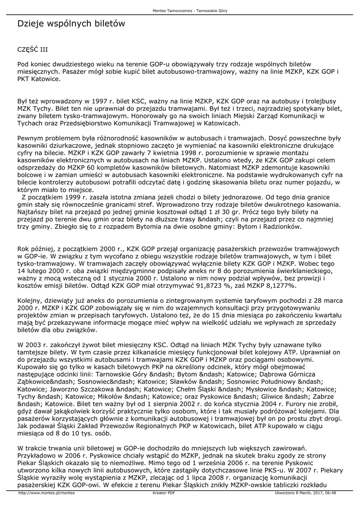 Montes Tarnovicensis - Tarnowskie Góry Dzieje wspólnych biletów CZĘŚĆ III Pod koniec dwudziestego wieku na terenie GOP-u obowiązywały trzy rodzaje wspólnych biletów miesięcznych. Pasażer mógł sobie kupić bilet autobusowo-tramwajowy, ważny na linie MZKP, KZK GOP i PKT Katowice. Był też wprowadzony w 1997 r. bilet KSC, ważny na linie MZKP, KZK GOP oraz na autobusy i trolejbusy MZK Tychy. Bilet ten nie uprawniał do przejazdu tramwajami. Był też i trzeci, najrzadziej spotykany bilet, zwany biletem tysko-tramwajowym. Honorowały go na swoich liniach Miejski Zarząd Komunikacji w Tychach oraz Przedsiębiorstwo Komunikacji Tramwajowej w Katowicach. Pewnym problemem była różnorodność kasowników w autobusach i tramwajach. Dosyć powszechne były kasowniki dziurkaczowe, jednak stopniowo zaczęto je wymieniać na kasowniki elektroniczne drukujące cyfry na bilecie. MZKP i KZK GOP zawarły 7 kwietnia 1998 r. porozumienie w sprawie montażu kasowników elektronicznych w autobusach na liniach MZKP. Ustalono wtedy, że KZK GOP zakupi celem odsprzedaży do MZKP 60 kompletów kasowników biletowych. Natomiast MZKP zdemontuje kasowniki bolcowe i w zamian umieści w autobusach kasowniki elektroniczne. Na podstawie wydrukowanych cyfr na bilecie kontrolerzy autobusowi potrafili odczytać datę i godzinę skasowania biletu oraz numer pojazdu, w którym miało to miejsce. Z początkiem 1999 r. zaszła istotna zmiana jeżeli chodzi o bilety jednorazowe. Od tego dnia granice gmin stały się równocześnie granicami stref. Wprowadzono trzy rodzaje biletów dwukrotnego kasowania. Najtańszy bilet na przejazd po jednej gminie kosztował odtąd 1 zł 30 gr. Prócz tego były bilety na przejazd po terenie dwu gmin oraz bilety na dłuższe trasy – czyli na przejazd przez co najmniej trzy gminy. Zbiegło się to z rozpadem Bytomia na dwie osobne gminy: Bytom i Radzionków. Rok później, z początkiem 2000 r., KZK GOP przejął organizację pasażerskich przewozów tramwajowych w GOP-ie. W związku z tym wycofano z obiegu wszystkie rodzaje biletów tramwajowych, w tym i bilet tysko-tramwajowy. W tramwajach zaczęły obowiązywać wyłącznie bilety KZK GOP i MZKP. Wobec tego 14 lutego 2000 r. oba związki międzygminne podpisały aneks nr 8 do porozumienia świerklanieckiego, ważny z mocą wsteczną od 1 stycznia 2000 r. Ustalono w nim nowy podział wpływów, bez prowizji i kosztów emisji biletów. Odtąd KZK GOP miał otrzymywać 91,8723 %, zaś MZKP 8,1277%. Kolejny, dziewiąty już aneks do porozumienia o zintegrowanym systemie taryfowym pochodzi z 28 marca 2000 r. MZKP i KZK GOP zobowiązały się w nim do wzajemnych konsultacji przy przygotowywaniu projektów zmian w przepisach taryfowych. Ustalono też, że do 15 dnia miesiąca po zakończeniu kwartału mają być przekazywane informacje mogące mieć wpływ na wielkość udziału we wpływach ze sprzedaży biletów dla obu związków. W 2003 r. zakończył żywot bilet miesięczny KSC. Odtąd na liniach MZK Tychy były uznawane tylko tamtejsze bilety. W tym czasie przez kilkanaście miesięcy funkcjonował bilet kolejowy ATP. Uprawniał on do przejazdu wszystkimi autobusami i tramwajami KZK GOP i MZKP oraz pociągami osobowymi. Kupowało się go tylko w kasach biletowych PKP na określony odcinek, który mógł obejmować następujące odcinki linii: Tarnowskie Góry – Bytom – Katowice; Dąbrowa Górnicza Ząbkowice– Sosnowiec– Katowice; Sławków – Sosnowiec Południowy – Katowice; Jaworzno Szczakowa – Katowice; Chełm Śląski – Mysłowice – Katowice; Tychy – Katowice; Mikołów – Katowice; oraz Pyskowice – Gliwice – Zabrze – Katowice. Bilet ten ważny był od 1 sierpnia 2002 r. do końca stycznia 2004 r. Furory nie zrobił, gdyż dawał jakąkolwiek korzyść praktycznie tylko osobom, które i tak musiały podróżować kolejami. Dla pasażerów korzystających głównie z komunikacji autobusowej i tramwajowej był on po prostu zbyt drogi. Jak podawał Śląski Zakład Przewozów Regionalnych PKP w Katowicach, bilet ATP kupowało w ciągu miesiąca od 8 do 10 tys. osób. W trakcie trwania unii biletowej w GOP-ie dochodziło do mniejszych lub większych zawirowań. Przykładowo w 2006 r. Pyskowice chciały wstąpić do MZKP, jednak na skutek braku zgody ze strony Piekar Śląskich okazało się to niemożliwe. Mimo tego od 1 września 2006 r. na terenie Pyskowic utworzono kilka nowych linii autobusowych, które zastąpiły dotychczasowe linie PKS-u. W 2007 r. Piekary Śląskie wyraziły wolę wystąpienia z MZKP, zlecając od 1 lipca 2008 r. organizację komunikacji pasażerskiej KZK GOP-owi. W efekcie z terenu Piekar Śląskich znikły MZKP-owskie tabliczki rozkładu http://www.montes.pl/montes Kreator PDF Utworzono 8 March, 2017, 06:48 Montes Tarnovicensis - Tarnowskie Góry jazdy, a po pewnym czasie pojawiły się tabliczki z KZK GOP. W sierpniu 2008 r. nastąpił potencjalnie największy kryzys w porozumieniu biletowym, gdyż KZK GOP wypowiedział porozumienie świerklanieckie z 1994 r. Jednak w wyniku rozmów między oboma stronami wycofano wypowiedzenie. Prócz tego 10 października 2008 r. podpisany został aneks nr 11 do tegoż porozumienia. Ustalono w nim (ważny wstecznie od 1 lipca 2008 r.) nowy podział wpływów taryfowych ze sprzedaży biletów: 94,5046 % dla KZK GOP oraz 5,4954 % dla MZKP. Uzgodniono również procedurę ewentualnych późniejszych zmian współczynnika udziału w dochodach ze sprzedaży biletów, na przykład gdyby do któregoś z dwu związków wstąpiła gmina, lub gdyby doszło do wystąpienia.Tomasz Rzeczycki http://www.montes.pl/montes Kreator PDF Utworzono 8 March, 2017, 06:48