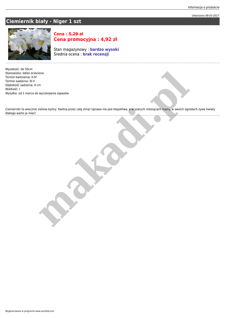 Informacje o produkcie Utworzono 08-03-2017 Ciemiernik biały - Niger 1 szt Cena : 5,29 zł Cena promocyjna : 4,92 zł Stan magazynowy : bardzo wysoki Średnia ocena : brak recenzji i.p l Wysokość: do 50cm Stanowisko: lekko ocienione Termin kwitnienia: II-IV Termin sadzenia: III-V Głębokość sadzenia: 4 cm Wielkość: I Wysyłka: od 1 marca do wyczerpania zapasów m ak ad Ciemierniki to wiecznie zielone byliny. Kwitną przez całą zimę! Uprawa nie jest kłopotliwa, a w szarych miesiącach mamy w swoich ogrodach żywe kwiaty dlatego warto je mieć! Wygenerowano w programie www.oscGold.com