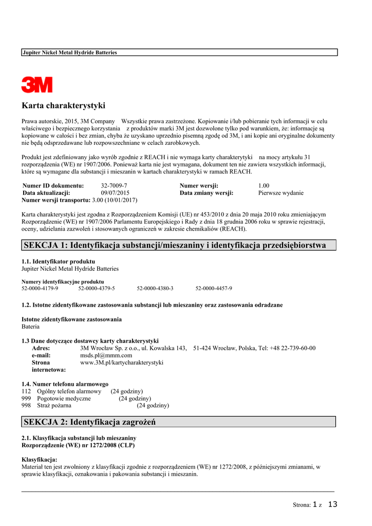 Jupiter Nickel Metal Hydride Batteries Karta charakterystyki Prawa autorskie, 2015, 3M Company Wszystkie prawa zastrzeżone. Kopiowanie i/lub pobieranie tych informacji w celu właściwego i bezpiecznego korzystania z produktów marki 3M jest dozwolone tylko pod warunkiem, że: informacje są kopiowane w całości i bez zmian, chyba że uzyskano uprzednio pisemną zgodę od 3M, i ani kopie ani oryginalne dokumenty nie będą odsprzedawane lub rozpowszechniane w celach zarobkowych. Produkt jest zdefiniowany jako wyrób zgodnie z REACH i nie wymaga karty charakterytyki na mocy artykułu 31 rozporządzenia (WE) nr 1907/2006. Ponieważ karta nie jest wymagana, dokument ten nie zawiera wszystkich informacji, które są wymagane dla substancji i mieszanin w kartach charakterystyki w ramach REACH. Numer ID dokumentu: 32-7009-7 Data aktualizacji: 09/07/2015 Numer wersji transportu: 3.00 (10/01/2017) Numer wersji: Data zmiany wersji: 1.00 Pierwsze wydanie Karta charakterystyki jest zgodna z Rozporządzeniem Komisji (UE) nr 453/2010 z dnia 20 maja 2010 roku zmieniającym Rozporządzenie (WE) nr 1907/2006 Parlamentu Europejskiego i Rady z dnia 18 grudnia 2006 roku w sprawie rejestracji, oceny, udzielania zazwoleń i stosowanych ograniczeń w zakresie chemikaliów (REACH). SEKCJA 1: Identyfikacja substancji/mieszaniny i identyfikacja przedsiębiorstwa 1.1. Identyfikator produktu Jupiter Nickel Metal Hydride Batteries Numery identyfikacyjne produktu 52-0000-4179-9 52-0000-4379-5 52-0000-4380-3 52-0000-4457-9 1.2. Istotne zidentyfikowane zastosowania substancji lub mieszaniny oraz zastosowania odradzane Istotne zidentyfikowane zastosowania Bateria 1.3 Dane dotyczące dostawcy karty charakterystyki Adres: 3M Wrocław Sp. z o.o., ul. Kowalska 143, e-mail: [email protected] Strona www.3M.pl/kartycharakterystyki internetowa: 51-424 Wrocław, Polska, Tel: +48 22-739-60-00 1.4. Numer telefonu alarmowego 112 Ogólny telefon alarmowy (24 godziny) 999 Pogotowie medyczne (24 godziny) 998 Straż pożarna (24 godziny) SEKCJA 2: Identyfikacja zagrożeń 2.1. Klasyfikacja substancji lub mieszaniny Rozporządzenie (WE) nr 1272/2008 (CLP) Klasyfikacja: Materiał ten jest zwolniony z klasyfikacji zgodnie z rozporządzeniem (WE) nr 1272/2008, z późniejszymi zmianami, w sprawie klasyfikacji, oznakowania i pakowania substancji i mieszanin. __________________________________________________________________________________________ Strona: 1 z 13 Jupiter Nickel Metal Hydride Batteries 2.2. Elementy oznakowania Rozporządzenie (WE) nr 1272/2008 (CLP) Nie dotyczy 2.3. Inne zagrożenia Nieznane SEKCJA 3: Skład/informacja o składnikach Nazwa substancji Nikiel Nr CAS 7440-02-0 Nr WE Stężenie % EINECS 23130 - 45 111-4 Klasyfikacja Skin Sens. 1, H317; Carc. 2, H351; STOT RE 1, H372; Aquatic Chronic 3, H412 - Nota 7,S (CLP) Aquatic Acute 1, H400,M=1 (Klasyfikacja 3M) Żelazo 7439-89-6 EINECS 231096-4 15 - Substancja niesklasyfikowana jako niebezpieczna. Glin, proszek(niestabilizowany) 7429-90-5 7 - 15 Flam. Sol. 1, H228; Water-react. 2, H261 - Nota T (CLP) Woda 7732-18-5 EINECS 231072-3 EINECS 231791-2 4- 9 Tworzywo sztuczne (Poliamid PA / PP, EPDM, Polietylen, PCV) Brak Brak 1- 5 Substancja niesklasyfikowana jako niebezpieczna. Niesklasyfikowany jako niebezpieczny. POTAS 7440-09-7 EINECS 231119-8 1- 5 SÓD 7440-23-5 EINECS 231132-9 1- 5 WODOROTLWNEK NIKLU 12054-48-7 EINECS 235008-5 1- 5 LIT 7439-93-2 EINECS 231102-5 1- 5 WODOROTLENEK KOBALTU(II) 21041-93-0 EINECS 244166-4 1- 5 30 Water reactive 1, H260; EUH014; Skin Corr. 1B, H314 (CLP) Aquatic Chronic 3, H412 (Klasyfikacja 3M) Water reactive 1, H260; EUH014; Skin Corr. 1B, H314 (CLP) Acute Tox. 4, H332; Acute Tox. 4, H302; Skin Irrit. 2, H315; Resp. Sens. 1, H334; Skin Sens. 1, H317; Muta. 2, H341; Carc. 1A, H350i; Repr. 1B, H360D; STOT RE 1, H372; Aquatic Acute 1, H400,M=1; Aquatic Chronic 1, H410,M=1 (CLP) Water reactive 1, H260; EUH014; Skin Corr. 1B, H314 (CLP) Aquatic Chronic 2, H411 (Klasyfikacja 3M) Substancja niesklasyfikowana jako niebezpieczna. __________________________________________________________________________________________ Strona: 2 z 13 Jupiter Nickel Metal Hydride Batteries Wodorotlenek potasu 1310-58-3 EINECS 215181-3 1- 5 WODOROTLENEK LITU 1310-65-2 EINECS 215183-4 1- 5 Kobalt 7440-48-4 EINECS 231158-0 1- 5 Wodorotlenek sodu 1310-73-2 EINECS 215185-5 1- 5 Mangan 7439-96-5 EINECS 231105-1 0- 2 Acute Tox. 3, H301; Skin Corr. 1A, H314 (CLP) Met. Corr. 1, H290 (Klasyfikacja 3M) Acute Tox. 3, H301; Skin Corr. 1B, H314; STOT SE 3, H335; Aquatic Chronic 3, H412 (Klasyfikacja 3M) Resp. Sens. 1, H334; Skin Sens. 1, H317; Aquatic Chronic 4, H413 (CLP) Skin Corr. 1A, H314 (CLP) Met. Corr. 1, H290 (Klasyfikacja 3M) Substancja z określoną na poziomie Wspólnoty wartością najwyższego dopuszczalnego stężenia w środowisku pracy. W sekcji 16 znajduje się pełny tekst zwrotów H użytych w powyższej tabeli. W sekcji 15 znajdują się obowiązujące rozporządzenia, które zostały zastosowane do powyższych komponentów. Informacje dotyczące najwyższych dopuszczalnych stężeń i substancji PBT i vPvB znajdują się w sekcji 8 i 12 karty charakterystyki. SEKCJA 4: Środki pierwszej pomocy 4.1. Opis środków pierwszej pomocy Drogi oddechowe Nie przewiduje się konieczności udzielania pierwszej pomocy. Kontakt ze skórą Nie przewiduje się konieczności udzielania pierwszej pomocy. Kontakt z oczami Nie przewiduje się konieczności udzielania pierwszej pomocy. W przypadku połknięcia: Nie przewiduje się konieczności udzielania pierwszej pomocy. 4.2. Najważniejsze ostre i opóźnione objawy oraz skutki narażenia Patrz Sekcja 11.1 Informacje dotyczące skutków toksykologicznych 4.3. Wskazania dotyczące wszelkiej natychmiastowej pomocy lekarskiej i szczególnego postępowania z poszkodowanym Nie dotyczy SEKCJA 5: Postępowanie w przypadku pożaru 5.1. Środki gaśnicze W przypadku pożaru: Użyć stosowny środek gaśniczy dla gaszenia. zwyczajnych m