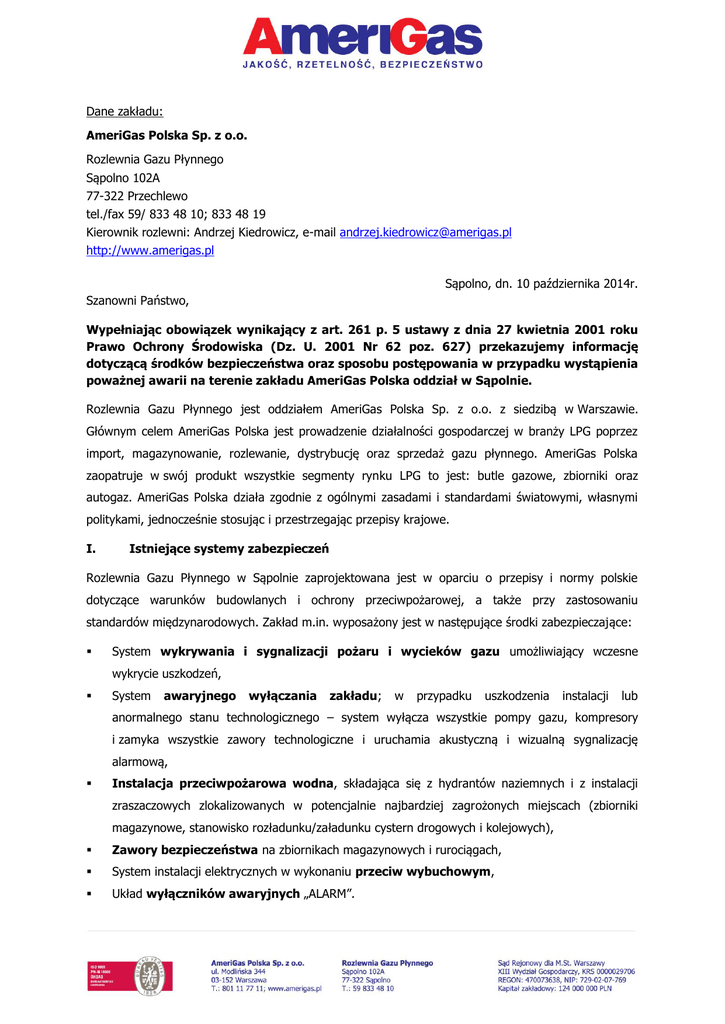 Dane zakładu: AmeriGas Polska Sp. z o.o. Rozlewnia Gazu Płynnego Sąpolno 102A 77-322 Przechlewo tel./fax 59/ 833 48 10; 833 48 19 Kierownik rozlewni: Andrzej Kiedrowicz, e-mail [email protected] http://www.amerigas.pl Sąpolno, dn. 10 października 2014r. Szanowni Państwo, Wypełniając obowiązek wynikający z art. 261 p. 5 ustawy z dnia 27 kwietnia 2001 roku Prawo Ochrony Środowiska (Dz. U. 2001 Nr 62 poz. 627) przekazujemy informację dotyczącą środków bezpieczeństwa oraz sposobu postępowania w przypadku wystąpienia poważnej awarii na terenie zakładu AmeriGas Polska oddział w Sąpolnie. Rozlewnia Gazu Płynnego jest oddziałem AmeriGas Polska Sp. z o.o. z siedzibą w Warszawie. Głównym celem AmeriGas Polska jest prowadzenie działalności gospodarczej w branży LPG poprzez import, magazynowanie, rozlewanie, dystrybucję oraz sprzedaż gazu płynnego. AmeriGas Polska zaopatruje w swój produkt wszystkie segmenty rynku LPG to jest: butle gazowe, zbiorniki oraz autogaz. AmeriGas Polska działa zgodnie z ogólnymi zasadami i standardami światowymi, własnymi politykami, jednocześnie stosując i przestrzegając przepisy krajowe. I. Istniejące systemy zabezpieczeń Rozlewnia Gazu Płynnego w Sąpolnie zaprojektowana jest w oparciu o przepisy i normy polskie dotyczące warunków budowlanych i ochrony przeciwpożarowej, a także przy zastosowaniu standardów międzynarodowych. Zakład m.in. wyposażony jest w następujące środki zabezpieczające: System wykrywania i sygnalizacji pożaru i wycieków gazu umożliwiający wczesne wykrycie uszkodzeń, System awaryjnego wyłączania zakładu; w przypadku uszkodzenia instalacji lub anormalnego stanu technologicznego – system wyłącza wszystkie pompy gazu, kompresory i zamyka wszystkie zawory technologiczne i uruchamia akustyczną i wizualną sygnalizację alarmową, Instalacja przeciwpożarowa wodna, składająca się z hydrantów naziemnych i z instalacji zraszaczowych zlokalizowanych w potencjalnie najbardziej zagrożonych miejscach (zbiorniki magazynowe, stanowisko rozładunku/załadunku cystern drogowych i kolejowych), Zawory bezpieczeństwa na zbiornikach magazynowych i rurociągach, System instalacji elektrycznych w wykonaniu przeciw wybuchowym, Układ wyłączników awaryjnych „ALARM”. Zgodnie z wymaganiami Prawa Ochrony Środowiska, Rozlewnia Gazu Płynnego w Sąpolnie posiada opracowany Program Zapobiegania Poważnym Awariom Przemysłowym, Raport o Bezpieczeństwie oraz Wewnętrzny Plan Operacyjno-Ratowniczy. Firma AmeriGas pragnie być kojarzona z najwyższymi standardami bezpieczeństwa dlatego wdrożyła system Zarządzania Bezpieczeństwem spełniający wymagania polskiej normy PN-N-18001:2004 oraz brytyjskiej normy OHSAS 18001:2007 w zakresie magazynowania, napełniania, sprzedaży i dystrybucji gazu płynnego (LPG) w butlach i zbiornikach ciśnieniowych. Dodatkowo utrzymujemy czynny 24 h na dobę telefon alarmowy, pod którym dyżurują specjaliści ds. technicznych i bezpieczeństwa służący pomocą w sytuacjach awaryjnych. Obecność tych systemów powoduje, że pracownicy rozlewni gazu oraz jej sąsiedzi mogą być spokojni o własne bezpieczeństwo. II. Sposób postępowania w przypadku wystąpienia awarii Uprzejmie informujemy, iż wystąpienie poważnej awarii w Rozlewni Gazu Płynnego w Sąpolnie, sygnalizowane jest za pomocą wewnętrznego dźwiękowego systemu alarmowego, który może być słyszalny w budynkach bezpośrednio sąsiadujących z rozlewnią. Ogłoszenie alarmu na terenie rozlewni sygnalizuje włączenie syreny alarmowej charakteryzującej się ciągłym dźwiękiem trwającym powyżej 20s, nie krócej niż minuta. Dźwięk ciągły trwający powyżej 20 s (nie krócej niż 1 minuta) W przypadku przybycia na teren zakładu jednostek ratowniczych, nadzór nad prowadzeniem akcji ratowniczej przejmuje Państwowa Straż Pożarna, która może uruchomić własny system alarmowy informujący o powstaniu poważnej awarii. Sposób ogłaszania alarmu przez służby ratownicze w przypadku wystąpienia awarii przemysłowej ZA POMOCĄ SYREN PRZY POMOCY FUNKCJONARIUSZY POLICJI I OSP, ROZGŁOŚNI RADIOWYCH ORAZ OŚRODKÓW TELEWIZJI Dźwięk ciągły trwający 3 minuty Powtarzana trzykrotnie zapowiedź słowna informacji o zagrożeniu i sposobie postępowania mieszkańców. Zgodnie z zaleceniami Państwowej Straży Pożarnej oraz na podstawie Zarządzenia Nr 1/C/2011 Szefa Obrony Cywilnej – Wójta Gminy Przechlewo, z dnia 14 marca 2011 r. w razie wystąpienia niebezpiecznego zdarzenia zostaną Państwo poinformowani o ewakuacji z miejsca zamieszkania przez funkcjonariuszy Policji, bądź Straży Pożarnej z OSP Przechlewo, a następnie zostaniecie Państwo przewiezieni autobusem do Ośrodka Sportu i Rekreacji w Przechlewie przy ul. Człuchowskiej 60 na czas niezbędny do usunięcia zagrożenia. Po ogłoszeniu ewakuacji, przed opuszczeniem mieszkania należy: o zamknąć zawór gazu w mieszkaniu; o wyłączyć bezpieczniki elektryczne; o odciąć dopływ wody do mieszkania; o zabezpieczyć osoby niepełnoletnie w tabliczki identyfikacyjne; o zabrać ze sobą odzież wierzchnią, dokumenty tożsamości, leki itp. o pozamykać okna i drzwi; o wygasić i nie używać otwartych źródeł ognia; o nie zbliżać się do rejonu katastrofy; o bezwzględnie wykonywać polecenia wydawane przez lokalne władze lub służby ratownicze; o w razie potrzeby pomóc w ewakuacji osobom o zmniejszonej sprawności ruchowej WYKAZ TELEFONÓW ALARMOWYCH DO SŁUŻB ODPOWIEDZIALNYCH ZA PODJĘCIE DZIAŁAŃ OPERACYJNO-RATOWNICZYCH : Pogotowie Ratunkowe 999 lub 112, Straż pożarna 998 lub 112, Policja 997 lub 112, Pogotowie wodociągowe 994 Pogotowie gazowe 992 Pogotowie energetyczne 991 Telefon alarmowy AmeriGas Polska 22 519 19 59