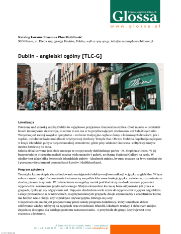 Katalog kursów Erasmus Plus Mobilność SJO Glossa, ul. Dietla 103, 31-031 Kraków, Polska, +48 12 429 40 51, [email protected] Dublin - angielski ogólny [TLC-G] Lokalizacja Położony nad szeroką zatoką Dublin to wyjątkowo przyjemna i kameralna stolica. Choć miasto w ostatnich latach intensywnie się rozwija, to mimo to nie ma w tu przytłaczających wieżowców ani hałaśliwych ulic. Wszystko jest raczej swojskie i przytulne - zarówno tradycyjne ceglane domy o kolorowych drzwiach, jak i wąskie, ozdobione kwiatami uliczki artystycznej dzielnicy Temple Bar. Obrazu Dublina dopełniają najlepsze w kraju irlandzkie puby o niepowtarzalnej atmosferze, gdzie przy szklance Guinessa i celtyckiej muzyce można bawić się do rana. Szkoła zlokalizowana jest obok znanego ze swojej urody dublińskiego parku - St. Stephen's Green. W jej bezpośrednim otoczeniu znaleźć można wiele muzeów i galerii, ze słynną National Gallery na czele. W okolicy jest także kilka świetnych irlandzkich pubów - idealnych miejsc, by przy muzyce na żywo spotkać się i porozmawiać z innymi uczestnikami kursów i dublińczykami. Program szkolenia Tematyka kursu skupia się na budowaniu umiejętności efektywnej komunikacji w języku angielskim. W tym celu w ramach zajęć równomiernie ćwiczone są wszystkie kluczowe funkcje języka: mówienie, rozumienie ze słuchu, pisanie i czytanie. W trakcie kursu szczególny nacisk jest kładziony na doskonalenie płynności wypowiedzi i rozumienia języka mówionego. Stałym elementem kursu są takie aktywności jak praca w grupach, dyskusje czy odgrywanie ról. Dają one studentom wiele szans do wypowiedzi w języku angielskim. Lekcje prowadzone są w niewielkich, międzynarodowych grupach, dzięki czemu każdy z uczestników kursu ma bardzo wiele okazji, aby w praktyce używać języka, którego się uczy. Uzupełnieniem nauki jest proponowany przez szkołę program dodatkowy, który umożliwia dalsze szlifowanie wiedzy zdobytej na zajęciach oraz zwiedzanie Irlandii, lokalnych tradycji i ciekawych miejsc. Zajęcia są dostępne dla każdego poziomu zaawansowania - o przydziale do grupy decyduje test oraz rozmowa z lektorem. 1 c=1211 [TLC-G] Długość i termin szkolenia Szkolenie trwa 2 tygodnie i obejmuje 20 lub 26 lub 30×50 min. zajęć tygodniowo. Daty rozpoczecia: dowolny poniedziałek. Dostępne opcje Poniżej przedstawiamy orientacyjne koszty pakietów kurs+zakwaterowanie, przeliczone na walutę rozliczeń grantu tj. EUR. Propozycje te uwzględniają dozwolone przesunięcia środków między poszczególnymi kategoriami wydatków, tak aby całość kosztów była pokryta z grantu. W kolumnie kieszonkowe podana jest szacunkowa kwota, jaka pozostanie na dodatkowe wyżywienie, dojazdy komunikacją miejską itp w zależności od wybranej opcji zakwaterowania. Wydatki z kieszonkowego nie wymagają dokumentowania rachunkami. 2 tyg. kieszonkowe kurs (20×50 min./tydz.)+rodzina, pokój 1-osobowy, pełne wyżywienie 935 EUR 1333 EUR kurs (20×50 min./tydz.)+rodzina, pokój 1-osobowy, dwa posiłki 905 EUR 1363 EUR Istnieje możliwość zamówienia samego kursu (20×50 min./tydz.) w cenie 510 EUR, w takim przypadku na utrzymanie i kieszonkowe pozostanie do dyspozycji kwota 1758 EUR. 2 tyg. kieszonkowe kurs (26×50 min./tydz.)+rodzina, pokój 1-osobowy, pełne wyżywienie 1015 EUR 1253 EUR kurs (26×50 min./tydz.)+rodzina, pokój 1-osobowy, dwa posiłki 985 EUR 1283 EUR Istnieje możliwość zamówienia samego kursu (26×50 min./tydz.) w cenie 590 EUR, w takim przypadku na utrzymanie i kieszonkowe pozostanie do dyspozycji kwota 1678 EUR. 2 tyg. kieszonkowe kurs (30×50 min./tydz.)+rodzina, pokój 1-osobowy, pełne wyżywienie 1095 EUR 1173 EUR kurs (30×50 min./tydz.)+rodzina, pokój 1-osobowy, dwa posiłki 1065 EUR 1203 EUR Istnieje możliwość zamówienia samego kursu (30×50 min./tydz.) w cenie 670 EUR, w takim przypadku na utrzymanie i kieszonkowe pozostanie do dyspozycji kwota 1598 EUR. Cennik Poniżej podane są ceny kursu i opcji zakwaterowania w oryginalnej walucie kursu, które obowiązują w rozliczeniach z SJO GLOSSA. 2 tyg. kurs (20×50 min./tydz.) 510 EUR kurs (20×50 min./tydz.) + rodzina, pokój 1-osobowy, pełne wyżywienie 935 EUR kurs (20×50 min./tydz.) + rodzina, pokój 1-osobowy, dwa posiłki 905 EUR 2 tyg. kurs (26×50 min./tydz.) 590 EUR kurs (26×50 min./tydz.) + rodzina, pokój 1-osobowy, pełne wyżywienie 1015 EUR kurs (26×50 min./tydz.) + rodzina, pokój 1-osobowy, dwa posiłki 985 EUR 2 tyg. kurs (30×50 min./tydz.) 670 EUR kurs (30×50 min./tydz.) + rodzina, pokój 1-osobowy, pełne wyżywienie 1095 EUR kurs (30×50 min./tydz.) + rodzina, pokój 1-osobowy, dwa posiłki 1065 EUR 2 c=1211 [TLC-G] Uwaga: 1. Grant Erasmus+ obejmuje także kwotę 350 EUR na każdego uczestnika projektu. Wg informacji uzyskanych z Agencji Narodowej istnieje możliwość przesunięcia tych pieniędzy na dopłatę do kosztów kursu - w przypadku wyboru droższego kursu. 2. Szczegółowe informacje na temat kwot przyznawanych grantów można znaleźć tutaj. 3. Obowiązują dopłaty sezonowe w okresie: 3 c=1211 [TLC-G]