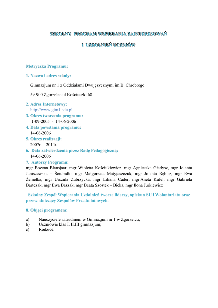 SSZ ZK KO OL LN NY Y PPR RO OG GR RA AM MW WSSPPIIE ER RA AN NIIA AZ ZA AIIN NT TE ER RE ESSO OW WA AŃ Ń II U UZ ZD DO OL LN NIIE EŃ ŃU UC CZ ZN NIIÓ ÓW W Metryczka Programu: 1. Nazwa i adres szkoły: Gimnazjum nr 1 z Oddziałami Dwujęzycznymi im B. Chrobrego 59-900 Zgorzelec ul Kościuszki 68 2. Adres Internetowy: http://www.gim1.edu.pl 3. Okres tworzenia programu: 1-09-2005 - 14-06-2006 4. Data powstania programu: 14-06-2006 5. Okres realizacji: 2007r. – 2014r. 6. Data zatwierdzenia przez Radę Pedagogiczną: 14-06-2006 7. Autorzy Programu: mgr Bożena Blansjaar, mgr Wioletta Kościukiewicz, mgr Agnieszka Gładysz, mgr Jolanta Janiszewska – Ściubidło, mgr Małgorzata Matyjaszczuk, mgr Jolanta Rębisz, mgr Ewa Żemełka, mgr Urszula Zubrzycka, mgr Liliana Cader, mgr Aneta Kufel, mgr Gabriela Bartczak, mgr Ewa Baszak, mgr Beata Szostek – Bicka, mgr Ilona Jurkiewicz Szkolny Zespół Wspierania Uzdolnień tworzą liderzy, opiekun SU i Wolontariatu oraz przewodniczący Zespołów Przedmiotowych. 8. Objęci programem: a) b) c) Nauczyciele zatrudnieni w Gimnazjum nr 1 w Zgorzelcu; Uczniowie klas I, II,III gimnazjum; Rodzice. SSPPIISS T TR RE EŚŚC CII I II III IV V Wprowadzenie. Zasoby i możliwości szkoły. Schemat systemu: 1. Strategia szkoły w związku ze wspieraniem zainteresowań i uzdolnień; 2. Standardy; 3. Definicja ucznia zdolnego. Cele i sposoby realizacji programu. Zadania szkoły: 1. zadania Dyrektora, 2. zadania Rady Rodziców, 3. zadania lidera wspierania uzdolnień, 4. zadania zespołu wspierania uzdolnień, 5. zadania pedagoga, 6. zadania Samorządu Uczniowskiego, 7. zadania wychowawcy, 8. zadania nauczyciela przedmiotu, 9. zadania zespołów przedmiotowych, 10. zadania biblioteki, 11. zadania zespołu projektowego. 12. zadania stowarzyszenia VI VII VIII IX Działania podejmowane w zakresie wspierania uzdolnień i zainteresowań. System przepływu informacji na temat pracy z uzdolnieniami. Dodatkowa oferta edukacyjna dla uczniów uzdolnionych. Sposoby pozyskiwania funduszy na rozwijanie zainteresowań i uzdolnień. X XI XII XIII Współpraca z lokalnym środowiskiem samorządowym i oświatowym. Ewaluacja. Bibliografia Wykaz przepisów i uchwał. II W WPPR RO OW WA AD DZ ZE EN NIIE E Tworząc Program Wspierania Zainteresowań i Uzdolnień mamy świadomość, że najważniejszą zasadą, rządzącą oddziaływaniami pedagogicznymi, powinno być podmiotowe i zindywidualizowane traktowanie uczniów, w tym także uczniów szczególnie uzdolnionych. Program Wspierania Zainteresowań i Uzdolnień Uczniów powstał w wyniku głębokiego przekonania, że nauczyciele Gimnazjum nr 1 im. B. Chrobrego w Zgorzelcu od wielu lat realizują cele zapisane w niniejszym programie. Włączenie naszego gimnazjum do Dolnośląskiej Sieci Szkół Wspierających Zainteresowania i Uzdolnienia Uczniów będzie uwieńczeniem wysiłku, jaki podjęliśmy, by uporządkować i usystematyzować działania w aspekcie diagnozowania uzdolnień, analizy potrzeb oraz oczekiwań uczniów i ich rodziców w celu przygotowania właściwej oferty edukacyjnej. Powodzenie programu leży w monitorowaniu postępów jego wdrażania oraz gromadzeniu i analizowaniu wyników badania efektywności pracy dydaktycznowychowawczej. Uzyskane w wyniku ewaluacji dane, pozwolą na podniesienie wyników kształcenia. Zgodność wyników sprawdzianów zewnętrznych z wynikami klasyfikacji, dostarczy wiedzy o właściwym kierunku procesu dydaktyczno- wychowawczego. Analiza końcowa wdrażania szkolnego programu (na koniec 3-letniego cyklu edukacyjnego) pozwoli ostatecznie ustalić czy program przyniósł korzyści całemu środowisku. W diagnozie uzdolnień i zainteresowań wykorzystujemy: test inteligencji wielorakiej, badanie stylu uczenia się, ankietę do rodziców i ankietę do ucznia, wyniki sprawdzianów po szkole podstawowej oraz obserwację. Część potrzebnych danych zdobywamy podczas trzydniowych zajęć uczniów klas pierwszych z wychowawcą i pedagogiem. Zajęcia te odbywają się poza szkołą. Integrują zespół klasowy i pozwalają nauczycielowi lepiej poznać swoich wychowanków. Uczestniczymy w projektach o charakterze międzynarodowym czy ogólnopolskim, by uatrakcyjnić zajęcia pozalekcyjne a także zdobyć środki finansowe na realizację zaplanowanych z młodzieżą zadań. Pracujemy nad podniesieniem swoich kwalifikacji i kompetencji w zakresie psychologicznego wspierania uczniów uzdolnionych oraz metod nauczania w obrębie wykładanego przedmiotu, wspomagających rozwój zainteresowań i uzdolnień uczniów. Promujemy osiągnięcia uczniów w środowisku szkolnym i lokalnym (prasa, telewizja) i motywujemy do działania m.in. poprzez Festiwal Talentów i system stypendialny. Wychodzimy z założenia, że każdy uczeń jest zdolny a nasze zadanie polega na zdiagnozowaniu i wspieraniu ucznia w jego indywidualnym rozwoju. Wdrożenie i realizacja Szkolnego Programu Wspierania Zainteresowań i Uzdolnień mają swoje uzasadnienie w trosce o wszechstronny rozwój ucznia, promocję placówki w środowisku, sprostanie wymogom nowoczesnej szkoły, bezpieczeństwo fizyczne i psychiczne dzieci, ochronę przed negatywnymi wpływami środowiska i zapewnienie alternatywnych form spędzania wolnego czasu. IIII Z ZA ASSO OB BY Y II M MO OŻ ŻL LIIW WO OŚŚC CII SSZ ZK KO OŁ ŁY Y 1. Liczba uczniów ogółem: 379 uczniów w 14 oddziałach, po 5 na poziomie klas drugich i trzecich oraz 4 klasy pierwsze. - Klasa sportowa, -Klasa dwujęzyczna z językiem angielskim, -W szkole pracuje 37 nauczycieli, w tym 13 dwuprzedmiotowców. Jedna nauczycielka posiada uprawnienia do nauczania w języku angielskim i w języku niemieckim. 2. Możliwości szkoły w zakresie kadry pedagogicznej: - przygotowani nauczyciele, - autorzy programów edukacyjnych, - nauczyciele dyplomowani, - doradca zawodowy, - lider WDN, - liderzy wspierania uzdolnień, - twórczy nauczyciele, - pedagodzy, - psycholog. 3. Możliwości szkoły: - 2 sa