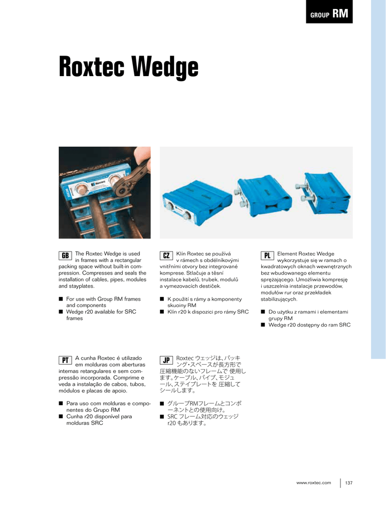 GROUP RM Roxtec Wedge The Roxtec Wedge is used GB in frames with a rectangular packing space without built-in compression. Compresses and seals the installation of cables, pipes, modules and stayplates. For use with Group RM frames and components Wedge r20 available for SRC frames A cunha Roxtec é utilizado PT em molduras com aberturas internas retangulares e sem compressão incorporada. Comprime e veda a instalação de cabos, tubos, módulos e placas de apoio. Para uso com molduras e compo- nentes do Grupo RM Cunha r20 disponível para molduras SRC Klín Roxtec se používá CZ v rámech s obdélníkovými vnitřními otvory bez integrované komprese. Stlačuje a těsní instalace kabelů, trubek, modulů a vymezovacích destiček. K použití s rámy a komponenty skuoiny RM Klín r20 k dispozici pro rámy SRC Element Roxtec Wedge PL wykorzystuje się w ramach o kwadratowych oknach wewnętrznych bez wbudowanego elementu sprężającego. Umożliwia kompresję i uszczelnia instalacje przewodów, modułów rur oraz przekładek stabilizujących. Do użytku z ramami i elementami grupy RM Wedge r20 dostępny do ram SRC JP Roxtec ウェッジは、 パッキ ング・スペースが長方形で 圧縮機能のないフレームで 使用し ます。 ケーブル、 パイプ、 モジュ ール、 ステイプレートを 圧縮して シールします。 グループRMフレームとコンポ ーネントとの使用向け。 SRC フレーム対応のウェッジ r20 もあります。 www.roxtec.com 137 GROUP RM Wedge kit/parts, galvanized Kompresní sada/části, galvanizované Wedge kit/części, stal galwanizowana Kits Cunha/peças, galvanizado 亜鉛メッキウェッジ・キット/部品 Wedge kit galv Wedge 120 galv Wedge 60 galv CZ Vnější rozměry Váha Kompresní klín W (mm) W (in) (kg) (lb) PL PT Wymiary zewnętrzne Ciężar Wedge W (mm) W (in) (kg) (lb) Dim. externas Peso Cunha W (mm) W (polegadas) (kg) (libra) Nº art. JP ウェッジ W (mm) 品番 GB Wedge External dimensions W (mm) W (in) 外形寸法 W(インチ) (kg) 重量 (ポンド) Weight (kg) (lb) Označení výrobku Kod art. Art. No. Wedge kit galv* (wedge) 120 (wedge) 4.724 1.5 3.307 AWK0001201018 Wedge 120 galv 120 4.724 0.8 1.764 ARW0001201018 Wedge 60 galv 60 2.362 0.4 0.882 ARW0000601018 * The Wedge kit includes one Roxtec Wedge 120, five Stayplates, one Wedge Clip, one Lubricant and installation instructions. Kompresní sada obsahuje klín Roxtec 120, pět vymezovacích destiček, lubrikant a návod k instalaci. W skład Wedge kit wchodzi jeden Roxtec wedge 120, pięć przekładek, jeden środek smarny i instrukcja instalacji. O kit Cunha inclui uma Cunha Roxtec 120, cinco Stayplates, um Clip Cunha, um Lubrificante e instruções de instalação. ウエッジ・キットには、Roxtecウェッジ120が1個、 ステイプレートプレートが5個、 ウェッジ・クリップが 1 個、潤滑油が1個および 取付説明書が入っています。 h2 h1 d2 d1 Compressed Stlačený / Uszczelnianie / Comprimido / 圧縮状態 c c W Wedge 120 138 Uncompressed Nestlačený / Rozszczelnianie / Descomprimido / 非圧縮状態 www.roxtec.com Pos (mm) (in) d1 109 4.291 d2 130 5.118 h1 48 1.890 h2 29 1.142 c SW 13 SW 0.512 W Wedge 60 Note: All dimensions are nominal values Poznámka: všechny uvedené rozměry jsou v nominální hodnotě Uwaga: Wszystkie podane wymiary mają wartości nominalne Nota: Todas as dimensões são valores nominais 注:寸法はすべて公称値です。 GROUP RM Wedge r20 for SRC frames Kompresní klín r20 pro SRC rámy Wedge r20 dla ram SRC Cunha r20 para Molduras SRC SRCフレーム用ウエッジ r20 Wedge 20LR 120 AISI 316 Wedge 20LR 120 galv CZ Zaoblený rohVnější rozměry Váha Kompresní klín Levý Pravý W (mm) W (in) (kg) (lb) PL PT Wedge Cunha JP ウェッジ GB Rounded corner Wedge Left Right Označení výrobku Rogi zaokrąglone Wymiary zewnętrzne Ciężar Lewy Prawy W (mm) W (in) (kg) (lb) Canto arredondado Dim. externas Peso Esquerda Direita W (mm) W (polegadas) (kg) (libra) 左 丸角 右 外形寸法 W (mm) W (インチ) External dimensions W (mm) W (in) Kod art. Nº art. 重量 (kg) (ポンド) 品番 Weight (kg) (lb) Art. No. x x 120 4.724 0.81.764 5ARW000001851 Wedge 20LR 120 AISI 316 x x 120 4.724 0.81.764 5ARW000004146 d1 Compressed Stlačený / Uszczelnianie/ Comprimido / 圧縮状態 h2 h1 Wedge 20LR 120 galv d2 Uncompressed Nestlačený / Rozszczelnianie/ Descomprimido / 非圧縮状態 Pos (mm) (in) d1 109 4.291 d2 130 5.118 h1 48 1.890 h2 29 1.142 c SW 13 SW 0.512 c W Wedge 120 Note: All dimensions are nominal values Poznámka: všechny uvedené rozměry jsou v nominální hodnotě Uwaga: Wszystkie podane wymiary mają wartości nominalne Nota: Todas as dimensões são valores nominais 注:寸法はすべて公称値です。 www.roxtec.com 139 GROUP RM Wedge kit/parts, acid proof stainless steel Kompresní sada/části, kyselinovzdorná nerez ocel Wedge kit/części, kwasoodporna stal nierdzewna Kit Cunha/peças, aço inixodável à prova de ácido 耐酸性ステンレス鋼ウェッジ・キット/部品 Wedge kit AISI 316 Wedge 120 AISI 316 Wedge 60 AISI 316 CZ Vnější rozměry Váha Kompresní klín W (mm) W (in) (kg) (lb) PL PT Wymiary zewnętrzne Ciężar Wedge W (mm) W (in) (kg) (lb) Dim. externas Peso Cunha W (mm) W (polegadas) (kg) (libra) Nº art. JP ウェッジ 品番 GB External dimensions Weight Wedge W (mm) W (in) (kg) (lb) Art. No. Wedge kit AISI 316* (wedge) 120 (wedge) 4.724 1.5 3.307 AWK0001201021 Wedge 120 AISI 316 120 4.724 0.8 1.764 ARW0001201021 Wedge 60 AISI 316 60 2.362 0.4 0.882 ARW0000601021 W (mm) 外形寸法 W(インチ) (kg) 重量 (ポンド) Označení výrobku Kod art. * The Wedge kit includes one Roxtec Wedge 120, five Stayplates, one Wedge Clip, one Lubricant and installation instructions. Kompresní sada obsahuje klín Roxtec 120, pět vymezovacích destiček, lubrikant a návod k instalaci. W skład Wedge 