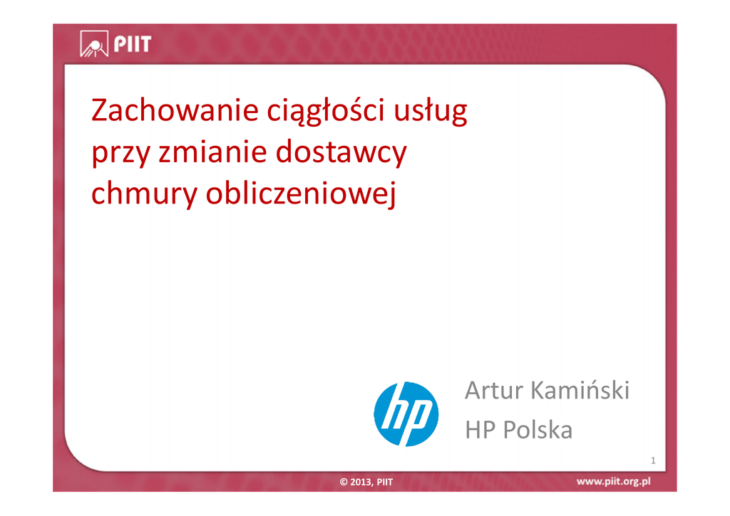Zachowanie ciągłości usług przy zmianie dostawcy chmury obliczeniowej Artur Kamiński HP Polska 1 © 2013, PIIT Plan ciągłość działania • • • • Identyfikacja kluczowych usług i infrastruktury Analiza zagrożeń i strategia działania Plan awaryjny Ciągłe doskonalenie • MTPOD (Maximum tolerable periods of disruption) • RTO • RPO 2 © 2013, PIIT Plan ciągłość działania a chmura • • • • • • Uzależnienie od jednego dostawcy chmury Uzależnienie od niezarządzanych elementów Plan ciągłości dostawcy Zrozumienie architektury dostawcy Dostosowanie aplikacji do modelu chmury Dodatkowe aspekty związane z dostawcą 3 © 2013, PIIT Zmiana dostawcy • • • • Myślenie o zmianie w chwili wyboru J IaaS, PaaS i SaaS a łatwość migracji Architektura musi wspierać elestyczność migracji Start usługi w chmurze pierwszym testem 4 © 2013, PIIT Otwarte standardy • • • • O możliwość wyboru trzeba zadbać Rozwiązania otwarte podstawą bezpieczeństwa Open Cloud Manifest OpenStack i inne projekty 5 © 2013, PIIT Przykład technologii • • • • hpcloud.com OpenStack jako podstawa Obszary autonomiczne Replikacja danych 6 © 2013, PIIT Modele migracji do chmury Artur Kamiński HP Polska 7 © 2013, PIIT Optymalny wybór • • • • • Oczekiwania odbiorców Jakie usługi Katalog usług Wybór dostawców (wewnętrzny/zewnętrzny) Technologia 8 © 2013, PIIT Model migracji • Dlaczego ? • Co? (IaaS, SaaS …) • Gdzie ? (prywatna, publiczna …) Technologia • Architektura, • Dostęp, • Bezpieczeństwo, Potrzeba • Procesy, • Aplikacje, • Plan migracji i testów, Realizacja 9 © 2013, PIIT Czynniki migracji • Korzyści (Opex/Capex, efektywność, skalowalność) • Rewolucja w komunikacji (P2P/Internet) • Technologie wirtualizacyjne 10 © 2013, PIIT Rodzaje środowisk • • • • • • • Chmura prywatna Chmura prywatna zarządzana przez dostawcę Chmura publiczna Chmura hybrydowa Chmura wspólnotowa (community cloud) Model tradycyjny Model tradycyjny + wirtualizacja 11 © 2013, PIIT Rodzaje usług • • • • • • IaaS PaaS SaaS CaaS DaaS ………. 12 © 2013, PIIT W czym możemy pomóc • • • • • • • HP Cloud Advisory Services HP Cloud Strategy Services HP Applications Transformation to Cloud HP Cloud Design Services HP Cloud Implementation Services HP Cloud Operation Services HP Cloud Education Services 13 © 2013, PIIT Dziękuje 14 © 2013, PIIT