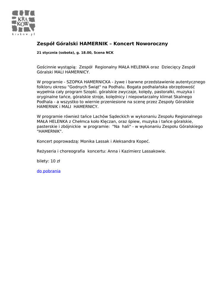 Zespół Góralski HAMERNIK – Koncert Noworoczny 21 stycznia (sobota), g. 18.00, Scena NCK Gościnnie wystąpią: Zespół Regionalny MAŁA HELENKA oraz Dziecięcy Zespół Góralski MALI HAMERNICY. W programie - SZOPKA HAMERNICKA - żywe i barwne przedstawienie autentycznego folkloru okresu "Godnych Świąt" na Podhalu. Bogata podhalańska obrzędowość wypełnia cały program Szopki. góralskie zwyczaje, kolędy, pastorałki, muzyka i oryginalne tańce, góralskie stroje, kolędnicy i niepowtarzalny klimat Skalnego Podhala - a wszystko to wiernie przeniesione na scenę przez Zespoły Góralskie HAMERNIK i MALI HAMERNICY. W programie również tańce Lachów Sądeckich w wykonaniu Zespołu Regionalnego MAŁA HELENKA z Chełmca koło Klęczan, oraz śpiew, muzyka i tańce góralskie, pasterskie i zbójnickie w programie: "Na hali" - w wykonaniu Zespołu Góralskiego "HAMERNIK". Koncert poprowadzą: Monika Lassak i Aleksandra Kopeć. Reżyseria i choreografia koncertu: Anna i Kazimierz Lassakowie. bilety: 10 zł do pobrania Powered by TCPDF (www.tcpdf.org)