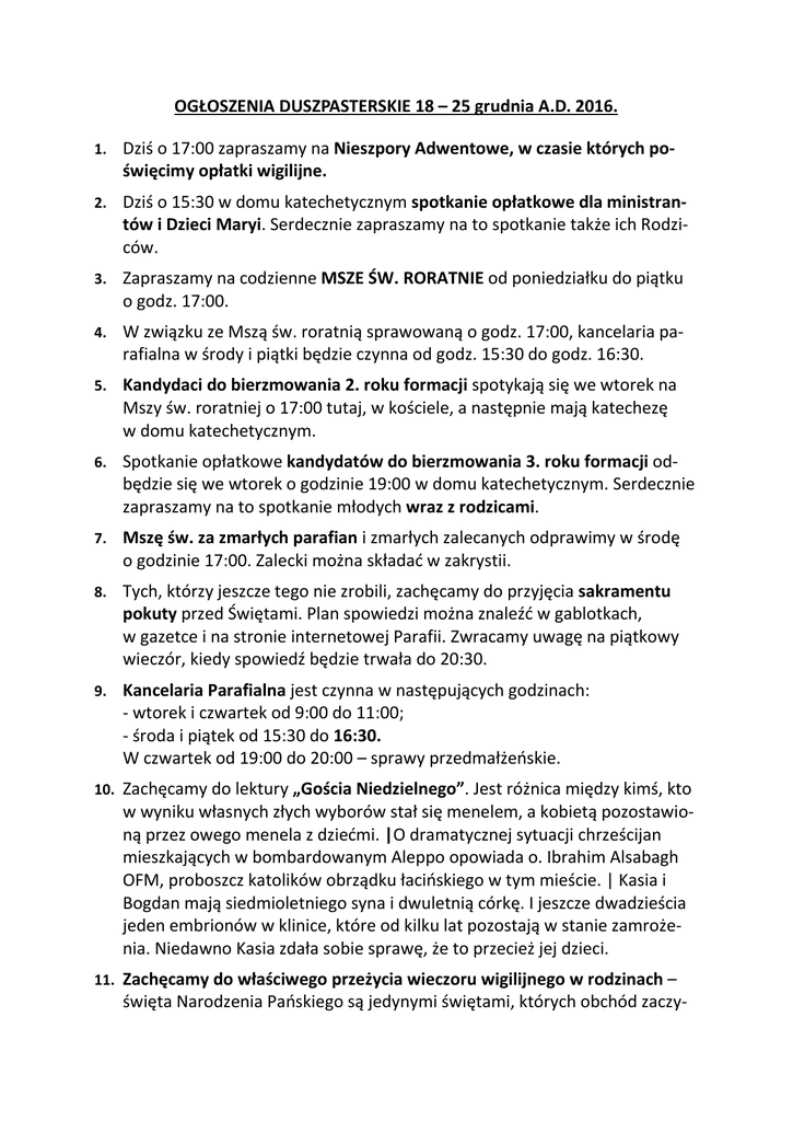 OGŁOSZENIA DUSZPASTERSKIE 18 – 25 grudnia A.D. 2016. 1. Dziś o 17:00 zapraszamy na Nieszpory Adwentowe, w czasie których poświęcimy opłatki wigilijne. 2. Dziś o 15:30 w domu katechetycznym spotkanie opłatkowe dla ministrantów i Dzieci Maryi. Serdecznie zapraszamy na to spotkanie także ich Rodziców. 3. Zapraszamy na codzienne MSZE ŚW. RORATNIE od poniedziałku do piątku o godz. 17:00. 4. W związku ze Mszą św. roratnią sprawowaną o godz. 17:00, kancelaria parafialna w środy i piątki będzie czynna od godz. 15:30 do godz. 16:30. 5. Kandydaci do bierzmowania 2. roku formacji spotykają się we wtorek na Mszy św. roratniej o 17:00 tutaj, w kościele, a następnie mają katechezę w domu katechetycznym. 6. Spotkanie opłatkowe kandydatów do bierzmowania 3. roku formacji odbędzie się we wtorek o godzinie 19:00 w domu katechetycznym. Serdecznie zapraszamy na to spotkanie młodych wraz z rodzicami. 7. Mszę św. za zmarłych parafian i zmarłych zalecanych odprawimy w środę o godzinie 17:00. Zalecki można składać w zakrystii. 8. Tych, którzy jeszcze tego nie zrobili, zachęcamy do przyjęcia sakramentu pokuty przed Świętami. Plan spowiedzi można znaleźć w gablotkach, w gazetce i na stronie internetowej Parafii. Zwracamy uwagę na piątkowy wieczór, kiedy spowiedź będzie trwała do 20:30. 9. Kancelaria Parafialna jest czynna w następujących godzinach: - wtorek i czwartek od 9:00 do 11:00; - środa i piątek od 15:30 do 16:30. W czwartek od 19:00 do 20:00 – sprawy przedmałżeńskie. 10. Zachęcamy do lektury „Gościa Niedzielnego”. Jest różnica między kimś, kto w wyniku własnych złych wyborów stał się menelem, a kobietą pozostawioną przez owego menela z dziećmi. |O dramatycznej sytuacji chrześcijan mieszkających w bombardowanym Aleppo opowiada o. Ibrahim Alsabagh OFM, proboszcz katolików obrządku łacińskiego w tym mieście. | Kasia i Bogdan mają siedmioletniego syna i dwuletnią córkę. I jeszcze dwadzieścia jeden embrionów w klinice, które od kilku lat pozostają w stanie zamrożenia. Niedawno Kasia zdała sobie sprawę, że to przecież jej dzieci. 11. Zachęcamy do właściwego przeżycia wieczoru wigilijnego w rodzinach – święta Narodzenia Pańskiego są jedynymi świętami, których obchód zaczy- namy tą „liturgią rodzinną”. Niech w naszych domach nie zabraknie przy wieczerzy wspólnej modlitwy, odczytania fragmentu Ewangelii, łamania się pobłogosławionym opłatkiem i śpiewu kolęd. Natomiast kompletnym nieporozumieniem byłaby przy wigilijnym stole obecność alkoholu. 12. Zapraszamy do włączenia się w Eucharystię w sobotę, o północy. Po roz- poczęciu Świąt rodzinną liturgią wieczerzy wigilijnej, przyjdźmy uczcić narodzonego Pana we wspólnocie parafialnej. 13. Duszpasterskie odwiedziny rodzin czyli tzw. kolęda rozpocznie się we wto- rek, 27 grudnia, zgodnie z planem wywieszonym na tablicach, w gazetce i na stronie internetowej. 14. Siostry po Mszach św. rozprowadzają opłatki, a Dzieci Maryi: kalendarze na nowy rok, lampiony roratnie, kartki świąteczne. 15. Bardzo serdecznie dziękujemy tym wszystkim, którzy w minionym tygodniu pomagali przy bieżących pracach, a także Paniom sprzątającym kościół i dom katechetyczny. Bardzo prosimy w tym tygodniu o pomoc w przygotowaniu kościoła na święta. 16. Kolekta zebrana w czasie Pasterki przeznaczona jest na Fundusz Obrony Ży- cia. Bóg zapłać za wszystkie składane ofiary.