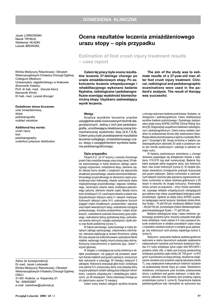 DONIESIENIA KLINICZNE Jacek LORKOWSKI Marek TRYBUS Waldemar H£ADKI Leszek BRONGEL Ocena rezultatów leczenia zmia¿d¿eniowego urazu stopy opis przypadku Estimation of foot crush injury treatment results case report Klinika Medycyny Ratunkowej i Obra¿eñ Wielonarz¹dowych II Katedry Chirurgii Ogólnej Collegium Medicum Uniwersytetu Jagielloñskiego w Krakowie (Kierownik Katedry: Prof. dr hab. med. Danuta Karcz Kierownik Kliniki: Dr hab. med. Leszek Brongel Dodatkowe s³owa kluczowe: uraz zmia¿d¿eniowy stopa pedobarografia rozk³ad nacisków Additional key words: crush injury foot pedobarography underfoot pressure distribution Celem tej pracy by³a ocena rezultatów leczenia 37-letniego chorego po urazie zmia¿d¿eniowym stopy. Po zakoñczeniu leczenia ortopedycznego i rehabilitacyjnego wykonano badanie fizykalne, radiologiczne i pedobarograficzne oceniaj¹c wydolnoæ biomechaniczn¹ stopy. Uzyskano zadowalaj¹cy wynik leczenia. The aim of the study was to estimate results of a 37-year-old man after foot crush injury treatment. Clinical, radiological and pedobarographic examinations were used in the patient's analysis. The result of therapy was successful. Wstêp Analiza wyników leczenia urazów uwzglêdnia wiele nowoczesnych technik diagnostycznych. Jedn¹ z nich jest pedobarografia, umo¿liwiaj¹ca obiektywn¹ ocenê biomechanicznej wydolnoci stóp [4,6,7,8,9]. Celem pracy by³o przedstawienie rezultatów leczenia rozleg³ego, zmia¿d¿eniowego urazu stopy z uwzglêdnieniem wyników badania pedobarograficznego. u chorego wykonano badanie podmiotowe, fizykalne, radiologiczne i pedobarograficzne. Celem obiektywizacji wyników badania podmiotowego i fizykalnego zastosowano skalê oceny AOFAS (AOFAS Clinical Rating System) [5]. Diagnostykê uzupe³niono badaniem radiologicznym i pedobarograficznym. Celem oceny rozk³adu nacisków na podeszwowej stronie stóp zastosowano klasyfikacjê w³asn¹ skonstruowan¹ w oparciu o podzia³y Blomgren i Cavanagh'a [8]. Grupê kontroln¹ w badaniu pedobarograficznym stanowi³o 20 osób w podobnym wieku bez chorób systemowych i patologii w zakresie narz¹du ruchu. W badaniu podmiotowym stwierdzono u chorego okresowo pojawiaj¹ce siê dolegliwoci bólowe o natê¿eniu 1/10-2/10 (wg skali numerycznej). Badanie fizykalne wykaza³o pe³ne wygojenie skóry, bez bolesnych blizn i bez zmian troficznych (rycina 2). W obrêbie ty³ostopia stwierdzono zmniejszenie poduszki t³uszczowej pod guzem piêtowym. Zakres ruchomoci w zachowanych stawach oceniono jako poprawny (ograniczenie zakresu ruchomoci w stawie skokowo-goleniowym o 20 stopni w stosunku do drugiej koñczyny). Kinematykê chodu uznano za poprawn¹ chory chodzi samodzielnie, u¿ywaj¹c wk³adek ortopedycznych odci¹¿aj¹cych guz piêtowy oraz ortezy uzupe³niaj¹cej brakuj¹c¹ czeæ przodostopia. Zgodnie ze skal¹ oceny AOFAS uzyskano nastêpuj¹ce wyniki leczenia: ty³ostopie (Ankle-Hindfoot Scale) 75 pkt/100 pkt, ródstopie (Midfoot Scale) 69 pkt/100 pkt, przodostopie (Hallux Metatarsophalangeal-Interphalangeal Scale) 77 pkt/100 pkt. Badanie radiologiczne stopy i stawu skokowo- goleniowego (przednio-tylne i boczne) wykaza³o brak g³ów koci ródstopia i koci palców II-V oraz poprawne stosunki anatomiczne w obrêbie pozosta³ych czêci stopy z niewielkim zanikiem kostnym w obrêbie guza piêtowego, bez widocznych cech procesu zapalnego (rycina 3, rycina 4). Statyczne i posturalne badanie pedobarograficzne wykonane w staniu dwuno¿nym wykaza³o zwiêkszenie maksymalnych nacisków pod koñcami dystalnymi kikutów II-V koci ródstopia (tylna czêæ stref MT2-MT5 i przednia strefy LM), a tak¿e pod boczn¹ powierzchni¹ ródstopia (przednia czêæ strefy LM: 793 g/cm2 vs 610 g/cm2 w porównaniu ze stop¹ zdrow¹), obustronne zwiêkszenie nacisków pod przednia czêci¹ ty³ostopia (strefa T), oraz zwiêkszenie maksymalnych rednich nacisków na podeszwowej stronie stopy po urazie. Stwierdzono dodatkowo zmniejszenie pola kontaktu podeszwowej strony z pod³o¿em pod guzem piêtowym, a tak¿e obustronny ca³kowity brak nacisków pod przedni¹ czêci¹ przodostopia (rycina 5, rycina 6). Dynamiczne badanie pedobarograficzne by³o niemo¿liwe do wykonania bez Opis przypadku Adres do korespondencji: Dr med. Jacek Lorkowski Klinika Medycyny Ratunkowej i Obra¿eñ Wielonarz¹dowych II Katedry Chirurgii Ogólnej CMUJ 31-501 Kraków, ul. Kopernika 21 Tel.: 606452887 e-mail: [email protected] Przegl¹d Lekarski 2008 / 65 / 1 Pacjent A.O., lat 37 leczony z powodu doznanego przed 4 laty zmia¿d¿eniowego urazu stopy lewej. W trakcie wykonywanego w trybie doranym zabiegu operacyjnego rozpoznano: zmia¿d¿enie stopy; z³amanie czêci dalszej trzonu strza³ki z rozejciem siê wiêzozrostu strza³kowo-piszczelowego, otwarte zwichniecie ³ódkowoklinowatego przyrodkowego ze z³amaniem czêci przyrodkowej koci ³ódkowatej, otwarte zwichniecie stawu miêdzyklinowego przyrodkowego i stêpowo- ródstopnego, zwichniêcie otwarte stawu ródstopno-paliczkowego palucha, z³amanie otwarte czêci dalszej trzonu koci ródstopia II i III, zwichniêcie otwarte w stawie miedzypaliczkowym bli¿szym palca II i stawach miedzypaliczkowych dalszych palca III-V, uszkodzenie licznych ciêgien miêni strza³kowych, prostowników i zginaczy oraz miêni wewnêtrznych stopy, uszkodzenie rozciêgna podeszwowego, troczków prostowników i miêni strza³kowych, uszkodzenie poduszki t³uszczowej guza piêtowego, uszkodzenie têtnicy grzbietowej stopy, uszkodzenia nerwów skórnych, rozleg³e uszkodzenia i ubytki skóry oraz tkanki podskórnej (rycina 1). W trakcie pierwszego, wykonywanego w trybie doranym zabiegu operacyjnego, zreponowano zwichniêcia i z³amania stabilizuj¹c je drutami Kirschnera i p³ytk¹ AO oraz zeszyto lub zrekonstruowano uszkodzone tkanki miêkkie, wykonuj¹c miêdzy innymi przeszczepy skórne. Koñczynê unieruchomiono w opatrunku typu ,,kokon" i szynie gipsowej. W zwi¹zku z rozwijaj¹c¹ siê such¹ martwic¹ w obrêbie