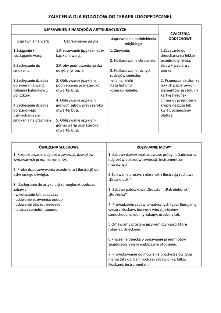 ZALECENIA DLA RODZICÓW DO TERAPII LOGOPEDYCZNEJ. USPRAWNIENIE NARZĄDÓW ARTYKULACYJNYCH Usprawnienie warg Usprawnienie języka 1.Ściąganie i rozciąganie warg. 1.Przesuwanie języka między kącikami warg. 2.Zachęcanie do cmokania. 2.Próby podnoszenia języka do góry (w buzi). 3.Zachęcanie dziecka do zwierania warg i robienia baloników z policzków. 3. Oblizywanie językiem podniebienia przy szeroko otwartej buzi. Usprawnienie podniebienia miękkiego 1. Ziewanie. 2. Naśladowanie chrapania. 4.Zachęcanie dziecka do szerokiego uśmiechania się i cmokania na przemian. 4. Oblizywanie językiem górnych zębów przy szeroko otwartej buzi. 3. Naśladowanie różnych rodzajów śmiechu; -mama hihihi -tata hohoho -dziecko hehehe. ĆWICZENIA ODDECHOWE 1.Zacęcanie do dmuchania na lekkie przedmioty (wata, skrawki papieru , piórka). 2. Przenoszenie słomką lekkich papierowych elementów ze stołu na kartkę (rysunek chmurki i przenosimy krople deszczu lub kwiat, przenosimy płatki ). 5. Oblizywanie językiem górnej wargi przy szeroko otwartej buzi. ĆWICZENIA SŁUCHOWE 1. Rozpoznawanie odgłosów zwierząt, dźwięków wydawanych przez instrumenty. 2. Próby dopasowywania przedmiotu ( ilustracji) do usłyszanego dźwięku. 3. Zachęcanie do artykulacji samogłosek podczas zabaw : - w kołysanie lali: aaaaaaaa - udawanie zdziwienia: ooooo - udawanie płaczu : eeeeeee - latający samolot: uuuuuu ROZWIJANIE MOWY 1. Zabawy dźwiękonaśladowcze, próby naśladowania odgłosów pojazdów, zwierząt, instrumentów muzycznych. 2.Śpiewanie prostych piosenek z ilustracją ruchową „Krasnoludki” 3. Zabawy paluszkowe „Sroczka”, „Rak nieborak”, „Rodzinka” 4. Prowadzenie zabaw tematycznych typu: Budujemy wieżę z klocków, burzymy wieżę, jeździmy samochodem, robimy zakupy, urodziny lali. 5.Omawiamy prostym językiem czynności które robimy z dzieckiem. 6.Proszenie dziecka o podawanie przedmiotów znajdujących się w najbliższym otoczeniu. 7. Prowokowanie do mówienia prostych słów typu mama tata daj bam podczas zabaw piłką, lalka, klockami, instrumentami.
