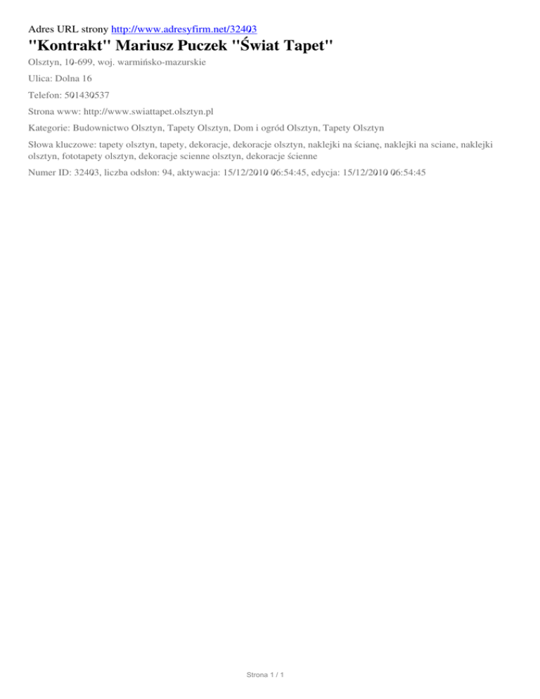 Adres URL strony http://www.adresyfirm.net/32403 "Kontrakt" Mariusz Puczek "Świat Tapet" Olsztyn, 10-699, woj. warmińsko-mazurskie Ulica: Dolna 16 Telefon: 501430537 Strona www: http://www.swiattapet.olsztyn.pl Kategorie: Budownictwo Olsztyn, Tapety Olsztyn, Dom i ogród Olsztyn, Tapety Olsztyn Słowa kluczowe: tapety olsztyn, tapety, dekoracje, dekoracje olsztyn, naklejki na ścianę, naklejki na sciane, naklejki olsztyn, fototapety olsztyn, dekoracje scienne olsztyn, dekoracje ścienne Numer ID: 32403, liczba odsłon: 94, aktywacja: 15/12/2010 06:54:45, edycja: 15/12/2010 06:54:45 Strona 1 / 1