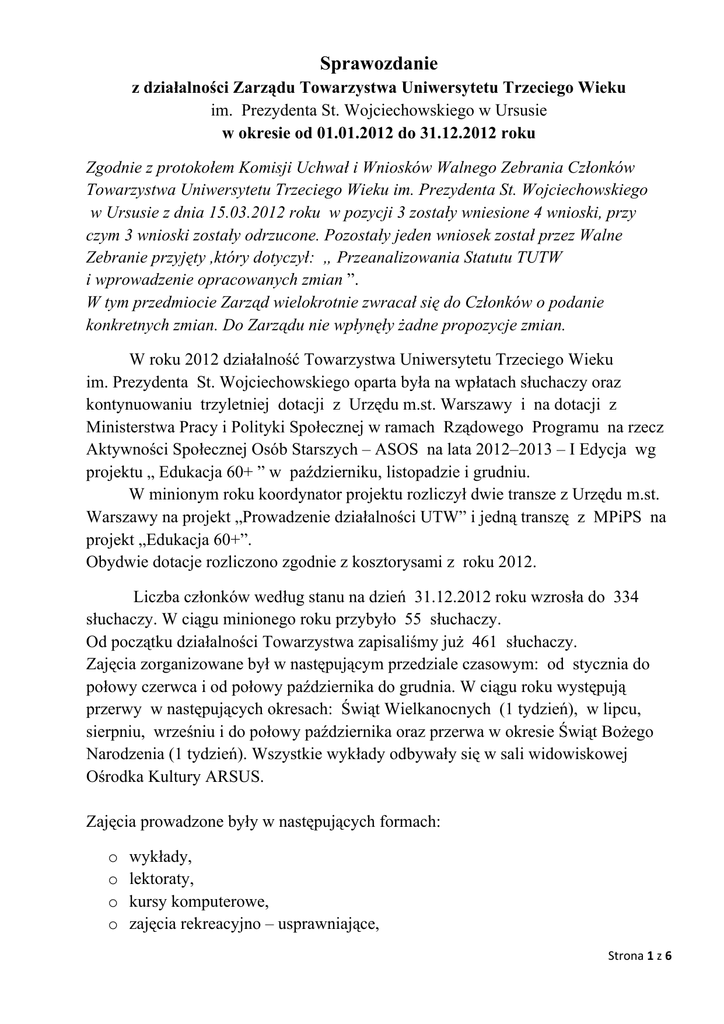 Sprawozdanie z działalności Zarządu Towarzystwa Uniwersytetu Trzeciego Wieku im. Prezydenta St. Wojciechowskiego w Ursusie w okresie od 01.01.2012 do 31.12.2012 roku Zgodnie z protokołem Komisji Uchwał i Wniosków Walnego Zebrania Członków Towarzystwa Uniwersytetu Trzeciego Wieku im. Prezydenta St. Wojciechowskiego w Ursusie z dnia 15.03.2012 roku w pozycji 3 zostały wniesione 4 wnioski, przy czym 3 wnioski zostały odrzucone. Pozostały jeden wniosek został przez Walne Zebranie przyjęty ,który dotyczył: „ Przeanalizowania Statutu TUTW i wprowadzenie opracowanych zmian ”. W tym przedmiocie Zarząd wielokrotnie zwracał się do Członków o podanie konkretnych zmian. Do Zarządu nie wpłynęły żadne propozycje zmian. W roku 2012 działalność Towarzystwa Uniwersytetu Trzeciego Wieku im. Prezydenta St. Wojciechowskiego oparta była na wpłatach słuchaczy oraz kontynuowaniu trzyletniej dotacji z Urzędu m.st. Warszawy i na dotacji z Ministerstwa Pracy i Polityki Społecznej w ramach Rządowego Programu na rzecz Aktywności Społecznej Osób Starszych – ASOS na lata 2012–2013 – I Edycja wg projektu „ Edukacja 60+ ” w październiku, listopadzie i grudniu. W minionym roku koordynator projektu rozliczył dwie transze z Urzędu m.st. Warszawy na projekt „Prowadzenie działalności UTW” i jedną transzę z MPiPS na projekt „Edukacja 60+”. Obydwie dotacje rozliczono zgodnie z kosztorysami z roku 2012. Liczba członków według stanu na dzień 31.12.2012 roku wzrosła do 334 słuchaczy. W ciągu minionego roku przybyło 55 słuchaczy. Od początku działalności Towarzystwa zapisaliśmy już 461 słuchaczy. Zajęcia zorganizowane był w następującym przedziale czasowym: od stycznia do połowy czerwca i od połowy października do grudnia. W ciągu roku występują przerwy w następujących okresach: Świąt Wielkanocnych (1 tydzień), w lipcu, sierpniu, wrześniu i do połowy października oraz przerwa w okresie Świąt Bożego Narodzenia (1 tydzień). Wszystkie wykłady odbywały się w sali widowiskowej Ośrodka Kultury ARSUS. Zajęcia prowadzone były w następujących formach: o o o o wykłady, lektoraty, kursy komputerowe, zajęcia rekreacyjno – usprawniające, Strona 1 z 6 o seminaria wyjazdowe, o imprezy kulturalne, o zespoły zainteresowań Wykłady prowadzone były raz w tygodniu – łącznie odbyły się 32 spotkania. Za dobór tematów i wykładowców odpowiadała Rada Programowa (załącznik nr 1 – informacja dotycząca pracy Rady Programowej). Lektoraty prowadzone były na poziomie podstawowym z języka angielskiego – 1 grupa, a na poziomie rozszerzonym z języka angielskiego –3 grupy i z języka niemieckiego – 1 grupa. Wszystkie odbywały się raz w tygodniu. Zajęcia komputerowe prowadzone były przez Bibliotekę Publiczną w Ursusie w dwóch zakresach: podstawowym – 2 grupy i rozszerzonym – 2 grupy. Brało w nich udział 40 osób. Kursy komputerowe odbywały się w cyklu 10 spotkań dla każdej grupy. W okresie od października do grudnia realizowany był Projekt „ Edukacja 60 + ” z programu ASOS, w ramach którego prowadzone były następujące zajęcia: „komputerowy kurs fotograficzny” – uczestniczyło 11 słuchaczy „zdrowy styl życia” – uczestniczyło 25 słuchaczy, lektoraty z języka angielskiego – 2 grupy i 1 grupa z języka niemieckiego (łącznie 45 słuchaczy). W ramach zajęć rekreacyjno – usprawniających prowadzone były: - nordic walking w dwóch cyklach, wiosennym i jesiennym po 5 spotkań każde (skorzystało 37 słuchaczy), - zajęcia na basenie odbywały się 4 razy w tygodniu (uczestniczyło 35 słuchaczy), - gimnastyka usprawniająca 2 razy w tygodniu, zajęcia te były finansowane przez Urząd Dzielnicy Ursus m.st. Warszawy (uczestniczyło 15 słuchaczy) , - taniec salsa odbywał się raz w tygodniu (uczestniczyło 10 słuchaczy), - warsztaty psychologiczne odbywały się w okresie od stycznia do czerwca, 15 spotkań w których uczestniczyło 15 słuchaczy, a od października do grudnia odbyły się warsztaty pt. „Trening pamięci dla seniorów”, w których uczestniczyło 20 słuchaczy w 10 spotkaniach. Dużym zainteresowaniem cieszyły się tak zwane seminaria wyjazdowe na terenie Warszawy; do muzeów, na wystawy i do innych obiektów kultury. Odbyło się 27 wyjść i wzięło w nich udział 527 słuchaczy. Seminaria na terenie Warszawy organizowała i prowadziła przewodnik warszawski – Barbara Prusakiewicz. Organizowane były wyjazdy krajowe: o jednodniowe – 6 wyjazdów, w których wzięło udział 209 słuchaczy, 1. Powsin, Wilanów, Siekierki, 2. Mysiadło, Strona 2 z 6 3. Poznajemy sławnych Polaków na ziemi Lubelskiej (Kozłówka, Kock, Wola Okrzejska, Okrzeja), 4. Nałęczów, Kazimierz nad Wisłą. 5. Sochaczew, Tułowice, 6. Łódź. o dwudniowe – 2 wyjazdy, w których wzięło udział 58 słuchaczy, 1. Warmia i Mazury, 2. Wrocław i Krzeszów. o jeden wyjazd czterodniowy za granicę, do Pragi Czeskiej, w którym uczestniczyło 43 słuchaczy. Pieniądze przeznaczone z dotacji Urzędu m.st. Warszawy na ten wyjazd otrzymał każdy uczestnik – słuchacz TUTW, w kwocie 55,60 złotych za pokwitowaniem na liście, która znajduje się w dokumentacji księgowej. W ww. wyjazdach uczestniczyło łącznie 310 słuchaczy. Wyjazdy seminaryjne jednodniowe organizowały Barbara Prusakiewicz, Alicja Pilecka i Romana Sterna. Natomiast wyjazdy dwudniowe z cyklu „ Poznajemy ciekawe zabytki Polski ” zorganizowały Alicja Pilecka i Romana Sterna. Kilkudniowy wyjazd do Pragi Czeskiej z cyklu „ Poznajemy naszych sąsiadów” zorganizowała Weronika Zwierzyńska. W ramach imprez kulturalnych organizowane były wyjścia do teatrów i na koncerty, łącznie 44 wyjścia, w których uczestniczyło 1155 osób. Zakupem i rozprowadzaniem biletów zajmowała się Alina Florczak. Zorganizowane były spotkania integracyjne: o Dzień Kobiet, o Spotkanie Wielkanocne, o Dzień Matki, o 3 spot
