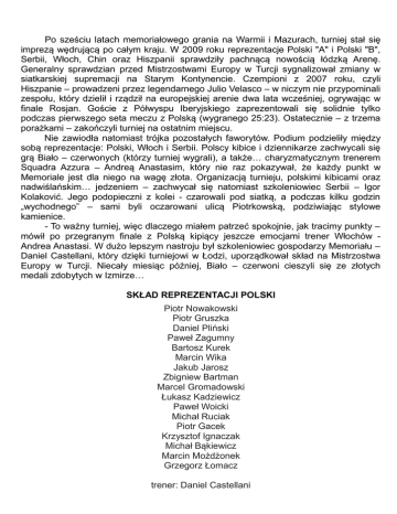 Po sześciu latach memoriałowego grania na Warmii i Mazurach, turniej stał się imprezą wędrującą po całym kraju. W 2009 roku reprezentacje Polski "A" i Polski "B", Serbii, Włoch, Chin oraz Hiszpanii sprawdziły pachnącą nowością łódzką Arenę. Generalny sprawdzian przed Mistrzostwami Europy w Turcji sygnalizował zmiany w siatkarskiej supremacji na Starym Kontynencie. Czempioni z 2007 roku, czyli Hiszpanie – prowadzeni przez legendarnego Julio Velasco – w niczym nie przypominali zespołu, który dzielił i rządził na europejskiej arenie dwa lata wcześniej, ogrywając w finale Rosjan. Goście z Półwyspu Iberyjskiego zaprezentowali się solidnie tylko podczas pierwszego seta meczu z Polską (wygranego 25:23). Ostatecznie – z trzema porażkami – zakończyli turniej na ostatnim miejscu. Nie zawiodła natomiast trójka pozostałych faworytów. Podium podzieliły między sobą reprezentacje: Polski, Włoch i Serbii. Polscy kibice i dziennikarze zachwycali się grą Biało – czerwonych (którzy turniej wygrali), a także… charyzmatycznym trenerem Squadra Azzura – Andreą Anastasim, który nie raz pokazywał, że każdy punkt w Memoriale jest dla niego na wagę złota. Organizacją turnieju, polskimi kibicami oraz nadwiślańskim… jedzeniem – zachwycał się natomiast szkoleniowiec Serbii – Igor Kolaković. Jego podopieczni z kolei - czarowali pod siatką, a podczas kilku godzin „wychodnego” – sami byli oczarowani ulicą Piotrkowską, podziwiając stylowe kamienice. - To ważny turniej, więc dlaczego miałem patrzeć spokojnie, jak tracimy punkty – mówił po przegranym finale z Polską kipiący jeszcze emocjami trener Włochów Andrea Anastasi. W dużo lepszym nastroju był szkoleniowiec gospodarzy Memoriału – Daniel Castellani, który dzięki turniejowi w Łodzi, uporządkował skład na Mistrzostwa Europy w Turcji. Niecały miesiąc później, Biało – czerwoni cieszyli się ze złotych medali zdobytych w Izmirze… SKŁAD REPREZENTACJI POLSKI Piotr Nowakowski Piotr Gruszka Daniel Pliński Paweł Zagumny Bartosz Kurek Marcin Wika Jakub Jarosz Zbigniew Bartman Marcel Gromadowski Łukasz Kadziewicz Paweł Woicki Michał Ruciak Piotr Gacek Krzysztof Ignaczak Michał Bąkiewicz Marcin Możdżonek Grzegorz Łomacz trener: Daniel Castellani WYNIKI Grupa A POLSKA A – Hiszpania POLSKA A – Chiny Hiszpania – Chiny 3:1 (23:25, 25:22, 25:21, 25:23) 3:1 (25:21, 25:18, 20:25, 25:19) 1:3 (26:24, 18:25, 21:25, 22:25) TABELA 1. POLSKA A 2. Chiny 3. Hiszpania 4 6:2 3 4:4 2 2:6 Grupa B Serbia – Włochy POLSKA B – Włochy POLSKA B – Serbia 2:3 (25:22, 21:25, 21:25, 25:20, 12:15) 0:3 (16:25, 19:25, 23:25) 0:3 (20:25, 17:25, 19:25) TABELA 1. Włochy 2. Serbia 3. POLSKA B 4 6:2 3 5:3 2 0:6 MECZ O 5. MIEJSCE POLSKA B – Hiszpania 3:0 (25:20, 27:25, 25:21) MECZ O 3. MIEJSCE Chiny – Serbia 2:3 (27:25, 19:25, 31:29, 21:25, 8:15) FINAŁ POLSKA A – Włochy 3:1 (25:17, 25:19, 17:25, 25:18) Kolejność: 1. POLSKA A, 2. Włochy, 3. Serbia, 4. Chiny, 5. POLSKA B, 6. Hiszpania; Najlepszy Najlepszy Najlepszy Najlepszy Najlepszy Najlepszy MVP atakujący blokujący serwujący przyjmujący libero rozgrywający Cristian Daniel Saša Paweł Bartosz Matej Černić Qi Ren Savani Pliński Starović Zagumny Kurek WŁOCHY CHINY WŁOCHY POLSKA SERBIA POLSKA POLSKA Maciej Świniarski