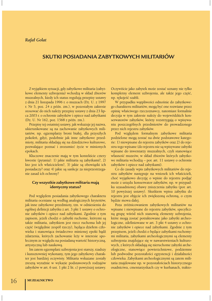 Rafał Golat SKUTKI POSIADANIA ZABYTKOWYCH MILITARIÓW Z wyjątkiem sytuacji, gdy zabytkowe militaria (zabytkowe elementy uzbrojenia) wchodzą w skład zbiorów muzealnych, kiedy ich status regulują przepisy ustawy z dnia 21 listopada 1996 r. o muzeach (Dz. U. z 1997 r. Nr 5, poz. 24 z późn. zm.), w pozostałym zakresie stosować do nich należy przepisy ustawy z dnia 23 lipca 2003 r. o ochronie zabytków i opiece nad zabytkami (Dz. U. Nr 162, poz. 1568 z późn. zm.). Przepisy tej ostatniej ustawy, jak wskazuje jej nazwa, ukierunkowane są na zachowanie zabytkowych militariów, np. egzemplarzy broni białej, dla przyszłych pokoleń, gdyż, podobnie jak inne zabytkowe przedmioty, militaria składają się na dziedzictwo kulturowe, pozwalające poznać i zrozumieć życie w minionych epokach. Kluczowe znaczenie mają w tym kontekście cztery kwestie (pytania): 1) jakie militaria są zabytkami?, 2) kto jest ich właścicielem?, 3) jakie są obowiązki ich posiadaczy? oraz 4) jakie są sankcje za nieprzestrzeganie zasad ich ochrony? Czy wszystkie zabytkowe militaria mają identyczny status? Pod względem posiadania zabytkowego charakteru militaria oceniane są według analogicznych kryteriów, jak inne zabytkowe przedmioty, tzn. w odniesieniu do ogólnej definicji zabytku z art. 3 pkt 1 ustawy o ochronie zabytków i opiece nad zabytkami. Zgodnie z tym zapisem, jeżeli chodzi o zabytki ruchome, którymi są także militaria, zabytkiem jest rzecz ruchoma lub jej część (względnie zespół rzeczy), będąca dziełem człowieka i stanowiąca świadectwo minionej epoki bądź zdarzenia, których zachowanie leży w interesie społecznym ze względu na posiadaną wartość historyczną, artystyczną lub naukową. Im zatem egzemplarz uzbrojenia jest starszy, rzadszy i kunsztowniej wykonany, tym jego zabytkowy charakter jest bardziej oczywisty. Militaria wskazane zostały zresztą wyraźnie w wykazie podstawowych rodzajów zabytków w art. 6 ust. 1 pkt 2 lit. c) powyższej ustawy. 16 MUZEALNICTWO Oczywiście jako zabytek może zostać uznany nie tylko kompletny element uzbrojenia, ale także jego część, np. rękojeść szabli. W przypadku wątpliwości odnośnie do zabytkowego charakteru militariów, mogą być one rozwiane przez opinię właściwego rzeczoznawcy, natomiast formalnie decyzja w tym zakresie należy do wojewódzkich konserwatorów zabytków, którzy rozstrzygają o wpisywaniu poszczególnych przedmiotów do prowadzonego przez nich rejestru zabytków. Pod względem formalnym zabytkowe militaria podzielone mogą zostać na dwie podstawowe kategorie: 1) niewpisane do rejestru zabytków oraz 2) do rejestru tego wpisane (do rejestru nie są wpisywane zabytki wpisane do inwentarzy muzealnych, czyli stanowiące własność muzeów, w skład zbiorów których zabytkowe militaria wchodzą – por. art. 11 ustawy o ochronie zabytków i opiece nad zabytkami). Co do zasady wpis zabytkowych militariów do rejestru zabytków następuje na wniosek ich właścicieli, choć wyjątkowo decyzję o wpisie do rejestru podjąć może z urzędu konserwator zabytków, np. w przypadku uzasadnionej obawy zniszczenia zabytku (por. art. 10 powyższej ustawy). Skutkiem wpisu zabytku do rejestru jest objęcie ich zwiększoną ochroną, o czym będzie mowa dalej. Poza zróżnicowaniem zabytkowych militariów na wpisane i niewpisane do rejestru zabytków, specyficzną grupę wśród nich stanowią elementy uzbrojenia, które mogą zostać potraktowane jako zabytki archeologiczne, zdefiniowane w art. 3 pkt 4 ustawy o ochronie zabytków i opiece nad zabytkami. Zgodnie z tym przepisem, jeżeli chodzi o będące zabytkami ruchomymi militaria, zabytkami archeologicznymi są elementy uzbrojenia znajdujące się w nawarstwieniach kulturowych, z których składają się nieruchome zabytki archeologiczne, stanowiące powierzchniowe, podziemne lub podwodne pozostałości egzystencji i działalności człowieka. Zabytkami archeologicznymi są zatem militaria znajdowane np. w pozostałościach historycznego osadnictwa, cmentarzyskach czy w kurhanach, trakto- wanych wyraźnie jako zabytki archeologiczne (por. art. 6 ust. 1 pkt 3 powyższej ustawy). Oczywiście zabytkiem mogą być wyłącznie militaria autentyczne, czyli nie są nimi różnego rodzaju współczesne kopie, jak również wszelkiego rodzaju podróbki zabytkowych militariów, a więc współcześnie produkowane przedmioty, które autentyczne, zabytkowe militaria mają imitować. Obecnie zarówno podrabianie zabytków w celu użycia ich w obrocie zabytkami, jak również zbywanie takich kopii ze świadomością, że są to przedmioty podrobione, traktowane jest jako przestępstwo (por. art. 109a i art. 109b ustawy o ochronie zabytków i opiece nad zabytkami). Posiadanie militariów powinno być legalne Wszystkich posiadaczy zabytkowych militariów, niezależnie od rodzaju tych obiektów, można podzielić na dwie grupy: 1) posiadaczy legalnych oraz 2) posiadaczy nielegalnych. Posiadacze legalni to po pierwsze właściciele zabytkowych militariów, czyli podmioty, którym przysługuje do nich prawo własności (które są ich właścicielami), oraz po drugie podmioty, które posiadają muzealia na podstawie innego niż własność tytułu prawnego, np. na zasadzie depozytu, najmu, użyczenia itd. Posiadacze nielegalni natomiast, to podmioty, które dysponują zabytkowymi militariami bez możliwości powołania się na żaden tytuł prawny, niezależnie od tego, w jakich okolicznościach weszły w posiadanie zabytkowych elementów uzbrojenia. Dwie podstawowe grupy nielegalnych posiadaczy to osoby, które weszły w posiadanie zabytkowych militariów w drodze kradzieży oraz osoby, które po znalezieniu (odkryciu) takich przedmiotów nie przekazały ich uprawnionym podmiotom lub instytucjom. Znalezienie zabytkowych militariów może mieć miejsce zasadniczo w trzech następujących okolicznościach: 1) w trakcie prowadzenia robót budowlanych lub ziemnych w zwi