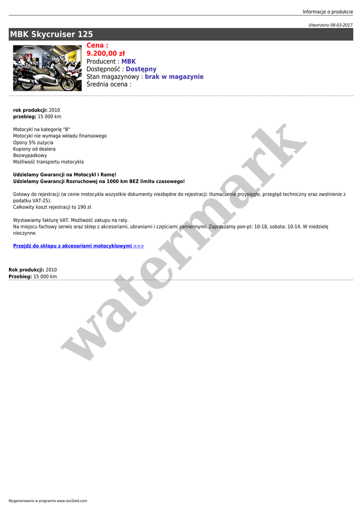 Informacje o produkcie Utworzono 08-03-2017 MBK Skycruiser 125 Cena : 9.200,00 zł Producent : MBK Dostępność : Dostępny Stan magazynowy : brak w magazynie Średnia ocena : rok produkcji: 2010 przebieg: 15 000 km er m ar k Motocykl na kategorię "B" Motocykl nie wymaga wkładu finansowego Opony 5% zużycia Kupiony od dealera Bezwypadkowy Możliwość transportu motocykla Udzielamy Gwarancji na Motocykl i Ramę! Udzielamy Gwarancji Rozruchowej na 1000 km BEZ limitu czasowego! Gotowy do rejestracji (w cenie motocykla wszystkie dokumenty niezbędne do rejestracji: tłumaczenie przysięgłe, przegląd techniczny oraz zwolnienie z podatku VAT-25). Całkowity koszt rejestracji to 190 zł. Wystawiamy fakturę VAT. Możliwość zakupu na raty. Na miejscu fachowy serwis oraz sklep z akcesoriami, ubraniami i częściami zamiennymi. Zapraszamy pon-pt: 10-18, sobota: 10-14. W niedzielę nieczynne. Przejdź do sklepu z akcesoriami motocyklowymi >>> w at Rok produkcji: 2010 Przebieg: 15 000 km Wygenerowano w programie www.oscGold.com