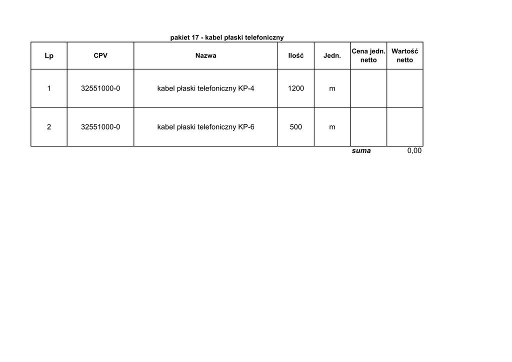 pakiet 17 - kabel płaski telefoniczny Lp CPV Nazwa Ilość Jedn. 1 32551000-0 kabel płaski telefoniczny KP-4 1200 m 2 32551000-0 kabel płaski telefoniczny KP-6 500 m Cena jedn. Wartość netto netto suma 0,00