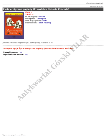 Informacje o wydawnictwie Utworzono 08-03-2017 Życie erotyczne papieży (Prawdziwa historia Kościoła) Cena : 29,40 zł LA R Nr katalogowy : 44634 Dostępność : Dostępny Stan magazynowy : niski Średnia ocena : brak recenzji FI /bmw brw/. Wydawca: aris poland. wyd.1. s.179. opr. oryg. kartonowa. 21 cm. Dostępne opcje Życie erotyczne papieży (Prawdziwa historia Kościoła) An ty k w ar ia t G ór sk i Zweryfikowane: Tak. Wydawnictwo zwarte: Tak. Wygenerowano w programie www.oscGold.com