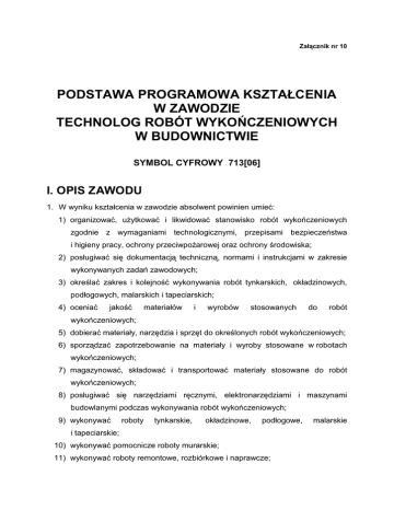 Załącznik nr 10 PODSTAWA PROGRAMOWA KSZTAŁCENIA W ZAWODZIE TECHNOLOG ROBÓT WYKOŃCZENIOWYCH W BUDOWNICTWIE SYMBOL CYFROWY 713[06] I. OPIS ZAWODU 1. W wyniku kształcenia w zawodzie absolwent powinien umieć: 1) organizować, uŜytkować i likwidować stanowisko robót wykończeniowych zgodnie z wymaganiami technologicznymi, przepisami bezpieczeństwa i higieny pracy, ochrony przeciwpoŜarowej oraz ochrony środowiska; 2) posługiwać się dokumentacją techniczną, normami i instrukcjami w zakresie wykonywanych zadań zawodowych; 3) określać zakres i kolejność wykonywania robót tynkarskich, okładzinowych, podłogowych, malarskich i tapeciarskich; 4) oceniać jakość materiałów i wyrobów stosowanych do robót wykończeniowych; 5) dobierać materiały, narzędzia i sprzęt do określonych robót wykończeniowych; 6) sporządzać zapotrzebowanie na materiały i wyroby stosowane w robotach wykończeniowych; 7) magazynować, składować i transportować materiały stosowane do robót wykończeniowych; 8) posługiwać się narzędziami ręcznymi, elektronarzędziami i maszynami budowlanymi podczas wykonywania robót wykończeniowych; 9) wykonywać roboty tynkarskie, okładzinowe, podłogowe, i tapeciarskie; 10) wykonywać pomocnicze roboty murarskie; 11) wykonywać roboty remontowe, rozbiórkowe i naprawcze; malarskie 12) uŜytkować rusztowania; 13) wykonywać przedmiary i obmiary robót; 14) wykonywać pomiary inwentaryzacyjne; 15) dokonywać rozliczenia materiałów, sprzętu i robocizny; 16) sporządzać kosztorysy robót wykończeniowych; 17) oceniać jakość wykonanych robót wykończeniowych; 18) stosować podstawowe techniki komputerowe; 19) stosować przepisy prawa dotyczące wykonywanych zadań zawodowych; 20) stosować przepisy prawa budowlanego, podatkowego i bankowego; 21) przestrzegać przepisów i zasad bezpieczeństwa i higieny pracy, przepisów ochrony przeciwpoŜarowej oraz ochrony środowiska; 22) organizować stanowisko pracy zgodnie z wymaganiami ergonomii; 23) komunikować się z uczestnikami procesu pracy; 24) stosować przepisy Kodeksu pracy dotyczące praw i obowiązków pracownika i pracodawcy; 25) udzielać pierwszej pomocy poszkodowanym w wypadkach przy pracy; 26) korzystać z róŜnych źródeł informacji; 27) prowadzić działalność gospodarczą. Kształtowanie postaw przedsiębiorczych oraz przygotowanie do wejścia na rynek pracy powinno przebiegać zarówno w trakcie kształcenia zawodowego, jak i podczas realizacji zajęć edukacyjnych „Podstawy przedsiębiorczości”. 2. Absolwent szkoły kształcącej w zawodzie technolog robót wykończeniowych w budownictwie powinien być przygotowany do wykonywania następujących zadań zawodowych: 1) przygotowywania materiałów do robót wykończeniowych; 2) wykonywania robót wykończeniowych; 3) wykonywania robót konserwacyjnych i remontowych w obiektach budowlanych; 4) sporządzania dokumentacji robót wykończeniowych i ich kosztorysów. 2 II. BLOKI PROGRAMOWE Zakres umiejętności i treści kształcenia, wynikający z opisu zawodu, zawierają następujące bloki programowe: 1) podstawy budownictwa; 2) technologia robót wykończeniowych; 3) podstawy działalności zawodowej. BLOK: PODSTAWY BUDOWNICTWA 1. Cele kształcenia Uczeń (słuchacz) w wyniku kształcenia powinien umieć: 1) posługiwać się podstawową terminologią budowlaną; 2) rozpoznawać rodzaje i elementy budynków oraz określać ich funkcje; 3) rozróŜniać konstrukcje i technologie wykonania budynków; 4) rozróŜniać materiały budowlane oraz określać ich właściwości; 5) oceniać jakość materiałów budowlanych oraz ich przydatność do określonych robót tynkarskich, okładzinowych, podłogowych, stolarskich, malarskich i tapeciarskich; 6) magazynować, składować i transportować materiały stosowane do robót wykończeniowych; 7) wyjaśniać działanie narzędzi, urządzeń i sprzętu stosowanego do robót budowlanych i wykończeniowych; 8) określać zasady montaŜu i uŜytkowania rusztowań; 9) sporządzać rysunki figur i brył geometrycznych; 10) stosować zasady wykonywania przekrojów, rzutów i aksonometrii; 11) wykonywać szkice oraz proste rysunki elementów budowlanych; 12) wymiarować i opisywać rysunki techniczne; 13) dobierać i łączyć barwy według określonych zasad; 14) rozróŜniać rodzaje i elementy dokumentacji technicznej; 15) posługiwać się dokumentacją budowlaną; 16) posługiwać się przyrządami pomiarowymi; 17) wykonywać przedmiary i obmiary robót wykończeniowych; 3 18) sporządzać zapotrzebowanie na materiały do wykonywania robót wykończeniowych; 19) wykonywać pomiary oraz sporządzać rysunki inwentaryzacyjne pomieszczeń oraz obiektów budowlanych; 20) przestrzegać przepisów bezpieczeństwa i higieny pracy, ochrony przeciwpoŜarowej i ochrony środowiska. 2. Treści kształcenia (działy programowe) Treści kształcenia są ujęte w następujących działach programowych: 1) terminologia budowlana; 2) rodzaje i elementy budynków; 3) konstrukcje i technologie stosowane w budownictwie; 4) materiały budowlane; 5) właściwości materiałów stosowanych do robót tynkarskich, okładzinowych, podłogowych, stolarskich, malarskich i tapeciarskich; 6) magazynowanie, składowanie i transport materiałów stosowanych w robotach wykończeniowych; 7) narzędzia i sprzęt stosowany do robót budowlanych i wykończeniowych; 8) zasady montaŜu i uŜytkowania rusztowań; 9) figury i bryły geometryczne; 10) przekroje rysunkowe; 11) rzuty i aksonometria; 12) szkice i proste rysunki elementów budowlanych; 13) zasady wykonywania rysunków technicznych; 14) wymiarowanie i opisywanie rysunków technicznych; 15) barwy podstawowe, sposoby łączenia barw: 16) rodzaje i elementy dokumentacji technicznej; 17) dokumentacja budowlana; 18) sprzęt pomiarowy; 19) miernictwo budowlane; 20) przedmiary i obmiary robót wykończeniowych; 21) zapotrzebowanie materiałowe; 22) zasady wykonywa