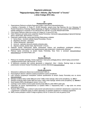 Regulamin plebiscytu "Najpopularniejszy Aktor i Aktorka „Baj Pomorski” w Toruniu” z dnia 4 lutego 2012 roku. §1 Postanowienia ogólne. 1. Organizatorem Plebiscytu są Media Regionalne spółka z ograniczoną odpowiedzialnością z siedzibą w Warszawie, ul. Prosta 51, 00-838 Warszawa, wpisana przez Sąd Rejonowy dla m.st. Warszawy XII Wydział Gospodarczy Krajowego Rejestru Sądowego do Rejestru Przedsiębiorców pod numerem KRS 0000052204, o kapitale zakładowym w wysokości 47.813.500,00,00 PLN, NIP 897-10-10-229, REGON 930701694. 1. Czas trwania Plebiscytu ustala się na okres od 4 lutego do 12 marca 2012 roku. 2. Celem Plebiscytu jest wybór przez czytelników Gazety Pomorskiej i internautów www.pomorska.pl najpopularniejszego aktora i aktorki teatru „Baj Pomorski” w Toruniu. 3. Organizator ustala komisję, zwaną dalej Komisją Plebiscytową w składzie: 1) Karina Obara – kierownik oddziału Gazety Pomorskiej w Toruniu, 2) Magdalena Janowska - dziennikarz, 3) Tomasz Dereszynski - dziennikarz, 4) Anna Łyk - regionalny kierownik produktu enterprise sales, 5) Zbigniew Lisowski, dyrektor teatru „Baj Pomorski” w Toruniu. 5. Zadaniem Komisji Plebiscytowej będzie sprawowanie nadzoru nad prawidłowym przebiegiem plebiscytu, przestrzeganiem zasad regulaminu oraz egzekwowaniem jego postanowień i rozpatrywanie reklamacji. 6. Plebiscyt będzie promowany na łamach Gazety Pomorskiej, Teraz Toruń, w serwisach www.pomorska.pl, www.mmtorun.pl i na antenie Radia „Gra”. §2 Zasady plebiscytu. 1. Plebiscyt ma charakter zamknięty. Ocenie czytelników i internautów podlegają aktorzy i aktorki będący pracownikami i współpracownikami teatru „Baj Pomorski” w Toruniu. 2. W plebiscycie powstaną dwa rankingi głosowania w kategoriach: Aktor i Aktorka. Rankingi będą na bieżąco prezentowane na łamach Gazety Pomorskiej oraz na stronie internetowej www.pomorska.pl. §3 Zasady głosowania. 1. Głosowanie w plebiscycie odbywa się za pośrednictwem SMS-ów. 2. Poszczególnym aktorom i aktorkom zostaną przydzielone numery porządkowe. 3. Lista numerów przypisanych kandydatom zostanie opublikowana na łamach Gazety Pomorskiej oraz na stronie www.pomorska.pl. 4. Głosując na aktora należy wysłać SMS pod numer 71466 w treści wpisując: aktor.numer porządkowy, np. aktor.1 5. Głosując na aktorkę należy wysłać SMS pod numer 71466 w treści wpisując: aktorka.numer porządkowy, np. aktorka.1 6. Koszt wysłania SMS-a dla głosujących wynosi 1,23 zł z VAT. 7. Z jednego numeru telefonu można wysłać dowolną liczbę SMS-ów, jeden SMS to jeden głos. 8. Organizator nie ponosi odpowiedzialności za wysłanie SMS-a o niepoprawnej treści i z tego tytułu nie zwraca ewentualnych kosztów. 9. Wysłanie SMS-a zgodnego z podanym wyżej wzorem jest jednoznaczne ze złożeniem oświadczenia o zapoznaniu się z regulaminem i wyrażeniem zgody na udział w głosowaniu na zasadach określonych w niniejszym regulaminie. 10. SMS-y można przesyłać w dniach 5 lutego od godziny 0:00 do 12 marca 2012 roku do godziny 23:59. 1 §4 Warunki uczestnictwa w głosowaniu. 1. Nadawca SMS-a staje się automatycznie uczestnikiem plebiscytu. 2. Oddanie głosu przez uczestnika plebiscytu jest równoznaczne ze złożeniem przez niego oświadczenia, iż wyraża on zgodę na postanowienia niniejszego Regulaminu. 3. Uczestnik wysyłający SMS w plebiscycie otrzymuje nieodpłatnie SMS-y promocyjne wysyłane przez Organizatora, które dotyczą tylko informacji o plebiscycie „Najpopularniejszy Aktor i Aktorka teatru „Baj Pomorski 2012”. 4. Uczestnik plebiscytu może zrezygnować z otrzymywania SMS-ów promocyjnych wysyłając na adres mailowy [email protected] wiadomość pod tytułem: „SMS-y PROMOCYJNE”, w treści podając numer telefonu. Numer ten w ciągu 48 godzin zostanie usunięty z listy numerów, na które wysyłane są wiadomości promocyjne. §5 Ogłoszenie wyników. 1. Wyniki plebiscytu są dostępne na bieżąco na stronie internetowej www.pomorska.pl. 2. Aktor i aktorka, którzy otrzymają największą liczbę głosów zliczoną na podstawie nadesłanych SMS-ów otrzymają: a) tytuł „Najpopularniejszy Aktor teatru Baj Pomorski” oraz pamiątkowy dyplom, b) tytuł „Najpopularniejsza Aktorka teatru Baj Pomorski” oraz pamiątkowy dyplom. 3. Wyniki plebiscytu będą publikowane na bieżąco na stronie internetowej www.pomorska.pl. Ogłoszenie ostatecznych wyników głosowania odbędzie się podczas uroczystej gali w dniu 27 marca w czasie obchodów Międzynarodowego Dnia Teatru w Toruniu. §6 Postępowanie reklamacyjne. 1. Prawo do wniesienia reklamacji związanej z niniejszym Plebiscytem przysługuje każdemu uczestnikowi Plebiscytu. 2. Reklamacje mogą być zgłaszane przez uczestników Plebiscytu wyłącznie w formie pisemnej od dnia rozpoczęcia Plebiscytu, najpóźniej 7 dni od dnia opublikowania ostatecznych wyników głosowania. Reklamacje, które wpłyną po tym terminie nie będą uwzględniane. 3. Reklamacje należy wysłać listem poleconym lub dostarczyć osobiście na adres Organizatora. 4. Na kopercie powinien znajdować się dopisek „Najpopularniejszy aktor i aktorka teatru Baj Pomorski 2012” - reklamacja. 5. Reklamacja powinna zawierać: imię, nazwisko, dokładny adres Uczestnika Plebiscytu, przyczynę reklamacji wraz z jej uzasadnieniem oraz czytelny podpis uczestnika Plebiscytu. 6. Reklamacje będą rozpatrywane w terminie 7 dni roboczych od daty wpłynięcia reklamacji, włączając w to zawiadomienie uczestnika o wyniku reklamacji. 7. Organizator rozpatrując reklamacje stosować się będzie do postanowień niniejszego Regulaminu. 8. Decyzja w przedmiocie reklamacji jest ostateczna i wiążąca. §7 Postanowienia końcowe. 1. Regulamin niniejszy jest jedynym dokumentem określającym zasady Plebiscytu. Udział w plebiscycie jest jednoznaczny z akceptacją postanowień niniejszego regulaminu. 2. Organizator jest uprawniony do zmiany postanowień ni