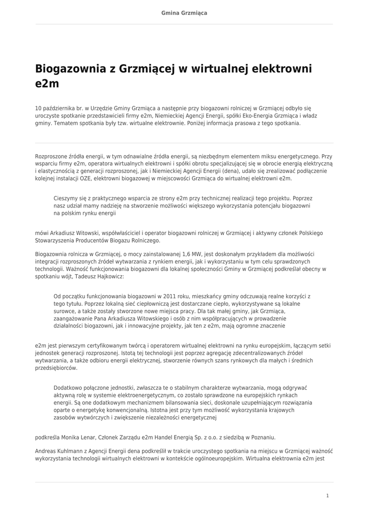 Gmina Grzmiąca Biogazownia z Grzmiącej w wirtualnej elektrowni e2m 10 października br. w Urzędzie Gminy Grzmiąca a następnie przy biogazowni rolniczej w Grzmiącej odbyło się uroczyste spotkanie przedstawicieli firmy e2m, Niemieckiej Agencji Energii, spółki Eko-Energia Grzmiąca i władz gminy. Tematem spotkania były tzw. wirtualne elektrownie. Poniżej informacja prasowa z tego spotkania. Rozproszone źródła energii, w tym odnawialne źródła energii, są niezbędnym elementem miksu energetycznego. Przy wsparciu firmy e2m, operatora wirtualnych elektrowni i spółki obrotu specjalizującej się w obrocie energią elektryczną i elastycznością z generacji rozproszonej, jak i Niemieckiej Agencji Energii (dena), udało się zrealizować podłączenie kolejnej instalacji OZE, elektrowni biogazowej w miejscowości Grzmiąca do wirtualnej elektrowni e2m. Cieszymy się z praktycznego wsparcia ze strony e2m przy technicznej realizacji tego projektu. Poprzez nasz udział mamy nadzieję na stworzenie możliwości większego wykorzystania potencjału biogazowni na polskim rynku energii mówi Arkadiusz Witowski, współwłaściciel i operator biogazowni rolniczej w Grzmiącej i aktywny członek Polskiego Stowarzyszenia Producentów Biogazu Rolniczego. Biogazownia rolnicza w Grzmiącej, o mocy zainstalowanej 1,6 MW, jest doskonałym przykładem dla możliwości integracji rozproszonych źródeł wytwarzania z rynkiem energii, jak i wykorzystaniu w tym celu sprawdzonych technologii. Ważność funkcjonowania biogazowni dla lokalnej społeczności Gminy w Grzmiącej podkreślał obecny w spotkaniu wójt, Tadeusz Hajkowicz: Od początku funkcjonowania biogazowni w 2011 roku, mieszkańcy gminy odczuwają realne korzyści z tego tytułu. Poprzez lokalną sieć ciepłowniczą jest dostarczane ciepło, wykorzystywane są lokalne surowce, a także zostały stworzone nowe miejsca pracy. Dla tak małej gminy, jak Grzmiąca, zaangażowanie Pana Arkadiusza Witowskiego i osób z nim współpracujących w prowadzenie działalności biogazowni, jak i innowacyjne projekty, jak ten z e2m, mają ogromne znaczenie e2m jest pierwszym certyfikowanym twórcą i operatorem wirtualnej elektrowni na rynku europejskim, łączącym setki jednostek generacji rozproszonej. Istotą tej technologii jest poprzez agregację zdecentralizowanych źródeł wytwarzania, a także odbioru energii elektrycznej, stworzenie równych szans rynkowych dla małych i średnich przedsiębiorców. Dodatkowo połączone jednostki, zwłaszcza te o stabilnym charakterze wytwarzania, mogą odgrywać aktywną rolę w systemie elektroenergetycznym, co zostało sprawdzone na europejskich rynkach energii. Są one dodatkowym mechanizmem bilansowania sieci, doskonale uzupełniającym rozwiązania oparte o energetykę konwencjonalną. Istotna jest przy tym możliwość wykorzystania krajowych zasobów wytwórczych i zwiększenie niezależności energetycznej podkreśla Monika Lenar, Członek Zarządu e2m Handel Energią Sp. z o.o. z siedzibą w Poznaniu. Andreas Kuhlmann z Agencji Energii dena podkreślił w trakcie uroczystego spotkania na miejscu w Grzmiącej ważność wykorzystania technologii wirtualnych elektrowni w kontekście ogólnoeuropejskim. Wirtualna elektrownia e2m jest 1 Gmina Grzmiąca projektem referencyjnym w ramach powołanego przez dena programu Renewable-Energy-Solutions (dena-RES). Sukcesem jest dotychczasowa realizacja ponad 70 różnych projektów w kontekście ogólnoświatowym. Projekt dena-RES-Polska jest realizowany w ramach programu dena-Renewable-Energy-Solutions, powołanego do życia przez Deutsche Energie-Agentur (dena) - Niemiecką Agencję Energii - oraz współfinansowanego przez Niemieckie Federalne Ministerstwo Gospodarki i Energetyki w ramach „Inicjatywy Eksportowej Energia”. Link do programu dena-RES (eng) Owocne zakończenie projektu przyłączenia biogazowni w Grzmiącej do wirtualnej elektrowni e2m: (od lewej) Tadeusz Hajkowicz, Wójt Gminy Grzmiąca, Andreas Kuhlmann, prezes Niemieckiej Agencji Energii - dena, Monika Lenar, członek zarządu e2m Handel Energią Sp. z o.o. i Arkadiusz Witowski, prezes zarządu Eko-Energia Grzmiąca. 2 Gmina Grzmiąca Goście uroczystego spotkania przy biogazowni rolniczej w Grzmiącej 3 Gmina Grzmiąca W pomieszczeniach budynku przy biogazowni: (od lewej) Arkadiusz Witowski, prezes Zarządu Eko-Energia Grzmiąca, Monika Lenar, członek zarządu e2m Handel Energią Sp. z o.o., Felix Buchholz, dyrektor ds. zarządzania portfelem e2m, Andreas Kuhlmann, prezes Niemieckiej Agencji Energii - dena. Zapraszamy do kontaktu: e2m Handel Energią Sp. z o.o. ul. Grunwaldzka 115 60-313 Poznań Tel.: +48 61 278 7039 [email protected] www.e2m.energy Deutsche Energie-Agentur (dena) Deutsche Energie-Agentur (dena) - Niemiecka Agencja Energii - jest centrum kompetencji efektywności energetycznej, odnawialnych źródeł energii i inteligentnych systemów energetycznych. Celem dena jest by energia była wytwarzana i wykorzystywana możliwie wydajnie, niezawodnie, tanio i przyjaźnie dla klimatu – na poziomie narodowym i międzynarodowym. W tym celu dena współpracuje z działaczami sceny politycznej, gospodarczej i społecznej. Udziałowcami dena jest Republika Federalna Niemiec, Grupa Bankowa KfW, Allianz SE, Deutsche Bank AG oraz DZ BANK AG. 4 Gmina Grzmiąca www.dena.de/en Niemiecka Inicjatywa Eksportowa Energia Transfer doświadczeń z branży energetycznej, promowanie handlu zagranicznego oraz wsparcie rozwoju międzynarodowej współpracy są częścią Niemieckiej Inicjatywy Eksportowej Energia, koordynowanej i finansowanej przez Niemieckie Federalne Ministerstwo Gospodarki i Energetyki. Inicjatywa ta umożliwia nawiązywanie kontaktów i wykorzystywanie szans biznesowych w Niemczech i za granicą, prezentuje projekty pilotażowe oraz ułatwia budowanie potencjału. www.german-energy-solutions.de/en Program dena-Renewable-Energy-Solutions (Program dena-RES) W ramach progra