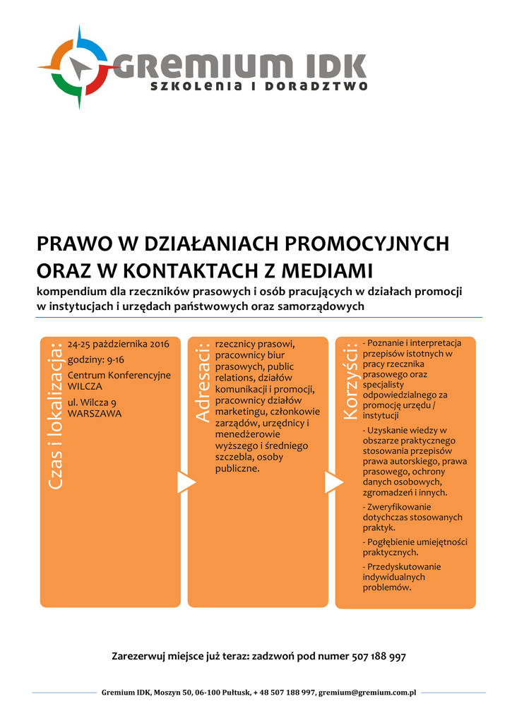 PRAWO W DZIAŁANIACH PROMOCYJNYCH ORAZ W KONTAKTACH Z MEDIAMI godziny: 9-16 Centrum Konferencyjne WILCZA ul. Wilcza 9 WARSZAWA rzecznicy prasowi, pracownicy biur prasowych, public relations, działów komunikacji i promocji, pracownicy działów marketingu, członkowie zarządów, urzędnicy i menedżerowie wyższego i średniego szczebla, osoby publiczne. Korzyści: 24-25 pażdziernika 2016 Adresaci: Czas i lokalizacja: kompendium dla rzeczników prasowych i osób pracujących w działach promocji w instytucjach i urzędach państwowych oraz samorządowych - Poznanie i interpretacja przepisów istotnych w pracy rzecznika prasowego oraz specjalisty odpowiedzialnego za promocję urzędu / instytucji - Uzyskanie wiedzy w obszarze praktycznego stosowania przepisów prawa autorskiego, prawa prasowego, ochrony danych osobowych, zgromadzeń i innych. - Zweryfikowanie dotychczas stosowanych praktyk. - Pogłębienie umiejętności praktycznych. - Przedyskutowanie indywidualnych problemów. Zarezerwuj miejsce już teraz: zadzwoń pod numer 507 188 997 Gremium IDK, Moszyn 50, 06-100 Pułtusk, + 48 507 188 997, [email protected] Cel szkolenia: Celem szkolenia jest przedstawienie interpretacji najbardziej aktualnych przepisów prawa istotnych dla osób zajmujących się działaniami promocyjnymi w urzędzie lub instytucji oraz odpowiedzialnych za kontakty z mediami. To kompleksowe kompendium wiedzy w obszarze prawa pomoże i w znacznym stopniu ułatwi uczestnikom szkolenia prowadzić skuteczne działania promocyjne i medialne w zgodzie z literą prawa. Szkolenie jest odpowiednie zarówno dla uczestników z dużym stażem pracy, jak i dla początkujących specjalistów. Forma seminaryjna spotkania pozwoli na wymianę doświadczeń oraz przedstawienie licznych case study, przybliżających zasady stosowania prawa w omawianym obszarze. Program szkolenia: 1. Regulacje prawne dotyczące promocji urzędu/instytucji (regulacje dotyczące ochrony danych osobowych i informacji niejawnych, ochrony własności intelektualnej, świadczenia usług drogą elektroniczną, odpowiedzialności cywilnoprawnej, dostępu do informacji publicznej - przekrój obowiązków obciążających działy promocji instytucji i urzędów) 2. Prawne aspekty tworzenia i utrzymywania wizerunku (w tym wizerunku w internecie z uwzględnieniem przepisów ustawy o świadczeniu usług drogą elektroniczną, ochrona wizerunku w przepisach kodeksu cywilnego i ustawy o prawie autorskim i prawach pokrewnych. Wizerunek w serwisach społecznościowych – prawne granice działań ukierunkowanych na kreowanie i podtrzymywanie wizerunku. Skutki zgody i cofnięcia zgody na publikacje. Odpowiedzialność cywilna i karna – skutki naruszenia dóbr osobistych, dobrego imienia, wizerunku, prawa do prywatności). 3. Informacja w promocji i budowaniu wizerunku (dane osobowe w akcjach promocyjnych i kreowaniu wizerunku instytucji/urzędu, polityka bezpieczeństwa informacji, zakres przekazywanych informacji a ustawowo chronione tajemnice, wpływ zasad ochrony informacji niejawnych na funkcję informacyjną promocji, zakres i aktualizacja informacji w BIP, informacja publiczna – zasady dostępu i zakres podmiotów uprawnionych do żądania udostępnienia informacji, podmioty upoważnione do udzielania informacji) 4. Wymogi w zakresie prawa telekomunikacyjnego (zasady pozyskiwania i udostępniania danych zgodnie z prawem telekomunikacyjnym, znaczenie regulacji w rekrutacji kandydatów i innych osób udostępniających potencjalne dane osobowe) 5. Informacja w społeczeństwie informacyjnym (zasady przekazywania informacji w świetle przepisów ustawy o świadczeniu usług drogą elektroniczną, tworzenie strony internetowej z uwzględnieniem obowiązujących regulacji prawnych oraz funkcji informacyjnej i aktywizującej strony) 6. Prawo internetu w świetle działań promocyjnych i wizerunkowych Gremium IDK, Moszyn 50, 06-100 Pułtusk, + 48 507 188 997, [email protected] 7. 8. 9. 10. 11. 12. (problematyka piractwa domenowego i rejestracji domen, domena jako element wizerunku instytucji, prawne podstawy ochrony domen, tworzenie biuletynów informacyjnych, dopuszczalność mailingu, mailing a ochrona danych osobowych - kiedy powstaje obowiązek rejestracyjny bazy danych odbiorców mailingu, spam jako niezamówiona informacja handlowa, spam a prawo autorskie) Prawne aspekty organizacji zgromadzeń (obowiązki organizatora, wymogi związane z organizacją zgromadzenia publicznego, wyłączenia zastosowania przepisów ustawy Prawo o zgromadzeniach, analiza zakresu zastosowania ustawy – kiedy zgrupowanie jest zgromadzeniem? – kwalifikacja pikników i publicznych akcji marketingowych jako zgromadzeń) Zakres zastosowania przepisów prawa prasowego w działalności działów promocji (autoryzacja i sprostowanie, zasady przekazywania informacji, naruszenia prawa prasowego, współpraca z mediami i agencjami reklamowymi (zakres przekazywanych informacji, w tym danych osobowych i informacji będących utworami w rozumieniu prawa autorskiego, zasady umieszczania sprostowań, zasady autoryzacji informacji, obowiązek autoryzacyjny w orzecznictwie sądowym) Ochrona własności intelektualnej w działaniach promocyjnych i tworzeniu wizerunku (przesłanki wykorzystania fragmentów utworów/publikacji/informacji w kampaniach i kreowaniu wizerunku – komu przysługują prawa autorskie, jak przenosić te prawa, ustawowe możliwości korzystania z utworów bez zgody twórcy, zasady wykorzystania fotografii w akcjach promocyjnych, pomysł kampanii jako utwór, ochrona pomysłu akcji promocyjnej w świetle prawa autorskiego, ustawy Prawo własności przemysłowej oraz ustawy o zwalczaniu nieuczciwej konkurencji, wykorzystywanie znaków towarowych/wzorów przemysłowych/wzorów użytkowych w kampaniach i budowaniu wizerunku, roszczenia ochronne w przypadku naruszenia własności intelektualnej, umowy licencyjne) Ochrona danych osobowych w akcjach promocyjnych i budowaniu 