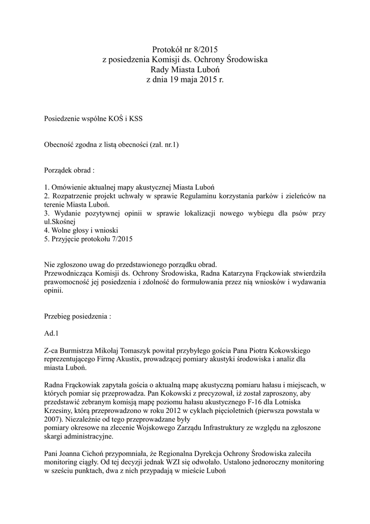 Protokół nr 8/2015 z posiedzenia Komisji ds. Ochrony Środowiska Rady Miasta Luboń z dnia 19 maja 2015 r. Posiedzenie wspólne KOŚ i KSS Obecność zgodna z listą obecności (zał. nr.1) Porządek obrad : 1. Omówienie aktualnej mapy akustycznej Miasta Luboń 2. Rozpatrzenie projekt uchwały w sprawie Regulaminu korzystania parków i zieleńców na terenie Miasta Luboń. 3. Wydanie pozytywnej opinii w sprawie lokalizacji nowego wybiegu dla psów przy ul.Skośnej 4. Wolne głosy i wnioski 5. Przyjęcie protokołu 7/2015 Nie zgłoszono uwag do przedstawionego porządku obrad. Przewodnicząca Komisji ds. Ochrony Środowiska, Radna Katarzyna Frąckowiak stwierdziła prawomocność jej posiedzenia i zdolność do formułowania przez nią wniosków i wydawania opinii. Przebieg posiedzenia : Ad.1 Z-ca Burmistrza Mikołaj Tomaszyk powitał przybyłego gościa Pana Piotra Kokowskiego reprezentującego Firmę Akustix, prowadzącej pomiary akustyki środowiska i analiz dla miasta Luboń. Radna Frąckowiak zapytała gościa o aktualną mapę akustyczną pomiaru hałasu i miejscach, w których pomiar się przeprowadza. Pan Kokowski z precyzował, iż został zaproszony, aby przedstawić zebranym komisją mapę poziomu hałasu akustycznego F-16 dla Lotniska Krzesiny, którą przeprowadzono w roku 2012 w cyklach pięcioletnich (pierwsza powstała w 2007). Niezależnie od tego przeprowadzane były pomiary okresowe na zlecenie Wojskowego Zarządu Infrastruktury ze względu na zgłoszone skargi administracyjne. Pani Joanna Cichoń przypomniała, że Regionalna Dyrekcja Ochrony Środowiska zaleciła monitoring ciągły. Od tej decyzji jednak WZI się odwołało. Ustalono jednoroczny monitoring w sześciu punktach, dwa z nich przypadają w mieście Luboń 1) na prywatnej posesji przy ul. Walki Młodych. 2) na przedszkolu nr 5 Osiedle Lubonianka. Radna Frąckowiak zapytała czy mieszkańcy na podstawie ostatnio sporządzonych map i wyznaczonych stref hałasu mogą ubiegać się o odszkodowania? Pani Joanna Cichoń przytoczyła akty prawne, które wzajemnie się wykluczają nie mniej jednak obowiązuje dwu letni okres karencji od każdego ostatnio przeprowadzonego pomiaru. Radny Wolniewicz dodał, że zdaniem Sądu Administracyjnego w Warszawie żadne strefy ochronne nie istnieją. Burmistrz Tomaszyk przytaknął i dodał, że strefy ochronne są różne dla wojska jak i dla lotnictwa cywilnego. Pan Kokowski podsumował, że strefy dla lotnictwa są różne, ale pomiaru tychże przeprowadza się tak samo dla jednego samolotu czy klucza tzw. liczba operacji. Pomiary są uśrednione dla dnia i nocy i dla dnia wynosi 60 decybeli i pory nocnej 50 decybeli jednej operacji w cyklu 16-sto godzinnym. Kolejne pomiary zostaną wznowione we wrześniu 2015 po zakończeniu remontu pasa lotniska. Radna Woźniak-Patej zapytała o możliwość zwiększenia ilości punktów pomiarowych? Pani Cichoń odpowiedziała, że Wojsko odwołało się od takiej decyzji i Generalny Dyrektor Ochrony Środowiska ograniczył ilość punktów pomiarowych. Dalej Radna Woźniak-Patej zapytała o możliwość pozyskania raportu cząstkowego z przeprowadzonych pomiarów. Pan Kokowski zauważył, że raporty okresowe są przeprowadzane dla Wojska i tylko raport roczny będzie udostępniony wraz z mapą hałasu. Wniosek Radnej Magdaleny Woźniak-Patej do Burmistrza Tomaszyka, aby wystąpił on o w/w raport wraz z mapą hałasu. Burmistrz Tomaszyk stwierdził, że wystąpi po Raport i mapę hałasu zaraz po zakończeniu pomiarów. Radny Wolniewicz zapytał o możliwość monitorowania autostrady i koleii. Pan Kokowski stwierdził, że Firma jego zajmuje się szeregiem różnych pomiarów jak i projektowaniem ekranów dźwiękochłonnych. Radny Wolniewicz pogratulował, jakości i estetyce wykonanych przez Firmę Akustix ekranów zamontowanych przy Lotnisku Ławica. Ad 2 Burmistrz Tomaszyk zauważył, że projekt powstał na wniosek jednego z mieszkańców i ma na celu doprecyzowanie i ujednoliceniu treści oraz poprawy estetyki tabliczki z regulaminem. Nowe tablice rozmieszczone zostaną w: - Parku Papieskiego - Parku Siewcy - na zieleńcach w Luboniu. Radna Frąckowiak zapytała: o koszt ,,Regulaminu” i czy jest on odporny na wandali? Burmistrz Tomaszyk określił koszt na około 1500zł. za szt. i zapewnił, o jakości i walorach estetycznych nowych tablic z regulaminem. Członkowie Komisji Ochrony Środowiska pozytywnie i jednogłośnie zaopiniowali przyjęcie projektu w sprawie Regulaminu korzystania z parków i zieleńców na terenie Miasta Luboń. Ad.3 Burmistrz Tomaszyk opisał miejsce i dostęp do planowanego wybiegu dla psów przy ul. Skośnej. Radna Woźniak-Patej opisała pozytywną reakcję i aprobatę mieszkańców na możliwość powstania wybiegu dla psów w tym rejonie. Radna Frąckowiak wyraziła zaniepokojenie związane z bliskością wybiegu z placem zabaw dla dzieci. Burmistrz Tomaszyk stwierdził, że nie zachodzi tam żaden konflikt, ponieważ oba place będą ogrodzone. Radna Frąckowiak zapytała o koszt budowy wybiegu? Burmistrz Tomaszyk odpowiedział, że około 6000 zł a przewidywany termin oddania wybiegu to wrzesień 2015. Członkowie Komisji Ochrony Środowiska pozytywne i jednogłośnie zaopiniowali lokalizację dla nowego wybiegu dla psów. Ad 4 Radna Frąckowiak zapytała, na jakim etapie jest Konkursu „ Zielony Luboń „ Pani Cichoń wyjaśniła, że obecnie oczekujemy do ostatniego dnia na zgłoszenia. Radna Frąckowiak zapytała o kolejność przystępowania do budowy skwerów? Pani Cichoń wskazała aktualnie budowany skwer u zbiegu ulic 3 Maja/Dąbrowskiego. Burmistrz Tomaszyk sprecyzował kolejność zaplanowanych skwerów wskazując na tereny przy stadionie ul. Rzeczna, drugi skwer ulica Kościuszki vis a vis sklepu Pana Butki, trzeci skwer poddano pod dyskusję. W konsultacji z Panią Cichoń, komisja ustaliła doposażenie skwerku przy NETTO ul. Karłowicza oraz doposażenie w trzy ławki terenu