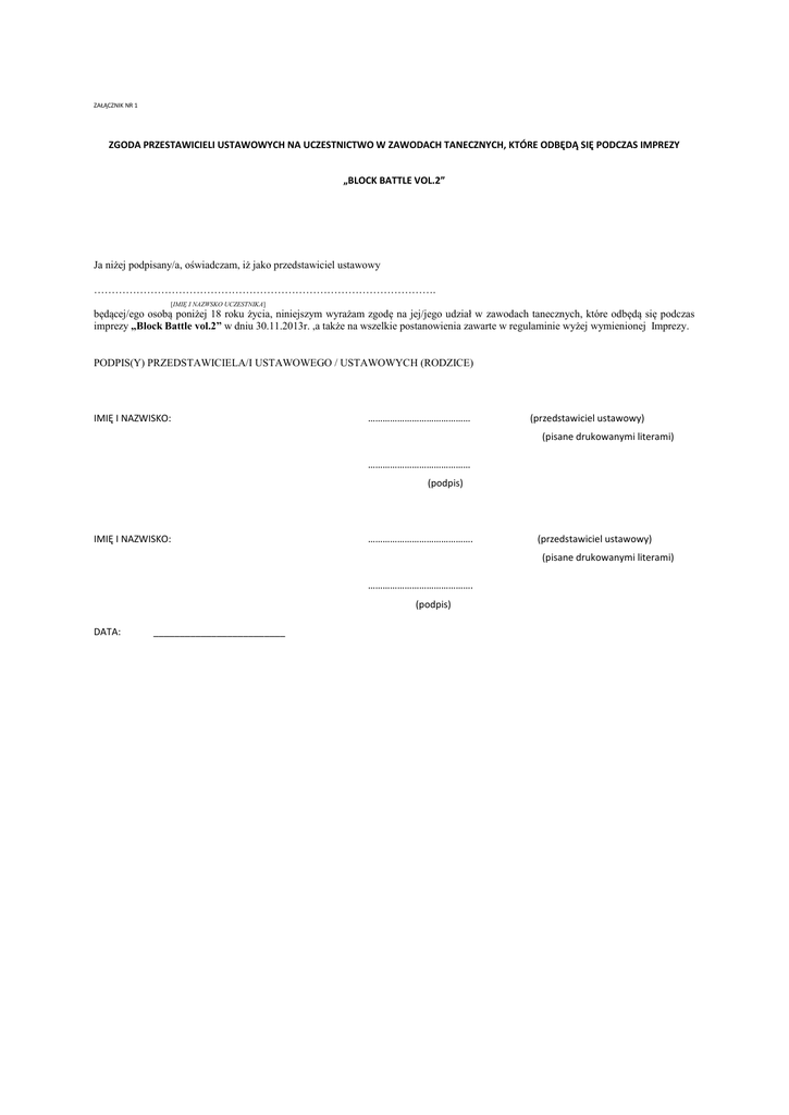 ZAŁĄCZNIK NR 1 ZGODA PRZESTAWICIELI USTAWOWYCH NA UCZESTNICTWO W ZAWODACH TANECZNYCH, KTÓRE ODBĘDĄ SIĘ PODCZAS IMPREZY „BLOCK BATTLE VOL.2” Ja niżej podpisany/a, oświadczam, iż jako przedstawiciel ustawowy ……………………………………………………………………………………. [IMIĘ I NAZWSKO UCZESTNIKA] będącej/ego osobą poniżej 18 roku życia, niniejszym wyrażam zgodę na jej/jego udział w zawodach tanecznych, które odbędą się podczas imprezy „Block Battle vol.2” w dniu 30.11.2013r. ,a także na wszelkie postanowienia zawarte w regulaminie wyżej wymienionej Imprezy. PODPIS(Y) PRZEDSTAWICIELA/I USTAWOWEGO / USTAWOWYCH (RODZICE) IMIĘ I NAZWISKO: …………………………………… (przedstawiciel ustawowy) (pisane drukowanymi literami) …………………………………… (podpis) IMIĘ I NAZWISKO: ……………………………………. (przedstawiciel ustawowy) (pisane drukowanymi literami) ……………………………………. (podpis) DATA: _________________________ ZAŁĄCZNIK NR 2 ………………………………………….. imię i nazwisko …………………………………………. adres zamieszkania UPOWAŻNIENIE Upoważniam Gdański Archipelag Kultury w Gdańsku do przekazania nagrody przyznanej na imprezie „Block Battle vol.2”, dla ( Imię i nazwisko zwycięzcy) ……………………….……..…………………………… ,którego jestem pełnoprawnym opiekunem/rodzicem na niżej wymieniony rachunek bankowy: …………………………………………………………………………………………………………….….. ……………………….. Podpis ZAŁĄCZNIK NR 2 ………………………………………….. imię i nazwisko …………………………………………. adres zamieszkania UPOWAŻNIENIE Upoważniam Gdański Archipelag Kultury w Gdańsku do wypłaty gotówką nagrody przyznanej na imprezie „Block Battle vol.2”, dla ( Imię i nazwisko zwycięzcy) ……………………….………………………………………..……… ,którego jestem pełnoprawnym opiekunem/rodzicem. ……………………….. Podpis