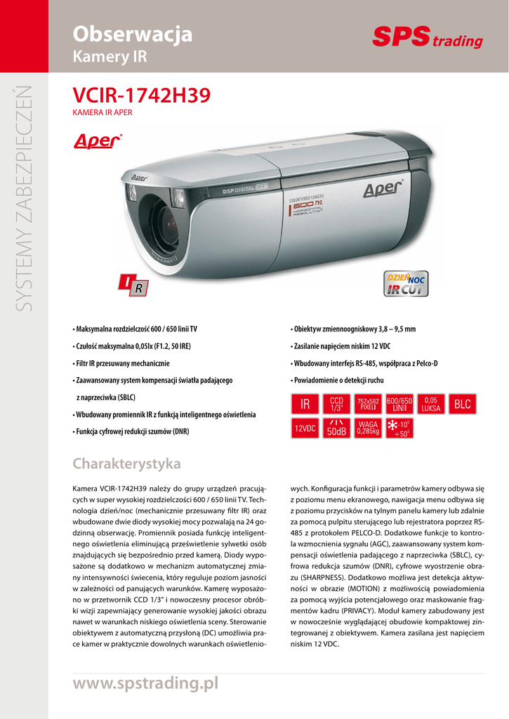 Obserwacja SYSTEMY ZABEZPIECZEŃ Kamery IR VCIR-1742H39 KAMERA IR APER • Maksymalna rozdzielczość 600 / 650 linii TV • Obiektyw zmiennoogniskowy 3,8 – 9,5 mm • Czułość maksymalna 0,05lx (F1.2, 50 IRE) • Zasilanie napięciem niskim 12 VDC • Filtr IR przesuwany mechanicznie • Wbudowany interfejs RS-485, współpraca z Pelco-D • Zaawansowany system kompensacji światła padającego • Powiadomienie o detekcji ruchu z naprzeciwka (SBLC) • Wbudowany promiennik IR z funkcją inteligentnego oświetlenia • Funkcja cyfrowej redukcji szumów (DNR) Charakterystyka Kamera VCIR-1742H39 należy do grupy urządzeń pracujących w super wysokiej rozdzielczości 600 / 650 linii TV. Technologia dzień/noc (mechanicznie przesuwany filtr IR) oraz wbudowane dwie diody wysokiej mocy pozwalają na 24 godzinną obserwację. Promiennik posiada funkcję inteligentnego oświetlenia eliminującą prześwietlenie sylwetki osób znajdujących się bezpośrednio przed kamerą. Diody wyposażone są dodatkowo w mechanizm automatycznej zmiany intensywności świecenia, który reguluje poziom jasności w zależności od panujących warunków. Kamerę wyposażono w przetwornik CCD 1/3” i nowoczesny procesor obróbki wizji zapewniający generowanie wysokiej jakości obrazu nawet w warunkach niskiego oświetlenia sceny. Sterowanie obiektywem z automatyczną przysłoną (DC) umożliwia prace kamer w praktycznie dowolnych warunkach oświetlenio- www.spstrading.pl wych. Konfiguracja funkcji i parametrów kamery odbywa się z poziomu menu ekranowego, nawigacja menu odbywa się z poziomu przycisków na tylnym panelu kamery lub zdalnie za pomocą pulpitu sterującego lub rejestratora poprzez RS485 z protokołem PELCO-D. Dodatkowe funkcje to kontrola wzmocnienia sygnału (AGC), zaawansowany system kompensacji oświetlenia padającego z naprzeciwka (SBLC), cyfrowa redukcja szumów (DNR), cyfrowe wyostrzenie obrazu (SHARPNESS). Dodatkowo możliwa jest detekcja aktywności w obrazie (MOTION) z możliwością powiadomienia za pomocą wyjścia potencjałowego oraz maskowanie fragmentów kadru (PRIVACY). Moduł kamery zabudowany jest w nowocześnie wyglądającej obudowie kompaktowej zintegrowanej z obiektywem. Kamera zasilana jest napięciem niskim 12 VDC. DANE TECHNICZNE - VCIR-1742H39 PARAMETRY TECHNICZNE System PAL standard 625 linii, 25 klatek/sek. Moduł CCD 1/3” Interline CCD Częstotliwość skanowania 15,625kHz; 50Hz Efektywna ilość pikseli 752 x 582 Minimalne natężenie światła (czułość) 0,05/0,0 lx (F1.2, 50 IRE) Rozdzielczość pozioma 600 / 650 linii TV Stosunek S/N > 50 dB (AGC wył) Synchronizacja Wewnętrzna Korekcja gamma 0,45 Ogniskowa obiektywu 3,8 – 9,5 mm; F1.2 Regulacja bilansu bieli ATW / MANUAL / PUSH Redukcja migotania Tak (Flickerless) Technologia dzień/noc Tak, mechanicznie przesuwany filtr IR Przełączanie trybów dzień/noc Automatyczne Wyjście RS-485 Tak, na tylnym panelu Komunikacja Protokół PELCO D (2400 kbps, 4800 kbps, 9600 kbps, 57600 kbps) Ilość diod IR 2 Długość fali 850 nm Zasięg promiennika 20 m Kontrola wzmocnienia (AGC) Tak Kompensacja oświetlenia tła (BLC) Tak LOW / MIDDLE / HIGH Funkcja detekcji ruchu Powiadomienie o detekcji ruchu Tak, 4 strefy detekcji W obrazie oraz na wyjściu potencjałowym Strefy prywatności Tak, 4 strefy prywatności Funkcja odbicia lustrzanego Tak, wzgl. osi poziomej Redukcja szumów (DNR) Tak LOW / MIDDLE / HIGH Funkcja wyostrzania obrazu Tak 1~20 Menu ekranowe OSD Wyjście wideo Tak BNC 1,0V [p-p], 75Ω – główne i pomocnicze Zasilanie 12 VDC Pobór mocy Temperatura pracy 4W Od -10°C do 50°C Wymiary (śr. x dł) 68 x 155 mm Centrala - ul. Wał Miedzeszyński 630, 03-994 Warszawa; tel. 022 518 31 50, fax 022 518 31 70, e-mail: [email protected] BH Gdańsk - ul. Drożyny 6, 80-302 Gdańsk; tel. 058 624 83 04, fax 058 668 59 20, e-mail: [email protected] BH Katowice - ul. Kościuszki 227, 40-600 Katowice; tel. 032 255 64 27, fax 032 255 64 52, e-mail: [email protected] BH Łódź - ul. Drewnowska 48, 91-002 Łódź; tel. 042 617 00 32, fax 042 659 85 23, e-mail: [email protected] BH Poznań - ul. Polska 60, 60-595 Poznań; tel. 061 852 19 02, fax 061 825 09 03, e-mail: [email protected] BH Toruń - ul. Grudziądzka 176, 87-100 Toruń; tel. 056 653 99 43, fax 056 653 90 81, e-mail: [email protected] BH Wrocław - ul. Inowrocławska 39 C, 53-649 Wrocław; tel. 071 348 44 64, fax 071 348 36 35, e-mail: [email protected] 285 g Dystrybutor Waga