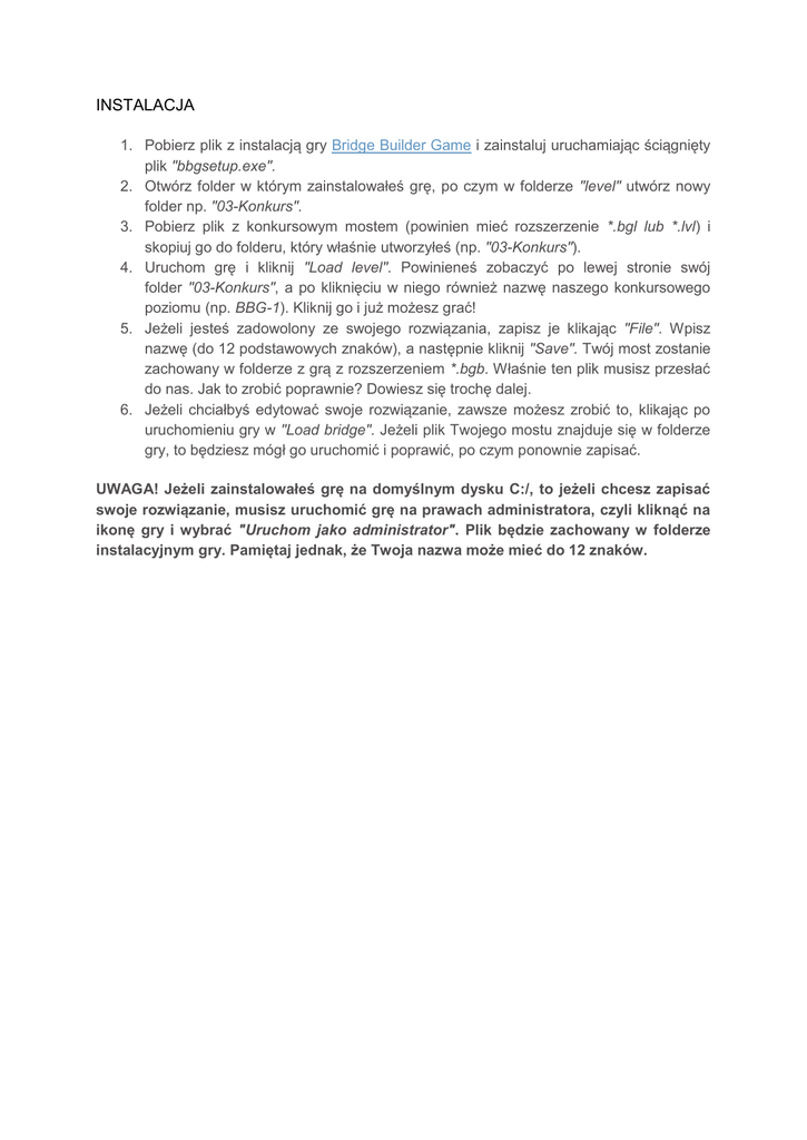 INSTALACJA 1. Pobierz plik z instalacją gry Bridge Builder Game i zainstaluj uruchamiając ściągnięty plik "bbgsetup.exe". 2. Otwórz folder w którym zainstalowałeś grę, po czym w folderze "level" utwórz nowy folder np. "03-Konkurs". 3. Pobierz plik z konkursowym mostem (powinien mieć rozszerzenie *.bgl lub *.lvl) i skopiuj go do folderu, który właśnie utworzyłeś (np. "03-Konkurs"). 4. Uruchom grę i kliknij "Load level". Powinieneś zobaczyć po lewej stronie swój folder "03-Konkurs", a po kliknięciu w niego również nazwę naszego konkursowego poziomu (np. BBG-1). Kliknij go i już możesz grać! 5. Jeżeli jesteś zadowolony ze swojego rozwiązania, zapisz je klikając "File". Wpisz nazwę (do 12 podstawowych znaków), a następnie kliknij "Save". Twój most zostanie zachowany w folderze z grą z rozszerzeniem *.bgb. Właśnie ten plik musisz przesłać do nas. Jak to zrobić poprawnie? Dowiesz się trochę dalej. 6. Jeżeli chciałbyś edytować swoje rozwiązanie, zawsze możesz zrobić to, klikając po uruchomieniu gry w "Load bridge". Jeżeli plik Twojego mostu znajduje się w folderze gry, to będziesz mógł go uruchomić i poprawić, po czym ponownie zapisać. UWAGA! Jeżeli zainstalowałeś grę na domyślnym dysku C:/, to jeżeli chcesz zapisać swoje rozwiązanie, musisz uruchomić grę na prawach administratora, czyli kliknąć na ikonę gry i wybrać "Uruchom jako administrator". Plik będzie zachowany w folderze instalacyjnym gry. Pamiętaj jednak, że Twoja nazwa może mieć do 12 znaków.