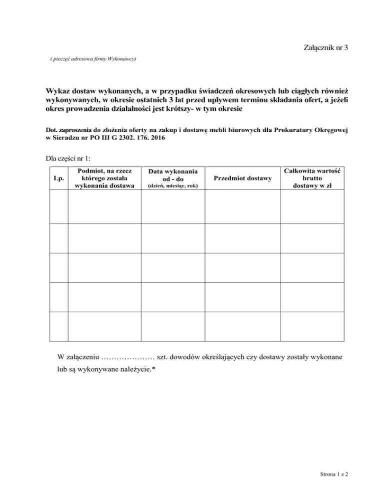 Załącznik nr 3 ( pieczęć adresowa firmy Wykonawcy) Wykaz dostaw wykonanych, a w przypadku świadczeń okresowych lub ciągłych również wykonywanych, w okresie ostatnich 3 lat przed upływem terminu składania ofert, a jeżeli okres prowadzenia działalności jest krótszy- w tym okresie Dot. zaproszenia do złożenia oferty na zakup i dostawę mebli biurowych dla Prokuratury Okręgowej w Sieradzu nr PO III G 2302. 176. 2016 Dla części nr 1: Lp. Podmiot, na rzecz którego została wykonania dostawa Data wykonania od - do (dzień, miesiąc, rok) Przedmiot dostawy Całkowita wartość brutto dostawy w zł W załączeniu ………………… szt. dowodów określających czy dostawy zostały wykonane lub są wykonywane należycie.* Strona 1 z 2 Dla części nr 2: Lp. Podmiot, na rzecz którego została wykonania dostawa Data wykonania od - do Przedmiot dostawy (dzień, miesiąc, rok) Całkowita wartość brutto dostawy w zł W załączeniu ………………… szt. dowodów określających czy dostawy zostały wykonane lub są wykonywane należycie.* * dowodami, o których mowa, są referencje bądź inne dokumenty wystawione przez podmiot, na rzecz którego dostawy lub usługi były wykonywane, a w przypadku świadczeń okresowych lub ciągłych są wykonywane, a jeżeli z uzasadnionej przyczyny o obiektywnym charakterze wykonawca nie jest w stanie uzyskać tych dokumentów - oświadczenie wykonawcy; w przypadku świadczeń okresowych lub ciągłych nadal wykonywanych referencje bądź inne dokumenty potwierdzające ich należyte wykonywanie powinny być wydane nie wcześniej niż 3 miesiące przed upływem terminu składania ofert albo wniosków o dopuszczenie do udziału w postępowaniu Miejscowość ..................................., dnia ........................................... Podpisano .................................................. (podpis i pieczęć osób (y) upoważnionych (ej) do reprezentowania firmy wymienionych(ej) w rejestrze lub ewidencji działalności gospodarczej) Strona 2 z 2