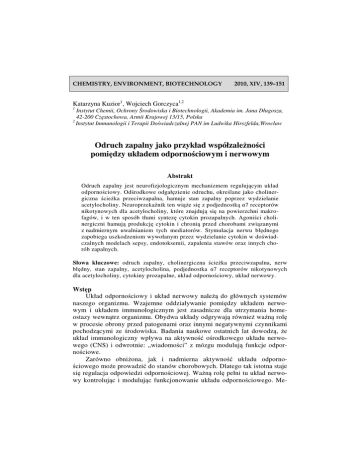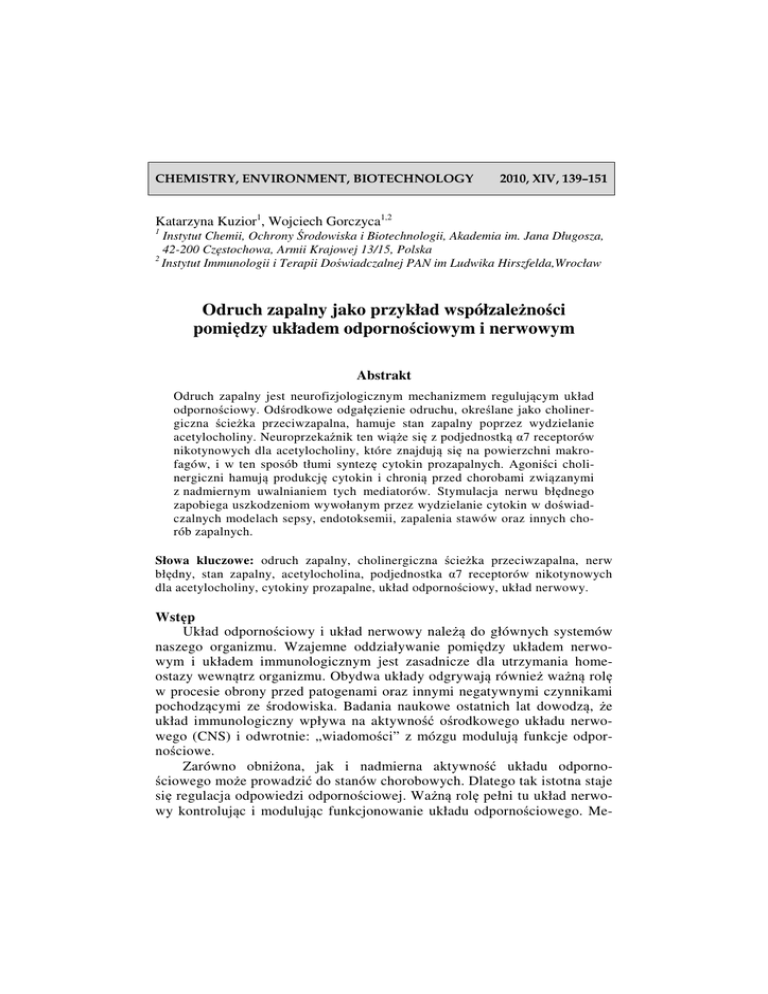 CHEMISTRY, ENVIRONMENT, BIOTECHNOLOGY 2010, XIV, 139–151 Katarzyna Kuzior1, Wojciech Gorczyca1,2 1 Instytut Chemii, Ochrony Środowiska i Biotechnologii, Akademia im. Jana Długosza, 42-200 Częstochowa, Armii Krajowej 13/15, Polska 2 Instytut Immunologii i Terapii Doświadczalnej PAN im Ludwika Hirszfelda,Wrocław Odruch zapalny jako przykład współzależności pomiędzy układem odpornościowym i nerwowym Abstrakt Odruch zapalny jest neurofizjologicznym mechanizmem regulującym układ odpornościowy. Odśrodkowe odgałęzienie odruchu, określane jako cholinergiczna ścieżka przeciwzapalna, hamuje stan zapalny poprzez wydzielanie acetylocholiny. Neuroprzekaźnik ten wiąże się z podjednostką α7 receptorów nikotynowych dla acetylocholiny, które znajdują się na powierzchni makrofagów, i w ten sposób tłumi syntezę cytokin prozapalnych. Agoniści cholinergiczni hamują produkcję cytokin i chronią przed chorobami związanymi z nadmiernym uwalnianiem tych mediatorów. Stymulacja nerwu błędnego zapobiega uszkodzeniom wywołanym przez wydzielanie cytokin w doświadczalnych modelach sepsy, endotoksemii, zapalenia stawów oraz innych chorób zapalnych. Słowa kluczowe: odruch zapalny, cholinergiczna ścieżka przeciwzapalna, nerw błędny, stan zapalny, acetylocholina, podjednostka α7 receptorów nikotynowych dla acetylocholiny, cytokiny prozapalne, układ odpornościowy, układ nerwowy. Wstęp Układ odpornościowy i układ nerwowy należą do głównych systemów naszego organizmu. Wzajemne oddziaływanie pomiędzy układem nerwowym i układem immunologicznym jest zasadnicze dla utrzymania homeostazy wewnątrz organizmu. Obydwa układy odgrywają również ważną rolę w procesie obrony przed patogenami oraz innymi negatywnymi czynnikami pochodzącymi ze środowiska. Badania naukowe ostatnich lat dowodzą, że układ immunologiczny wpływa na aktywność ośrodkowego układu nerwowego (CNS) i odwrotnie: „wiadomości” z mózgu modulują funkcje odpornościowe. Zarówno obniżona, jak i nadmierna aktywność układu odpornościowego może prowadzić do stanów chorobowych. Dlatego tak istotna staje się regulacja odpowiedzi odpornościowej. Ważną rolę pełni tu układ nerwowy kontrolując i modulując funkcjonowanie układu odpornościowego. Me- K. Kuzior, W. Gorczyca 140 chanizm odruchu zapalnego jest przykładem immunosupresyjnego działania układu nerwowego. Powiązania układu odpornościowego i nerwowego Układ odpornościowy i nerwowy są ściśle powiązane i komunikują się ze sobą by razem odpowiadać za odporność. Komunikacja ta polega na wytwarzaniu specjalnych mediatorów takich jak: cytokiny, neuropeptydy oraz neuroprzekaźniki. Limfocyty i makrofagi wytwarzają głównie cytokiny ale zdolne są również do wydzielania neuropeptydów oraz opioidów. Podobnie komórki układu nerwowego wytwarzają neuropeptydy i neuroprzekaźniki ale w mózgu obserwuje się również ekspresję cytokin. Ponadto komórki obu układów posiadają receptory dla przekaźników, dzięki czemu wzajemnie odbierają sygnały od siebie i mogą na nie odpowiadać1, 2, 3, 4, 5. Autonomiczny układ nerwowy unerwia centralne i obwodowe narządy limfatyczne. Z zakończeń nerwowych uwalniane są neuroprzekaźniki, które po związaniu z receptorami komórek układu odpornościowego, regulują funkcjonowanie tego układu1, 6, 7, 8. Centralny układ nerwowy Neuropeptydy Hormony Neuroprzekaźniki Cytokiny Układ odpornościowy Ryc. 1. Współzależność centralnego układu nerwowego i układu odpornościowego2 Stan zapalny Zapalenie (stan zapalny) jest normalną, fizjologiczną odpowiedzią gospodarza na wtargnięcie patogenu do organizmu lub na uszkodzenie tkanek. Objawami klinicznymi są: obrzęk, ból, rumień oraz gorączka9. Odpowiedź zapalna ma na celu zneutralizowanie infekcji, naprawę uszkodzeń oraz przyspieszenie gojenia się ran10, 11. 141 Odruch zapalny jako przykład współzależności pomiędzy … Najdokładniej poznana jest odpowiedź organizmu na infekcje mikrobiologiczne, szczególnie bakteryjne, gdzie patogeny wykrywane są przez receptory wrodzonego układu odpornościowego. Receptory te znane są jako receptory Toll-podobne (TLR, Toll like receptors), a ich ekspresja zachodzi na powierzchni takich komórek jak: tkankowe makrofagi, komórki tuczne oraz komórki dendrytyczne. Rozpoznanie czynników infekcyjnych przez te komórki indukuje wydzielanie mediatorów zapalnych12, 13. Początek stanu zapalnego charakteryzuje się uwalnianiem prozapalnych mediatorów, takich jak czynnik martwicy nowotworu (TNF-α), IL-1β, cząsteczki adhezyjne oraz czynniki naczynioaktywne. Wczesne uwalnianie cytokin prozapalnych przez aktywowane makrofagi odgrywa zasadniczą rolę w uruchamianiu miejscowej odpowiedzi zapalnej. Jednakże nadmierna produkcja tych cytokin oraz białka wysokiej mobilności (HMGB1, high mobility group B1) może być bardziej szkodliwa niż czynnik wywołujący zapalenie i prowadzić do chronicznego stanu zapalnego. Może zwiększać uszkodzenie tkanek, obniżać ciśnienie krwi, przyczyniać się do powstania wielu chorób autoimmunizacyjnych, a nawet prowadzić do śmierci. Dlatego też odpowiedź zapalna musi być kontrolowana i równoważona przez czynniki przeciwzapalne, takie jak IL-4, IL-10 oraz transformujący czynnik wzrostu TGF-β. Ponadto cytokiny prozapalne TNF-α oraz IL-1β są cząsteczkami sygnałowymi aktywującymi mechanizmy modulujące zapalenie. W mechanizmach tych uczestniczy oś HPA oraz współczulny układ nerwowy (SNS), kontrolując stan zapalny. Również nerw błędny pełni rolę przeciwzapalną, a mechanizm wykorzystujący jego działanie nazwany jest cholinergiczną ścieżką przeciwzapalną, która hamuje stan zapalny11. Mediatory zapalne powodują zmiany w śródbłonku naczyń krwionośnych oraz indukują ekspresję powierzchniowych cząsteczek adhezyjnych. Komórki odpowiedzi zapalnej łączą się z cząsteczkami adhez