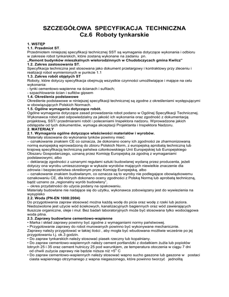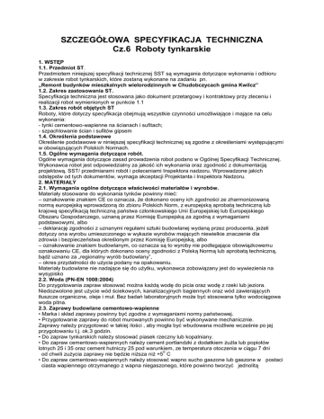 SZCZEGÓŁOWA SPECYFIKACJA TECHNICZNA Cz.6 Roboty tynkarskie 1. WSTĘP 1.1. Przedmiot ST. Przedmiotem niniejszej specyfikacji technicznej SST są wymagania dotyczące wykonania i odbioru w zakresie robot tynkarskich, które zostaną wykonane na zadaniu pn. „Remont budynków mieszkalnych wielorodzinnych w Chudobczycach gmina Kwilcz” 1.2. Zakres zastosowania ST. Specyfikacja techniczna jest stosowana jako dokument przetargowy i kontraktowy przy zleceniu i realizacji robot wymienionych w punkcie 1.1 1.3. Zakres robót objętych ST Roboty, które dotyczy specyfikacja obejmują wszystkie czynności umożliwiające i mające na celu wykonania: - tynki cementowo-wapienne na ścianach i sufitach; - szpachlowanie ścian i sufitów gipsem 1.4. Określenia podstawowe Określenie podstawowe w niniejszej specyfikacji technicznej są zgodne z określeniami występującymi w obowiązujących Polskich Normach. 1.5. Ogólne wymagania dotyczące robót. Ogólne wymagania dotyczące zasad prowadzenia robot podano w Ogólnej Specyfikacji Technicznej. Wykonawca robot jest odpowiedzialny za jakość ich wykonania oraz zgodność z dokumentacją projektową, SST/ przedmiarami robót i poleceniami Inspektora nadzoru. Wprowadzone jakich odstępstw od tych dokumentów, wymaga akceptacji Projektanta i Inspektora Nadzoru. 2. MATERIAŁY 2.1. Wymagania ogólne dotyczące właściwości materiałów i wyrobów. Materiały stosowane do wykonania tynków powinny mieć: – oznakowanie znakiem CE co oznacza, że dokonano oceny ich zgodności ze zharmonizowaną normą europejską wprowadzoną do zbioru Polskich Norm, z europejską aprobatą techniczną lub krajową specyfikacją techniczną państwa członkowskiego Unii Europejskiej lub Europejskiego Obszaru Gospodarczego, uznaną przez Komisję Europejską za zgodną z wymaganiami podstawowymi, albo – deklarację zgodności z uznanymi regułami sztuki budowlanej wydaną przez producenta, jeżeli dotyczy ona wyrobu umieszczonego w wykazie wyrobów mających niewielkie znaczenie dla zdrowia i bezpieczeństwa określonym przez Komisję Europejską, albo – oznakowanie znakiem budowlanym, co oznacza są to wyroby nie podlegające obowiązkowemu oznakowaniu CE, dla których dokonano oceny zgodności z Polską Normą lub aprobatą techniczną, bądź uznano za „regionalny wyrób budowlany”, – okres przydatności do użycia podany na opakowaniu. Materiały budowlane nie nadające się do użytku, wykonawca zobowiązany jest do wywiezienia na wysypisko 2.2. Woda (PN-EN 1008:2004) Do przygotowania zapraw stosować można każdą wodę do picia oraz wodę z rzeki lub jeziora. Niedozwolone jest użycie wód ściekowych, kanalizacyjnych bagiennych oraz wód zawierających tłuszcze organiczne, oleje i muł. Bez badań laboratoryjnych może być stosowana tylko wodociągowa woda pitna. 2.3. Zaprawy budowlane cementowo-wapienne • Marka i skład zaprawy powinny być zgodne z wymaganiami normy państwowej. • Przygotowanie zaprawy do robot murowanych powinno być wykonywane mechanicznie. Zaprawy należy przygotować w takiej ilości , aby mogła być wbudowana możliwie wcześnie po jej przygotowaniu t.j. ok.3 godzin. • Do zapraw tynkarskich należy stosować piasek rzeczny lub kopalniany. • Do zapraw cementowo-wapiennych należy cement portlandzki z dodatkiem żużla lub popiołów lotnych 25 i 35 oraz cement hutniczy 25 pod warunkiem, ze temperatura otoczenia w ciągu 7 dni 0 od chwili zużycia zaprawy nie będzie niższa niż +5 C • Do zapraw cementowo-wapiennych należy stosować wapno sucho gaszone lub gaszone w postaci ciasta wapiennego otrzymanego z wapna niegaszonego, które powinno tworzyć jednolitą jednobarwną masę, bez grudek niegaszonego wapna i zanieczyszczeń obcych. Skład objętościowy zapraw należy dobierać doświadczalnie, w zależności od wymaganej marki zaprawy oraz rodzaju cementu i wapna. 3. SPRZĘT Ogólne wymagania dotyczące sprzętu podano w ST „Wymagania ogólne” Wykonawca zobowiązany jest do użytkowania jedynie takiego sprzętu, który nie spowoduje negatywnych skutków dla prowadzonych robot. Wykaz sprzętu przewidywanego do użycia powinien być zaakceptowany przez Inspektora Nadzoru. Wykonawca przystępujący do tynków zwykłych powinien wykazać się możliwością korzystania ze sprzętu: - mieszarki do zapraw. - agregatu tynkarskiego, - przenośnych zbiorników na wodę 4. TRANSPORT Ogólne wymagania dotyczące transportu podano w ST „Wymagania ogólne” Materiały do wykonania robot powinny być przewożone dowolnymi środkami transportu, w sposób zapewniający zabezpieczenie przed przesuwaniem czy uszkodzeniem w czasie jazdy na środku transportowym oraz zgodnie z przepisami BHP i ruchu drogowego. 4.1. Transport materiałów Wyroby do robot tynkowych mogą być przewożone jednostkami transportu samochodowego, kolejowego, wodnego i innymi. Załadunek i wyładunek wyrobów w opakowaniach, ułożonych na paletach należy prowadzić sprzętem mechanicznym. Załadunek i wyładunek wyrobów w opakowaniach, układanych luzem wykonuje się ręcznie. Ręczny załadunek zaleca się prowadzić przy maksymalnym wykorzystaniu sprzętu i narzędzi pomocniczych takich jak: chwytaki, wciągniki, wózki. Środki transportu do przewozu wyrobów workowanych powinny umożliwiać zabezpieczenie tych wyrobów przed zawilgoceniem. Cement i wapno suchogaszone luzem należy przewozić cementowozami. Wapno gaszone w postaci ciasta wapiennego można przewozić w skrzyniach lub pojemnikach stalowych. Kruszywa można przewozić dowolnymi środkami transportu w warunkach zabezpieczających je przed zanieczyszczeniem, zmieszaniem z innymi asortymentami kruszywa lub jego frakcjami i nadmiernym zawilgoceniem. 4.2.Warunki przyjęcia na budowę wyrobów do robót tynkowych Wyroby do robot tynkowych mogą być przyjęte na budowę, jeśli spełniają następujące warunki: – są zgodne z ich wyszczególnieniem i charakterystyką podaną w doku