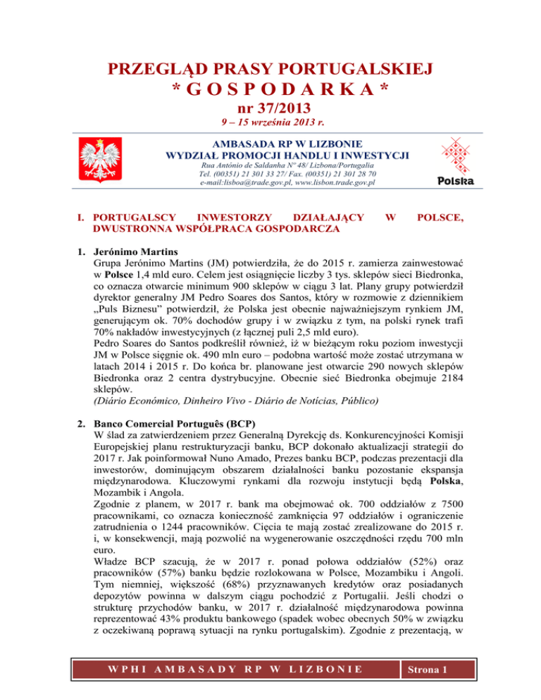 PRZEGLĄD PRASY PORTUGALSKIEJ *GOSPODARKA* nr 37/2013 9 – 15 września 2013 r. AMBASADA RP W LIZBONIE WYDZIAŁ PROMOCJI HANDLU I INWESTYCJI Rua António de Saldanha Nº 48/ Lizbona/Portugalia Tel. (00351) 21 301 33 27/ Fax. (00351) 21 301 28 70 e-mail:[email protected], www.lisbon.trade.gov.pl I. PORTUGALSCY INWESTORZY DZIAŁAJĄCY DWUSTRONNA WSPÓŁPRACA GOSPODARCZA W POLSCE, 1. Jerónimo Martins Grupa Jerónimo Martins (JM) potwierdziła, że do 2015 r. zamierza zainwestować w Polsce 1,4 mld euro. Celem jest osiągnięcie liczby 3 tys. sklepów sieci Biedronka, co oznacza otwarcie minimum 900 sklepów w ciągu 3 lat. Plany grupy potwierdził dyrektor generalny JM Pedro Soares dos Santos, który w rozmowie z dziennikiem „Puls Biznesu” potwierdził, że Polska jest obecnie najważniejszym rynkiem JM, generującym ok. 70% dochodów grupy i w związku z tym, na polski rynek trafi 70% nakładów inwestycyjnych (z łącznej puli 2,5 mld euro). Pedro Soares do Santos podkreślił również, iż w bieżącym roku poziom inwestycji JM w Polsce sięgnie ok. 490 mln euro – podobna wartość może zostać utrzymana w latach 2014 i 2015 r. Do końca br. planowane jest otwarcie 290 nowych sklepów Biedronka oraz 2 centra dystrybucyjne. Obecnie sieć Biedronka obejmuje 2184 sklepów. (Diário Económico, Dinheiro Vivo - Diário de Notícias, Público) 2. Banco Comercial Português (BCP) W ślad za zatwierdzeniem przez Generalną Dyrekcję ds. Konkurencyjności Komisji Europejskiej planu restrukturyzacji banku, BCP dokonało aktualizacji strategii do 2017 r. Jak poinformował Nuno Amado, Prezes banku BCP, podczas prezentacji dla inwestorów, dominującym obszarem działalności banku pozostanie ekspansja międzynarodowa. Kluczowymi rynkami dla rozwoju instytucji będą Polska, Mozambik i Angola. Zgodnie z planem, w 2017 r. bank ma obejmować ok. 700 oddziałów z 7500 pracownikami, co oznacza konieczność zamknięcia 97 oddziałów i ograniczenie zatrudnienia o 1244 pracowników. Cięcia te mają zostać zrealizowane do 2015 r. i, w konsekwencji, mają pozwolić na wygenerowanie oszczędności rzędu 700 mln euro. Władze BCP szacują, że w 2017 r. ponad połowa oddziałów (52%) oraz pracowników (57%) banku będzie rozlokowana w Polsce, Mozambiku i Angoli. Tym niemniej, większość (68%) przyznawanych kredytów oraz posiadanych depozytów powinna w dalszym ciągu pochodzić z Portugalii. Jeśli chodzi o strukturę przychodów banku, w 2017 r. działalność międzynarodowa powinna reprezentować 43% produktu bankowego (spadek wobec obecnych 50% w związku z oczekiwaną poprawą sytuacji na rynku portugalskim). Zgodnie z prezentacją, w WPHI AMBASADY RP W LIZBONIE Strona 1 PRZEGLĄD PRASY PORTUGALSKIEJ “GOSPODARKA” - nr 37/2013 2017 r. Polska ma być odpowiedzialna za 36% wyniku netto BCP. Wskaźnik rentowności kapitału własnego ROE z działalności na polskim rynku ma wzrosnąć z 10,2% na koniec 2012 r. do 14-15% w 2015, podczas gdy wskaźnik kapitałowy core tier One ma sięgać ponad 10%. Założenia dla rozwoju działalności BCP w Polsce przewidują wzrost poziomu kredytu konsumpcyjnego, poszukiwanie nowych możliwości w zakresie sektora przedsiębiorstw oraz zintensyfikowanie działań skierowanych do MŚP. Jeśli chodzi o Mozambik i Angolę, w 2015 r. BCP zamierza osiągnąć na tych rynkach wskaźnik ROE na poziomie ponad 20%. Celem odzyskania rentowności w Portugalii, BCP ma oprzeć swoją działalność na trzech filarach: wzrost przychodów operacyjnych, wzrost wydajności operacyjnej oraz ograniczenie poziomu ryzyka działalności. Osiągnięcie wyższej wydajności ma być osiągnięte poprzez zredukowanie liczby pracowników oraz oddziałów o 20%. Do 2017 r. BCP zamierza sprzedać całe swoje udziały w Millennium Gestão de Activos, portfelach kredytowych BCP Bank&Trust i BCP Banque Prive, a także realizować wykup warunkowych obligacji zamiennych na akcje tzw. CoCos. W związku z ogłoszeniem planu restrukturyzacji BCP, 19 września br. rozpocząć się mają negocjacje między bankiem a portugalską federacją związków zawodowych sektora bankowego Febase, które dotyczyć będą możliwych cięć wynagrodzeń oraz dobrowolnych odejść. (Jornal de Negócios, Diário de Notícias, Diário Económico, Vida Económica, Jornal de Negócios, Público, TVI24) 3. EDP Renováveis EDP Renováveis (EDPR), w ramach strategii rotacji aktywów, sprzedała 49% parku wiatrowego Wheat Field w Stanach Zjednoczonych na rzecz Fiera Axium. Wartość parku zainstalowanego w 2009 r. wynosi ok. 148,5 mln euro. Posiada on moc na poziomie 97 MW oraz kontrakt na sprzedaż energii na okres 20 lat. Sprzedaż mniejszościowych udziałów jest jednym z głównych założeń EDPR, jako że ma zapewnić wyższa wartość przyszłych przepływów pieniężnych projektów i umożliwić inwestowanie w rozwój projektów o wartości dodanej. Dotychczas, EDPR zrealizował trzy transakcje tego typu – na rzecz Borealis, China Three Gorges oraz Fiera Axium, o łącznej wartości 582 mln euro. Dochody z tego tytułu za cały bieżący rok powinny osiągnąć co najmniej 1 mld euro. (Diário Económico, Diário de Notícias, Jornal de Negócios, Oje) +++ WPHI AMBASADY RP W LIZBONIE Strona 2