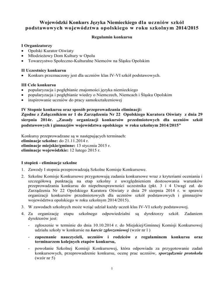 Wojewódzki Konkurs Języka Niemieckiego dla uczniów szkół podstawowych województwa opolskiego w roku szkolnym 2014/2015 Regulamin konkursu I Organizatorzy Opolski Kurator Oświaty Młodzieżowy Dom Kultury w Opolu Towarzystwo Społeczno-Kulturalne Niemców na Śląsku Opolskim II Uczestnicy konkursu Konkurs przeznaczony jest dla uczniów klas IV-VI szkół podstawowych. III Cele konkursu popularyzacja i pogłębianie znajomości języka niemieckiego popularyzacja i pogłębianie wiedzy o Niemczech, Niemcach i Śląsku Opolskim inspirowanie uczniów do pracy samokształceniowej IV Stopnie konkursu oraz sposób przeprowadzania eliminacji: Zgodne z Załącznikiem nr 1 do Zarządzenia Nr 22 Opolskiego Kuratora Oświaty z dnia 29 sierpnia 2014r. „Zasady organizacji konkursów przedmiotowych dla uczniów szkół podstawowych i gimnazjów województwa opolskiego w roku szkolnym 2014/2015” Konkursy przeprowadzane są w następujących terminach: eliminacje szkolne: do 21.11.2014 r. eliminacje miejskie/gminne: 13 stycznia 2015 r. eliminacje wojewódzkie: 12 lutego 2015 r. I stopień - eliminacje szkolne 1. Zawody I stopnia przeprowadzają Szkolne Komisje Konkursowe. 2. Szkolne Komisje Konkursowe przygotowują zadania konkursowe wraz z kryteriami oceniania i szczegółową punktacją na etap szkolny z uwzględnieniem dostosowania warunków przeprowadzania konkursu do niepełnosprawności uczestnika (pkt. 3 i 4 Uwagi zał. do Zarządzenia Nr 22 Opolskiego Kuratora Oświaty z dnia 29 sierpnia 2014 r. w sprawie organizacji konkursów przedmiotowych dla uczniów szkół podstawowych i gimnazjów województwa opolskiego w roku szkolnym 2014/2015). 3. W zawodach szkolnych może wziąć udział każdy uczeń klas IV-VI szkoły podstawowej. 4. Za organizację dyrektorów jest: etapu szkolnego odpowiedzialni są dyrektorzy szkół. Zadaniem - zgłoszenie w terminie do dnia 10.10.2014 r. do Miejskiej/Gminnej Komisji Konkursowej udziału szkoły w konkursie na karcie zgłoszeniowej (wzór nr l ) - zapoznanie nauczycieli, uczniów i rodziców z regulaminem konkursu oraz terminarzem kolejnych etapów konkursu, - powołanie Szkolnej Komisji Konkursowej, która odpowiada za przygotowanie zadań konkursowych, przeprowadzenie konkursu, ocenę prac uczniów, sporządzenie protokołu (wzór nr 5) 1 - przyjęcie pisemnego zobowiązania o zachowaniu tajności postępowania konkursowego (wzór nr 3) członków szkolnej komisji konkursowej, - przekazanie wyników etapu szkolnego zgodnie z protokołem do Miejskiej/Gminnej Komisji Konkursowej w formie elektronicznej oraz w wersji papierowej. 5. Z przeprowadzonego konkursu szkoła może zgłosić do etapu miejskiego/gminnego tych uczniów, którzy w zawodach szkolnych uzyskali nie mniej niż 75 % punktów możliwych do zdobycia. Protokoły eliminacji szkolnych, jeśli w konkursie bierze udział uczeń niepełnosprawny winny zawierać informację o sposobie dostosowania warunków konkursu do niepełnosprawności uczestnika w kolejnym etapie konkursu. 6. Protokoły eliminacji szkolnych w wersji papierowej oraz elektronicznej komisja szkolna, przekazuje do miejskiej/gminnej Komisji Konkursowej w ciągu 3 dni roboczych od daty przeprowadzenia zawodów. 7. Protokoły niekompletne lub nadesłane nieterminowo nie będą rozpatrywane. 8. Wyniki konkursu etapu szkolnego ustalone przez Szkolną Komisję Konkursową i zatwierdzone przez Dyrektora Szkoły są ostateczne. 9. Osoba odpowiedzialna za organizację konkursu przesyła w formie elektronicznej na adres: [email protected] oraz w wersji papierowej na adres: Młodzieżowy Dom Kultury w Opolu, ul. Strzelców Bytomskich 1, 45-084 Opole, Sprawozdanie z przebiegu etapu szkolnego konkursu w danym mieście/gminie (oddzielnie dla każdego konkursu według wzoru nr 4), Zgłoszenie miasta/gminy do II etapu konkursowego (oddzielnie dla każdego konkursu według wzoru nr 2 oraz wypełnioną Deklarację o zachowaniu tajności (wzór nr 3) w terminie do dnia 26 listopada 2014 r. (liczy się data wpływu) do Wojewódzkiej Komisji Konkursowej 10. Zgłoszenia dostarczone po wyznaczonym terminie nie będą brane pod uwagę. II stopień - eliminacje miejskie/gminne 1. Zawody II stopnia przeprowadzają miejskie/gminne komisje konkursowe we współpracy z wojewódzką komisją konkursową, która opracowuje pytania dla II etapu. 2. Za organizację eliminacji miejskich/gminnych odpowiedzialne są osoby zajmujące się oświatą w danej gminie. Osoby te są również odpowiedzialne za zachowanie procedury tajności wszystkich osób uczestniczących w przygotowaniu i przeprowadzeniu konkursów poprzez wypełnienie deklaracji tajności (wzór nr 3). 3. W przypadku, gdy w gminie jest tylko jedno gimnazjum/jedna szkoła podstawowa uczniowie biorą udział w eliminacjach miejskich/gminnych w gimnazjum/szkole podstawowej w sąsiedniej gminie. 4. Każdy uczestnik II etapu powinien posiadać kartę do kodowania -kartę uczestnika II etapu konkursu przedmiotowego (wzór nr 6). Za przygotowanie karty zgodnie z załączonym wzorem odpowiada dyrektor szkoły do której uczęszcza dany uczeń. Zadaniem komisji jest wpisanie kodu na kartę uczestnika. 5. Miejskie/gminne komisje konkursowe powiadamiają Opolskiego Kuratora Oświaty oraz szkoły biorące udział w konkursach, a także wojewódzkie komisje konkursowe o miejscu i terminie etapu miejskiego/gminnego konkursów przedmiotowych do dnia 3 grudnia 2014 r. 6. Po przeprowadzeniu eliminacji miejskich/gminnych, komisje konkursowe przekazują w formie elektronicznej Protokół z zawodów miejskich/gminnych (wzór nr 7) na adres: [email protected] i [email protected] oraz protokół w wersji papierowej i rozkodowane prace konkursowe uczestników, którzy uzyskali nie mniej niż 80 % punktów możliwych do zdobycia do Wojewódzkich Komisji Konkursowych na adres: Młodzieżowy 2 Dom Kultury w Opolu, ul. Strzelców Bytomskich 1, 45-084 Opole, w ciągu 5 dni roboczych od daty przeprowadzenia etapu miejskiego/